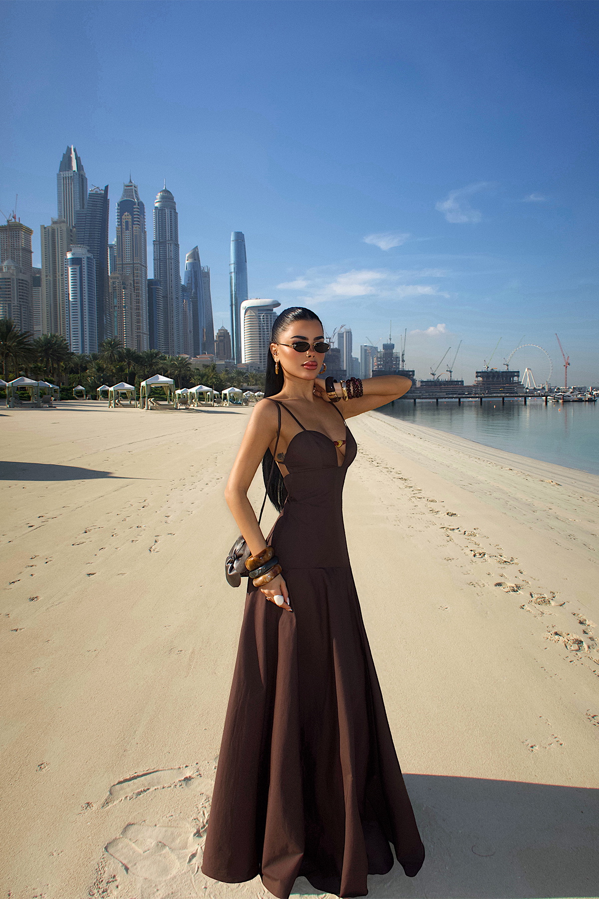 Minimal tasarımı ve göğüs kısmındaki boncuk detayıyla öne çıkan bu uzun elbise, sade şıklığı güçlü bir siluetle buluşturur. İnce askılı üst formu omuz hattını zarif şekilde vurgularken, belden aşağı doğru genişleyen etek kesimi akıcı ve dengeli bir görünüm sunar.
