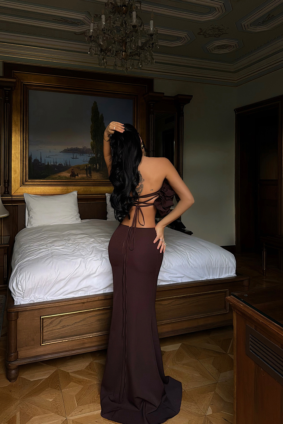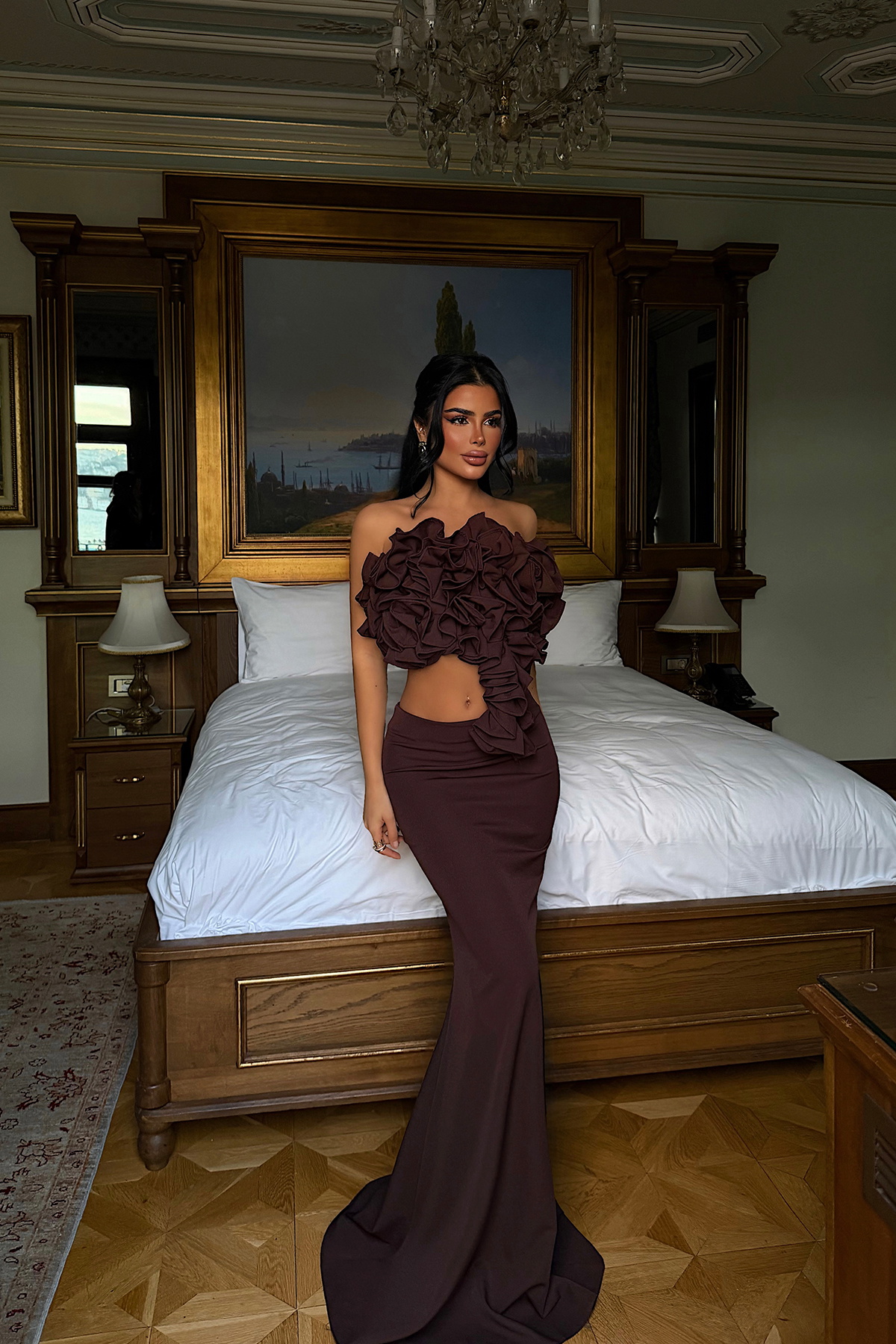Fırfır detaylı crop üst ve yüksek bel etekten oluşan takım, heykelsi formu ve dikkat çekici tasarımıyla güçlü bir siluet sunar. Doku ve hacim kazandıran üst parça iddialı bir görünüm yaratırken, sade etek tasarımı takımı dengeler. Özel davetler ve şık kombinler için modern ve çarpıcı bir tercihtir.