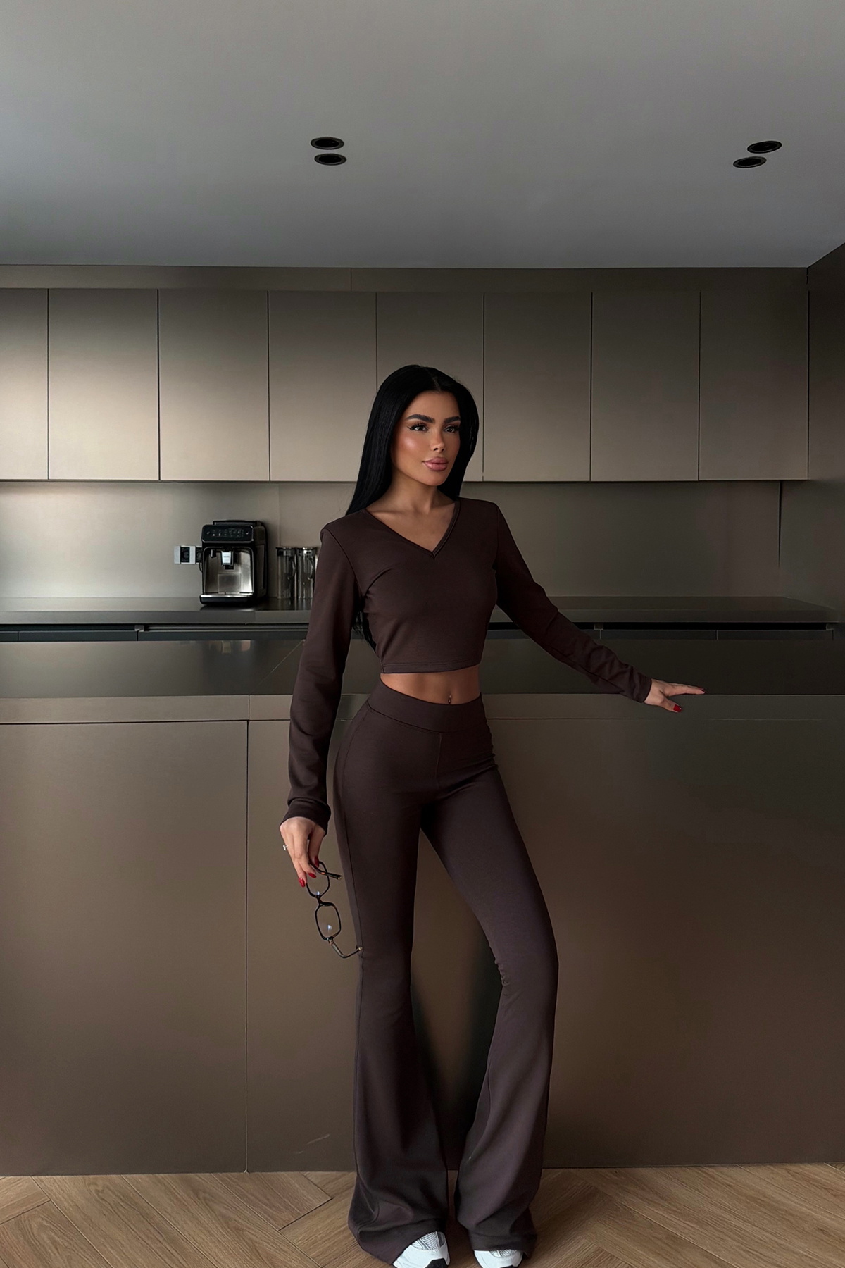 Bu Acı Kahve İspanyol paça takım, feminen bir görünüm arayanlar için ideal. Hafif ve akıcı kumaşı sayesinde gün boyu rahatlık sağlarken, geniş paça pantolon zarif bir siluet oluşturur. Üst parça sade ve modern bir kesime sahip; açık pembe tonu ile bahar ve yaz şıklığını yansıtır.
