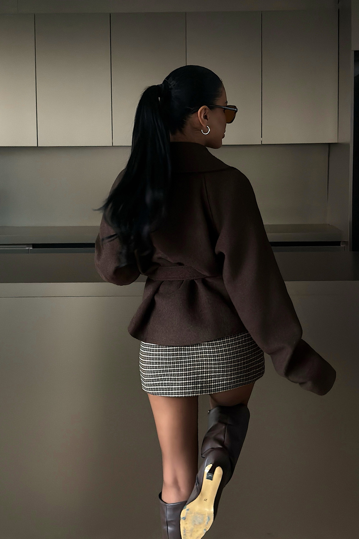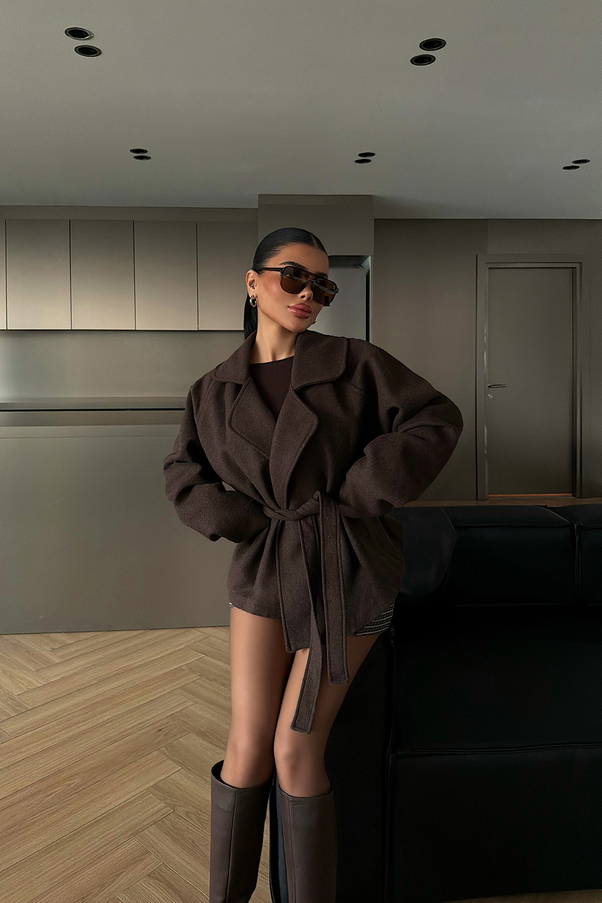 Belden bağlamalı tasarımı ve tok dokulu yapısıyla öne çıkan kaban, modern ve güçlü bir siluet sunar. Geniş yaka formu şık bir duruş sağlarken, rahat kesimi sayesinde şehir stilinde hem günlük hem de şık kombinlere kolayca uyum sağlar.