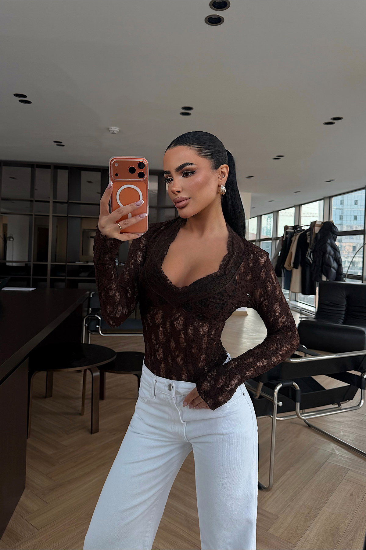 Acı Kahve Transparan Dantel Bluz ATE-4874