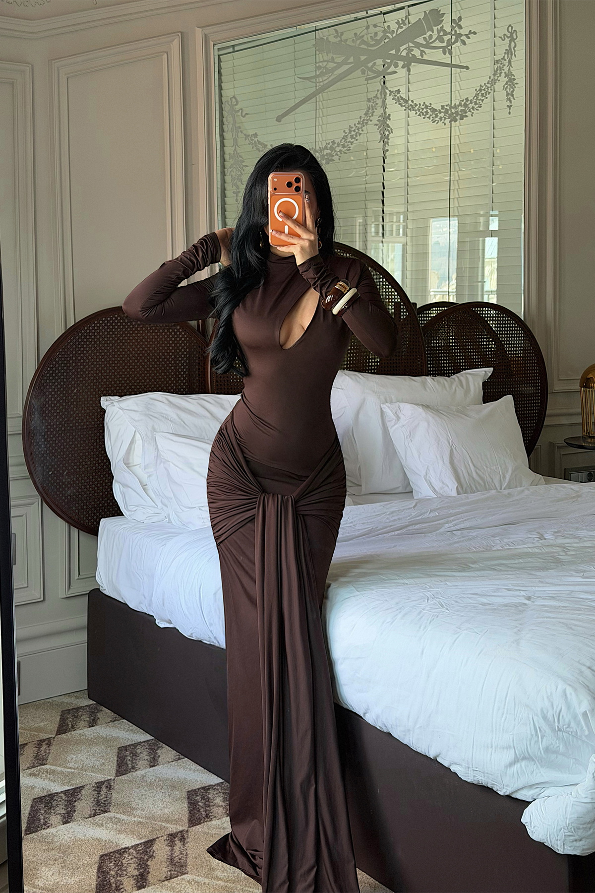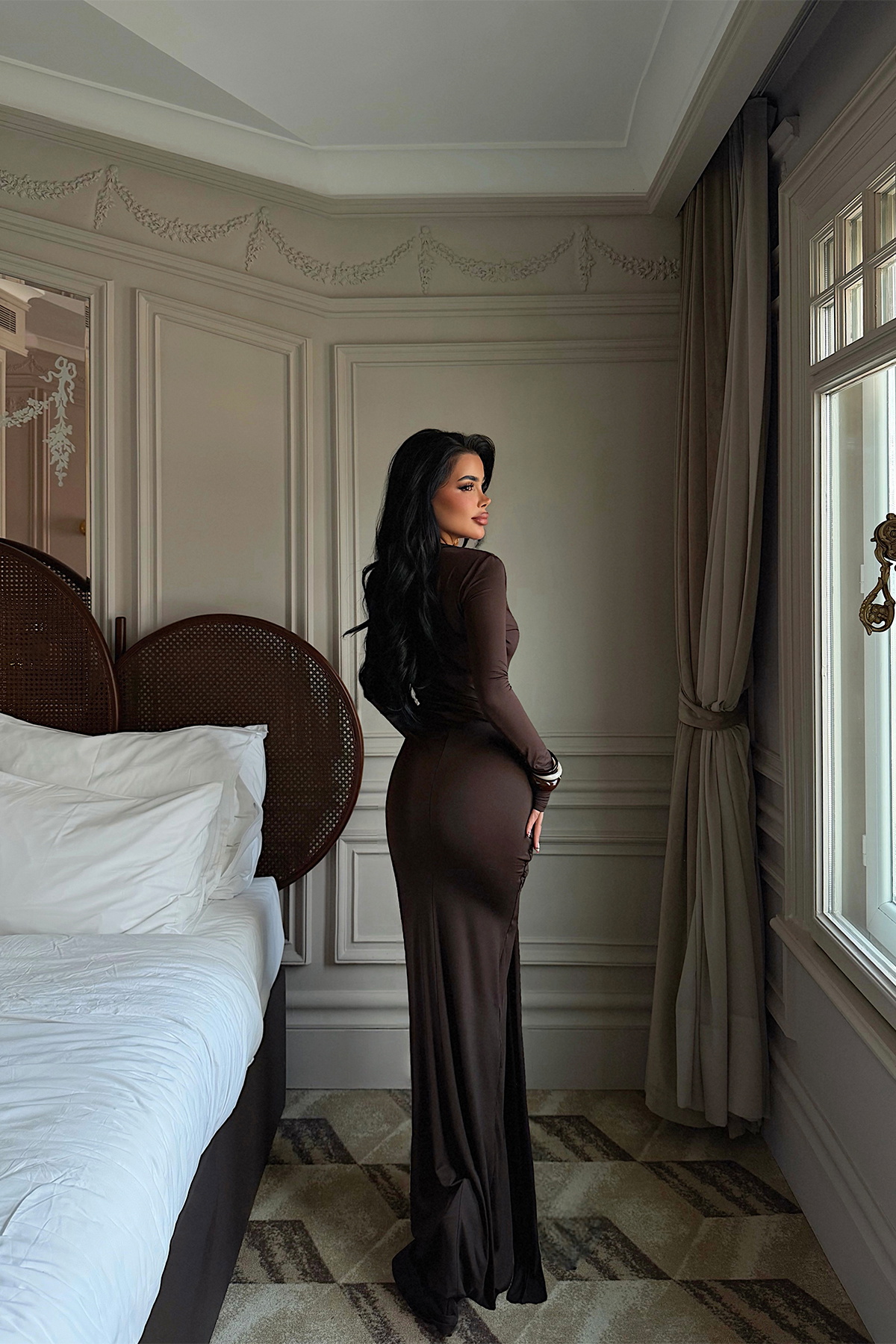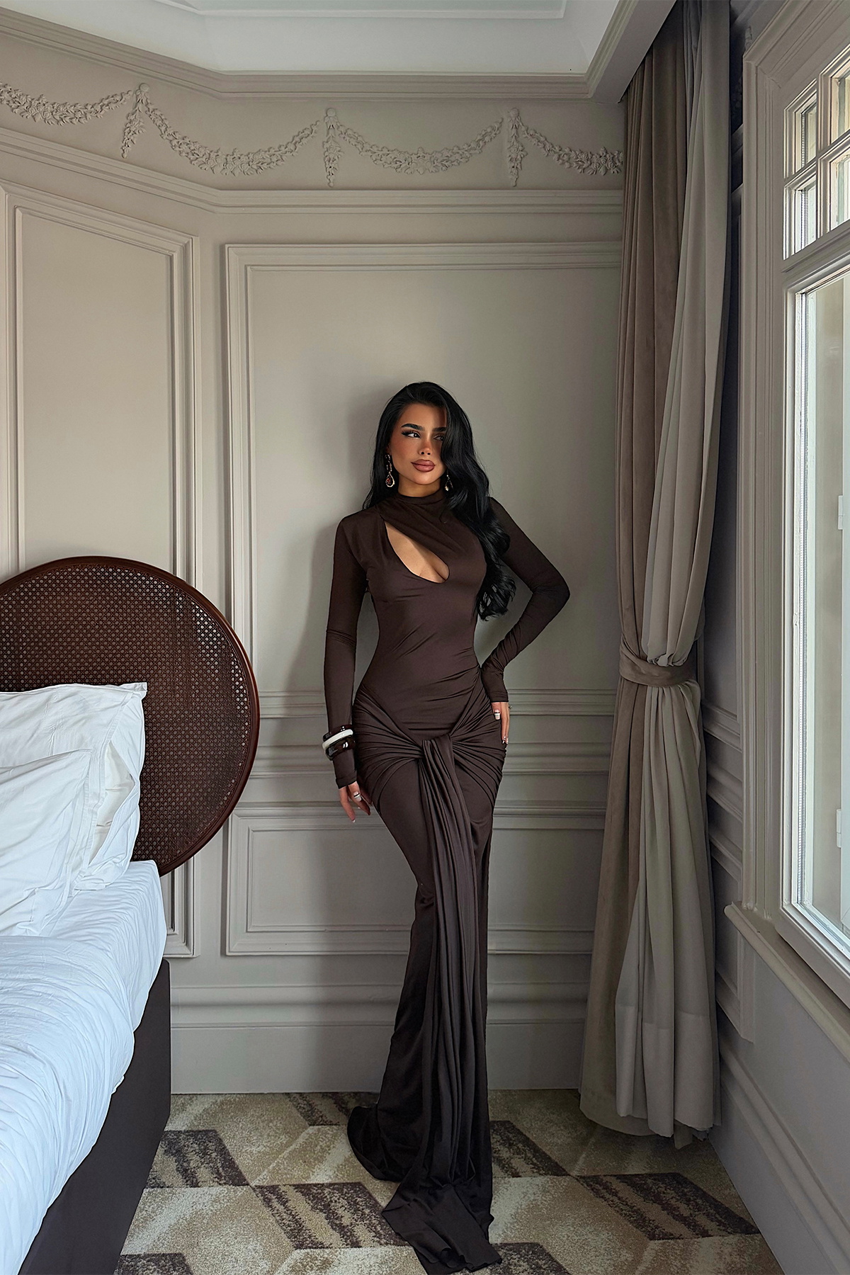 Vücuda oturan formu ve bel kısmındaki detayıyla feminen bir siluet sunan uzun elbise, göğüs dekoltesiyle modern ve iddialı bir görünüm kazandırır.