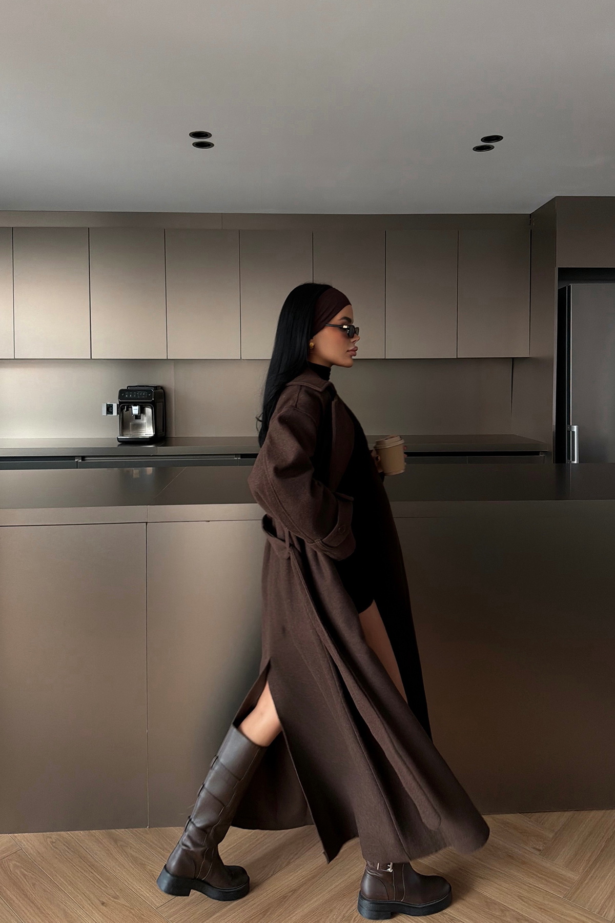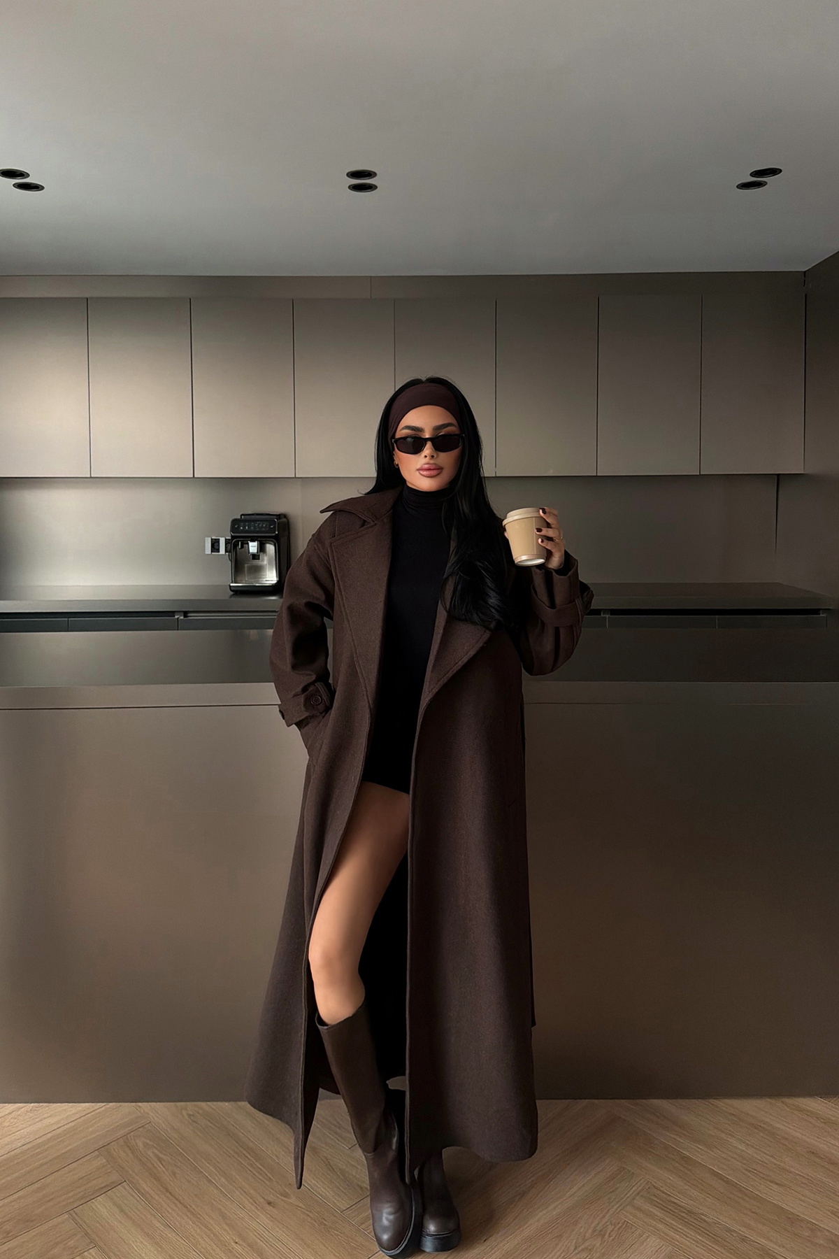Zarif acı kahve tonuyla sunulan bu uzun kaban, klasik hacimli formu ve konforlu kesimiyle stilinizi gün boyu tamamlar. Diz altı uzunluğu, net çizgileri ve sıcak renk paleti sayesinde hem şehir stilinde hem de ofis kombinlerinde ön plana çıkar.