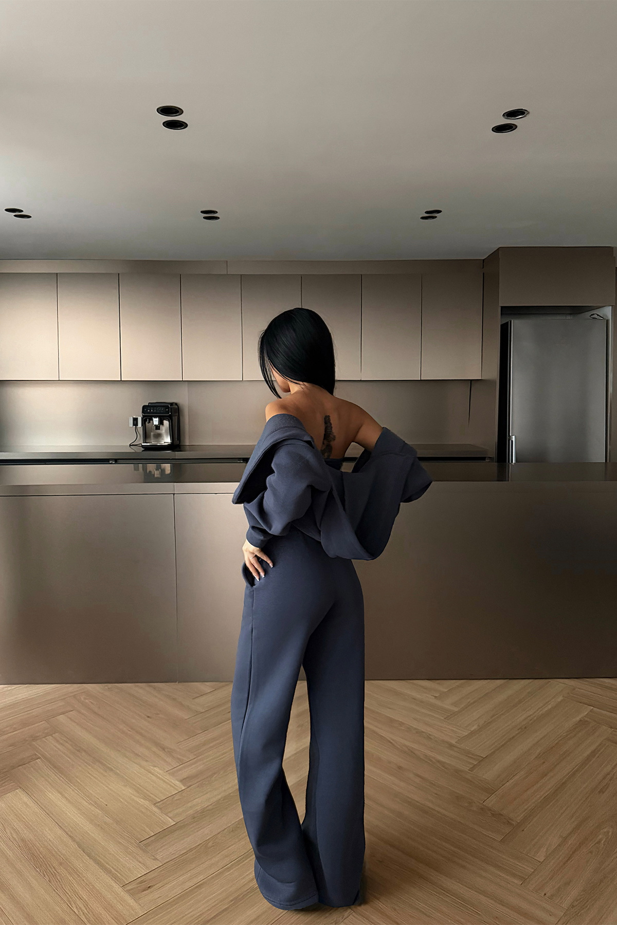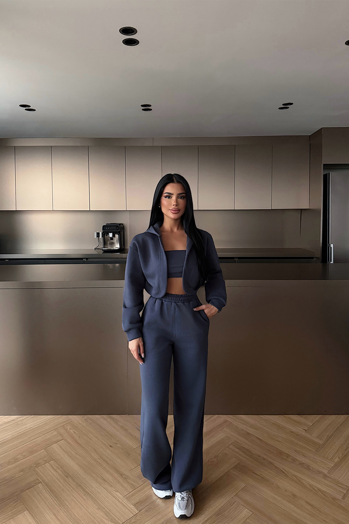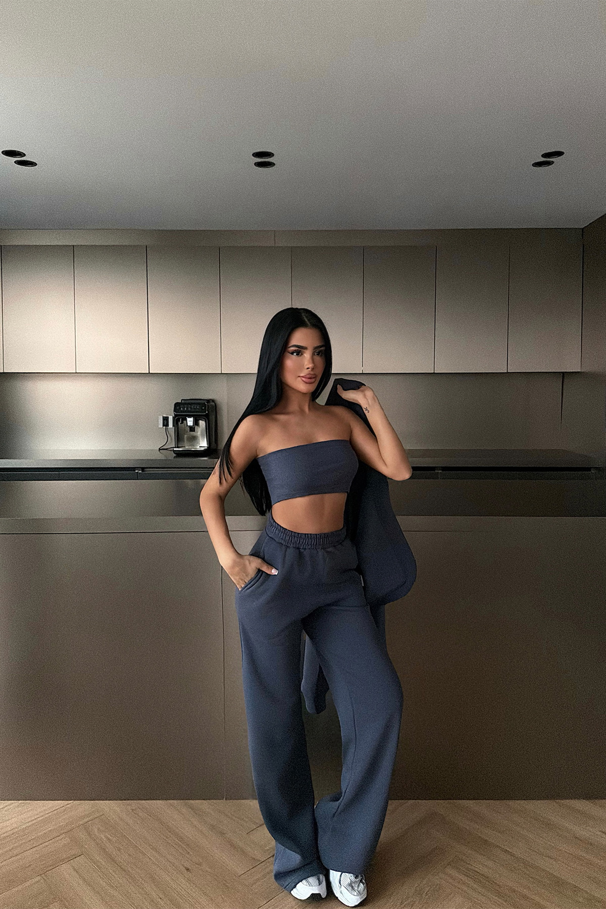 3 iplik kumaştan üretilen bu üçlü takım; crop hırka, büstiyer ve geniş paça pantolondan oluşan modern bir kombin sunar. Tok ve kaliteli duruşa sahip 3 iplik kumaş yapısı sayesinde hem konforlu hem de şık bir görünüm sağlar.
