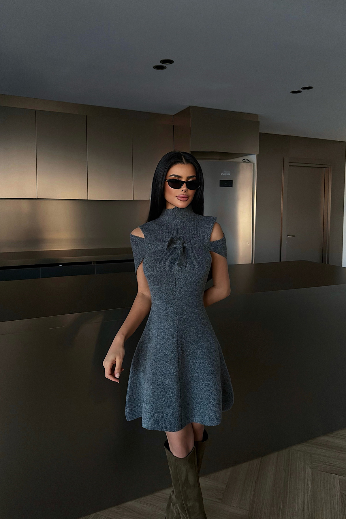 Kolsuz tasarımı ve A-kesim formuyla öne çıkan midi elbise, sade ve zarif bir siluet sunar. Tok dokulu kumaşı formunu korurken, minimal kesimi sayesinde şehir stilinde ve günlük şık kombinlerde rahatlıkla tercih edilebilir.