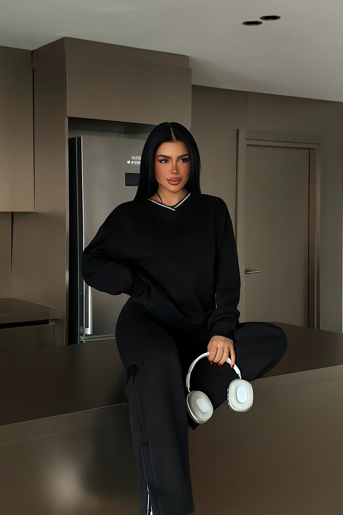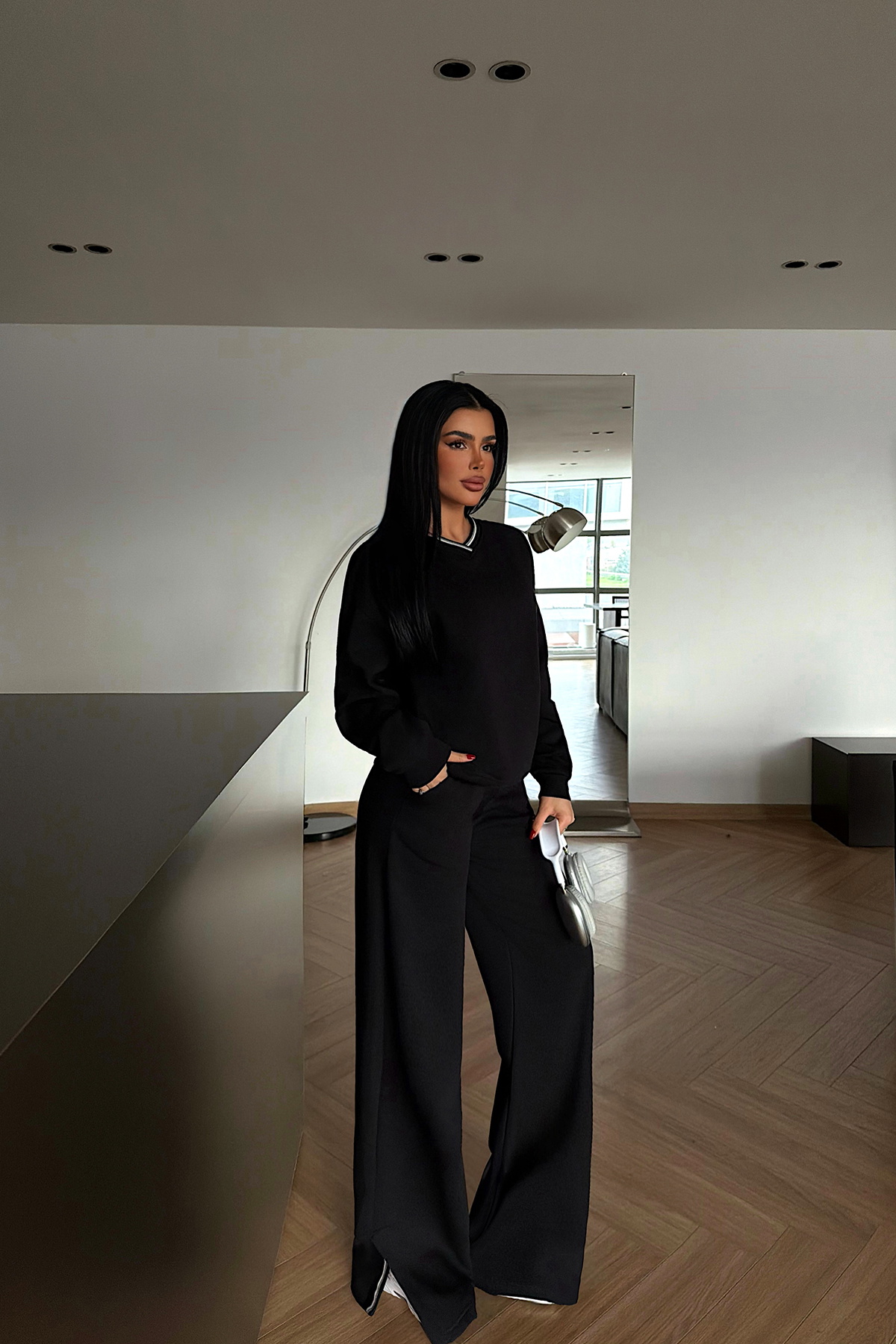 Yumuşak dokulu kumaşı ve sade tasarımıyla konforu ön plana çıkarır. Üst parça, minimal V yaka formu ve rahat kesimiyle doğal bir duruş sergiler. Alt parça ise geniş paça yapısı ve akıcı görünümüyle takımın bütünlüğünü tamamlar. Esnek bel detayı, temiz dikişleri ve siyah tonu sayesinde takım hem düzenli hem modern bir siluet sunar.