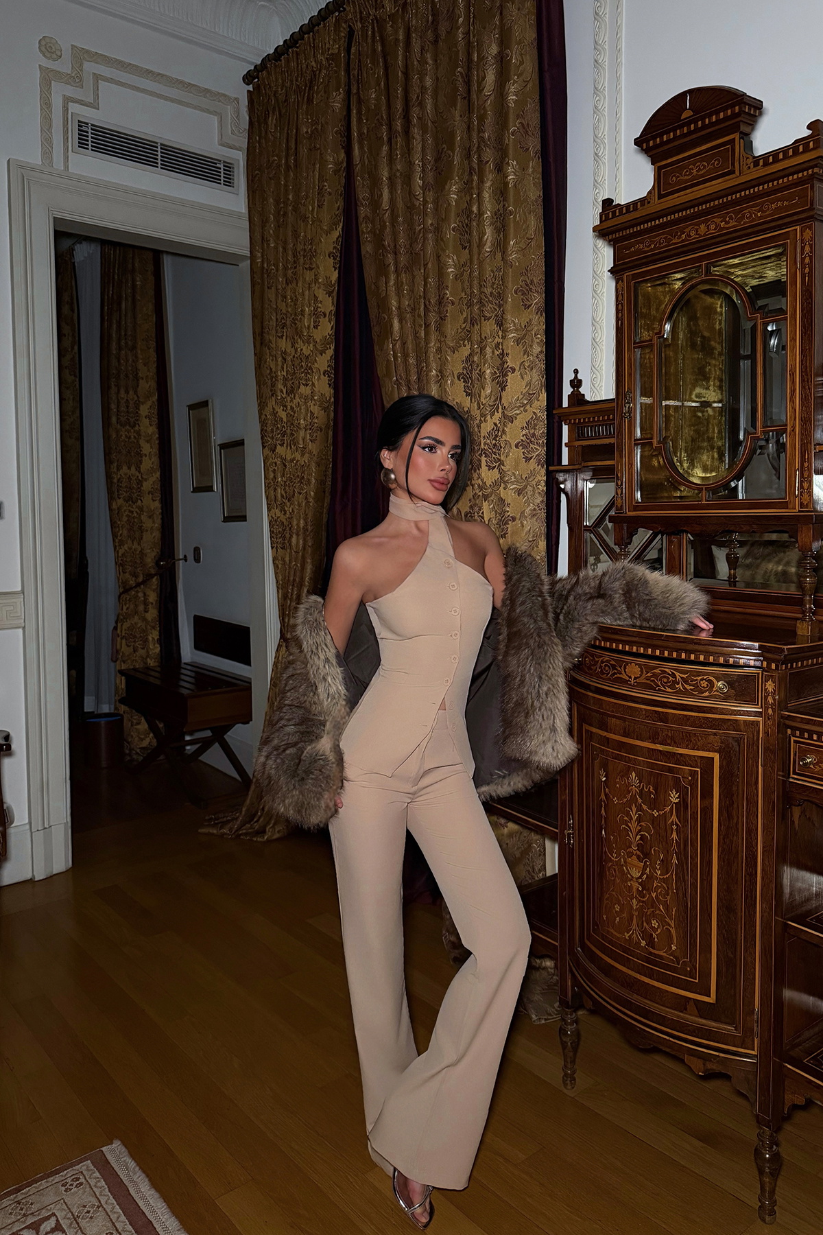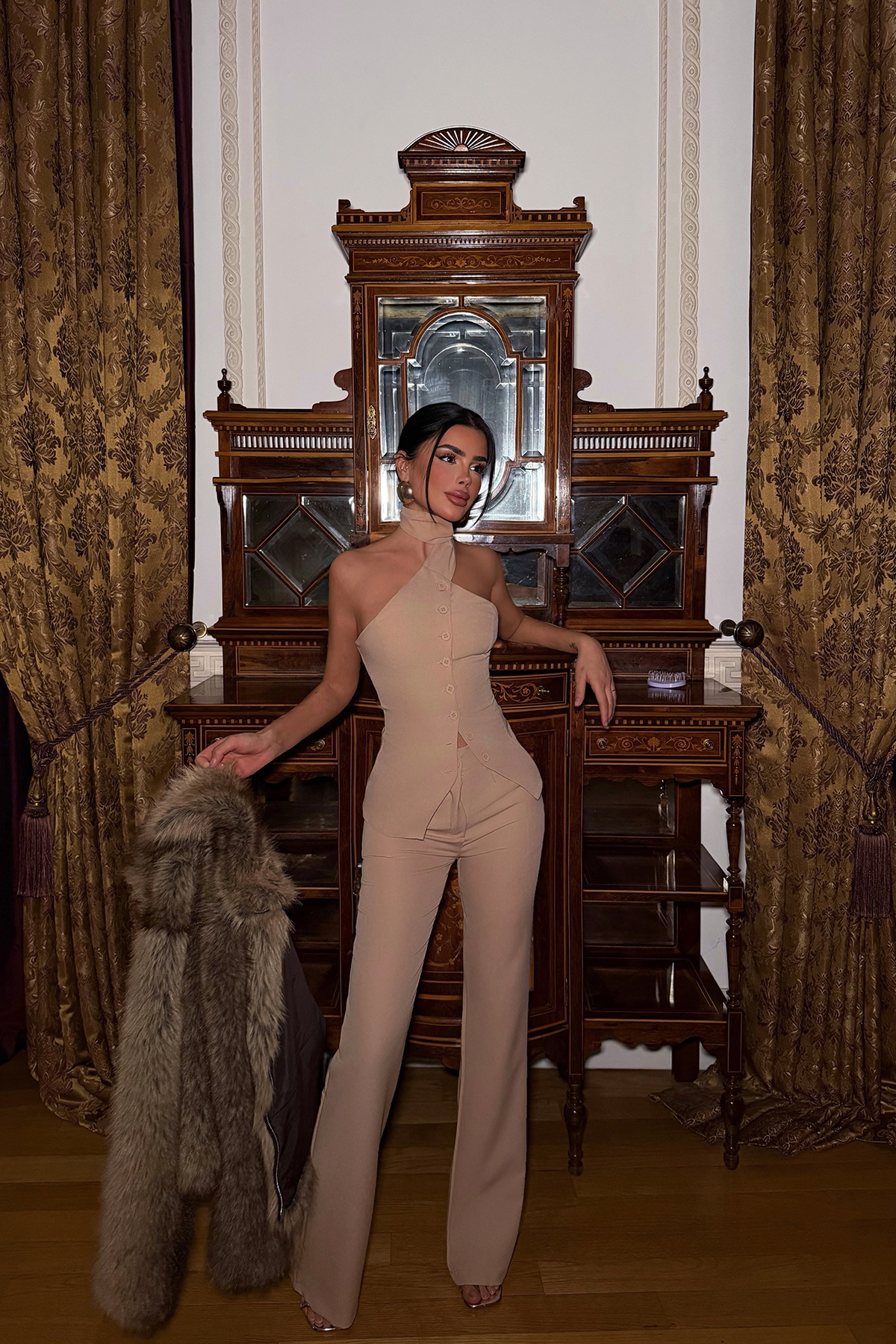 Halter yaka üst ve pantolondan oluşan bu takım, vücudu saran formu ile feminen ve iddialı bir duruş sunar. Ön kısmındaki düğme detayları tasarıma modern bir hava katarken, pantolonun bol paça kesimi silueti daha uzun gösterir.