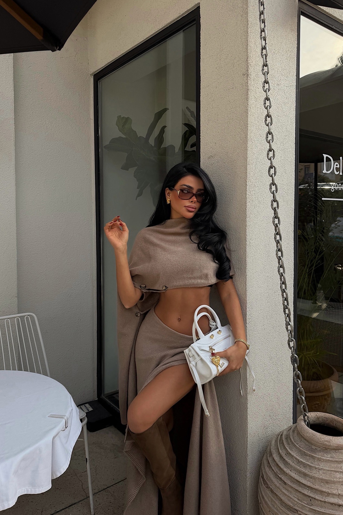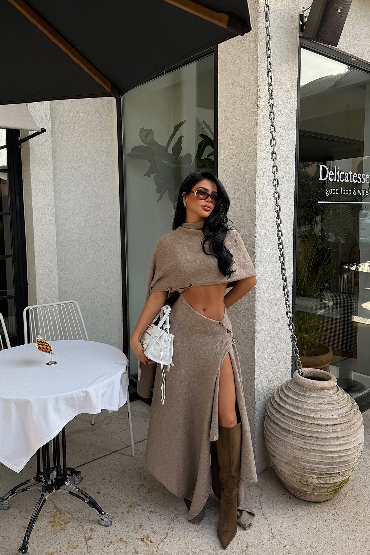 Bu takım; bej tonlu, yumuşak dökümlü kumaştan oluşan modern iki parçalı bir settir. Asimetrik kesimi ve kısa formuyla minimal ama dikkat çekici bir siluet oluşturur. Alt etek ise yüksek bel, çapraz bağlama detayı ile öne çıkar. Derin yan yırtmacı, eteğe akışkan bir görünüm kazandırırken yürüyüşte hareketli bir duruş sağlar.