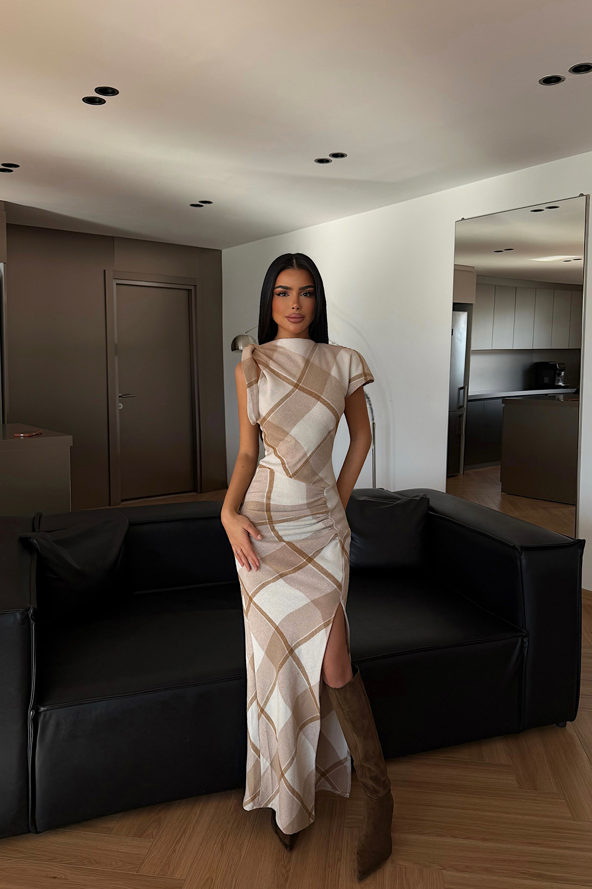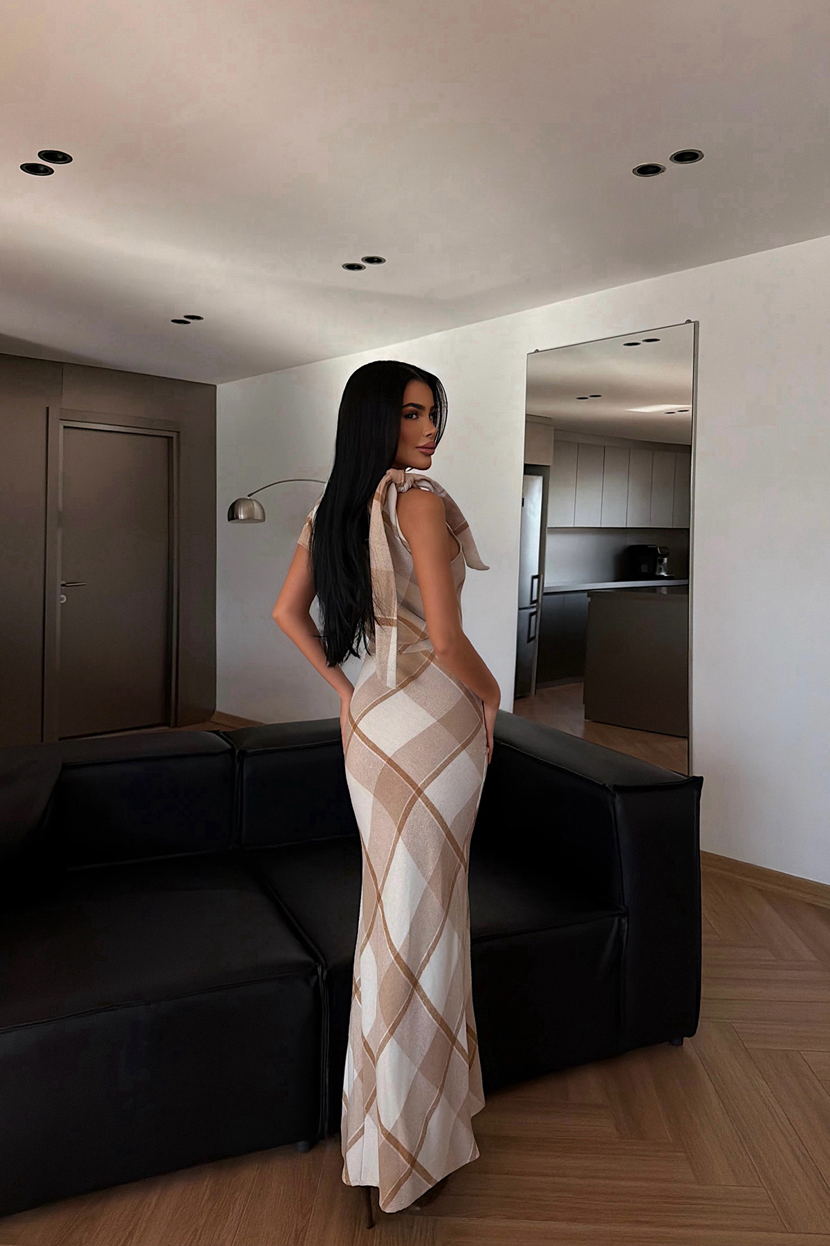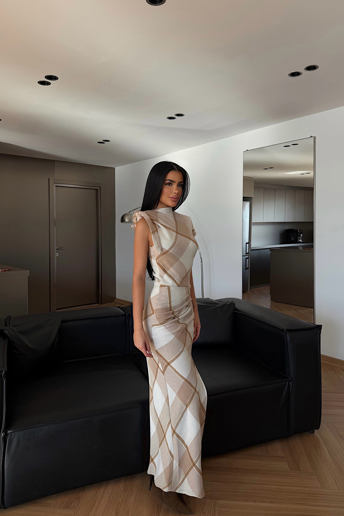 Ekose desenli yapısı ve vücuda oturan kesimiyle öne çıkan uzun elbise, kolsuz tasarımı ve ön yırtmaç detayıyla zarif ve feminen bir siluet sunar. Akıcı etek formu elbiseye hareket kazandırırken, sade ve şık duruşu sayesinde şehir stilinden özel davet kombinlerine kadar rahatlıkla tercih edilebilir.