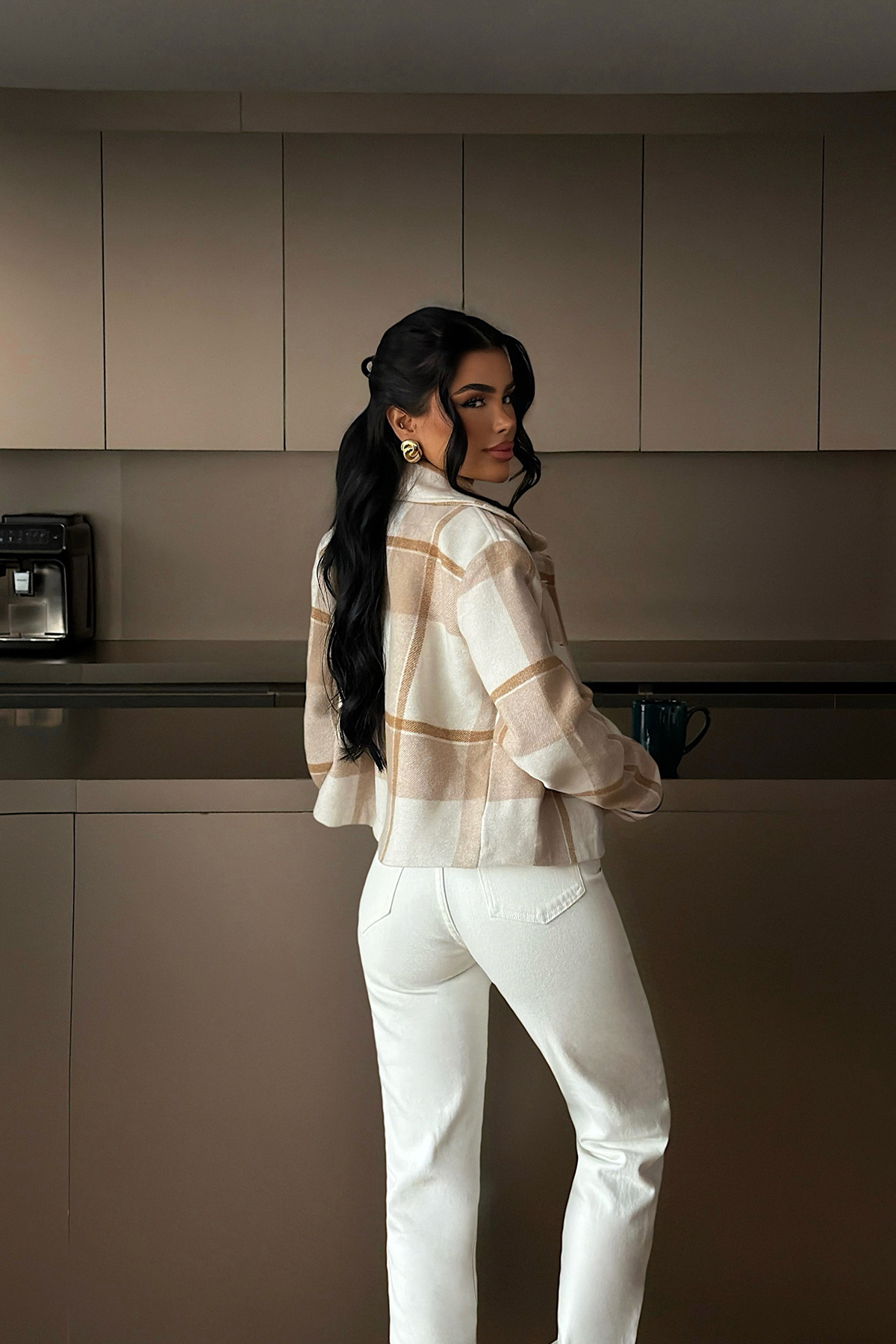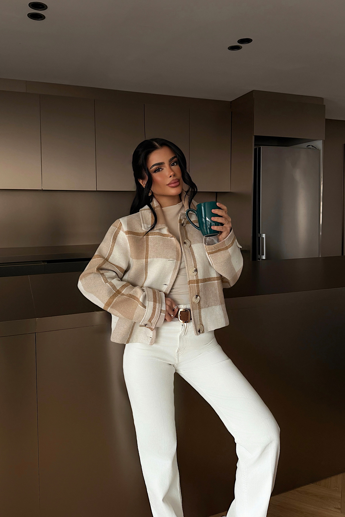 Ekose desenli yapısı ve kısa kesimiyle öne çıkan ceket, tok duruşu sayesinde modern ve net bir siluet sunar. Düğmeli tasarımı ve rahat kalıbı ile günlük şehir kombinlerinden şık stillere kadar çok yönlü kullanım sağlar.