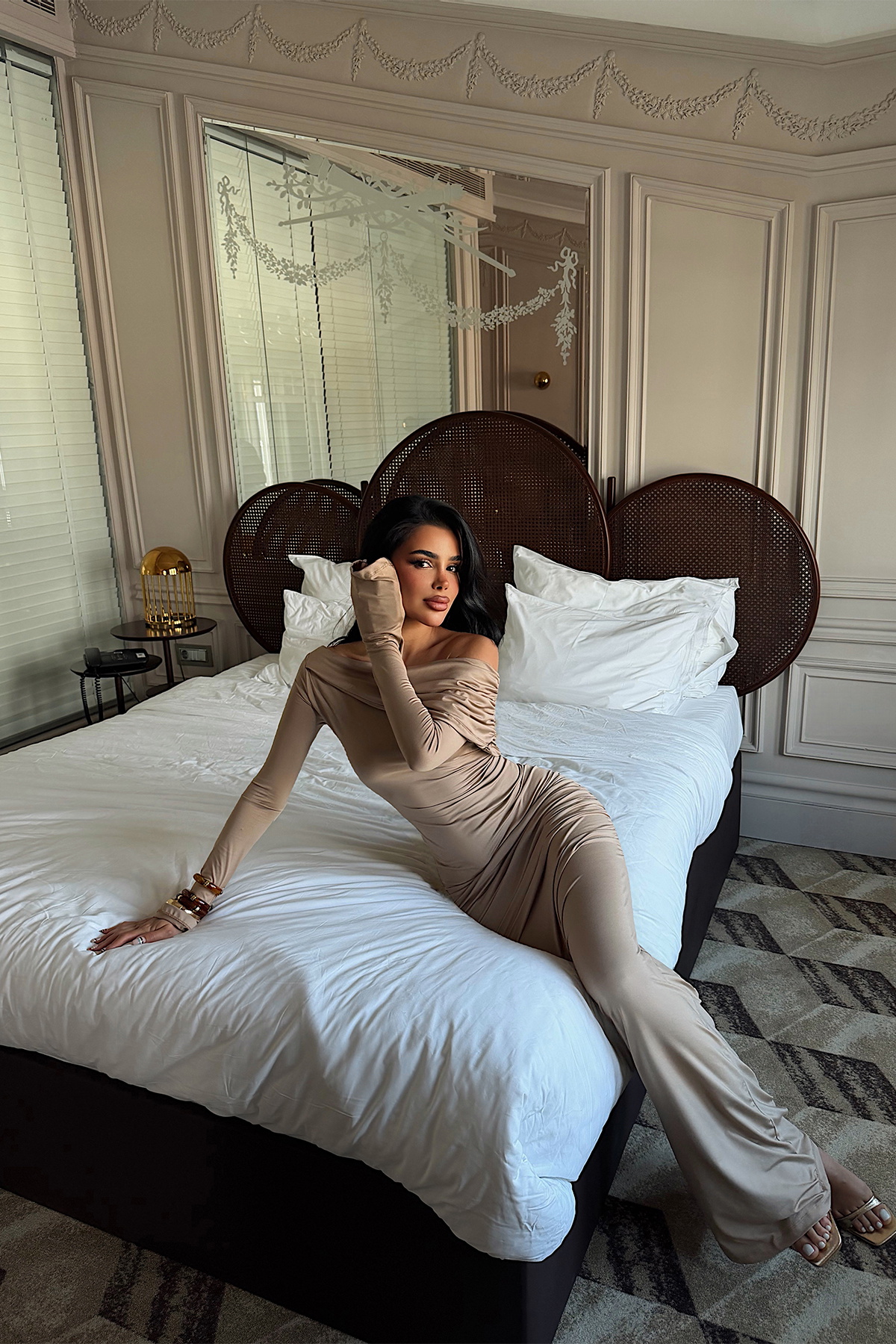 Omuzları açık bırakan kayık yaka kesimi ve vücuda oturan formuyla öne çıkan uzun elbise, zarif ve feminen bir siluet sunar. Drapeli yapısı bedeni kusursuz şekilde sararken, uzun kollu tasarımı elbiseye sofistike bir şıklık kazandırır. Özel davetler ve gece organizasyonları için etkileyici bir tercihtir.