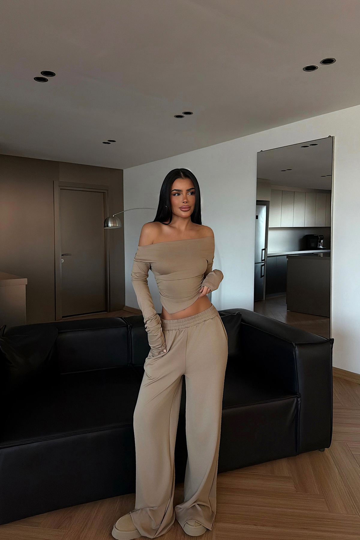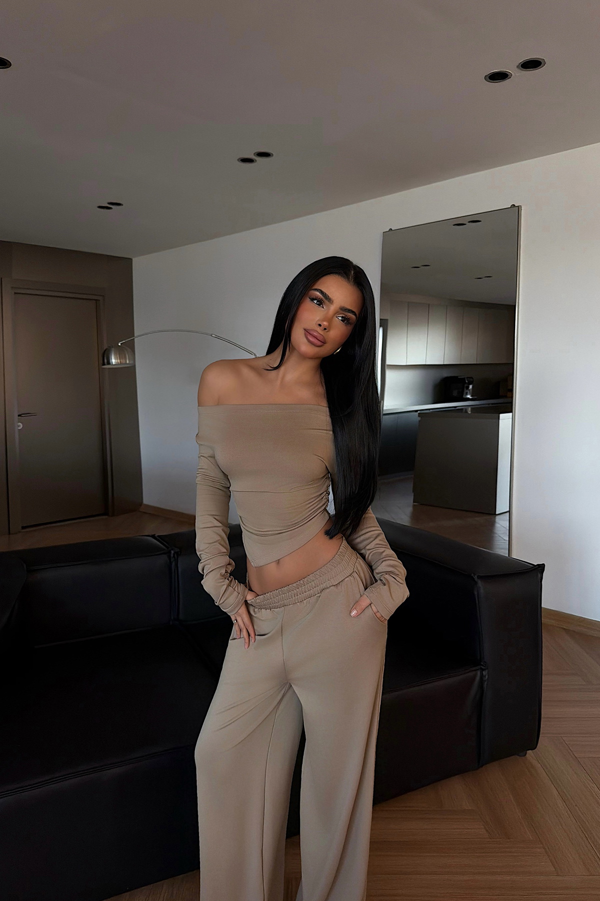 Omuzları açık bırakan asimetrik crop üst ve rahat kesim pantolondan oluşan takım, modern ve feminen bir siluet sunar. Yumuşak dokulu kumaşı konfor sağlarken, vücuda oturan üst formu ile dengeli ve şık bir görünüm oluşturur.