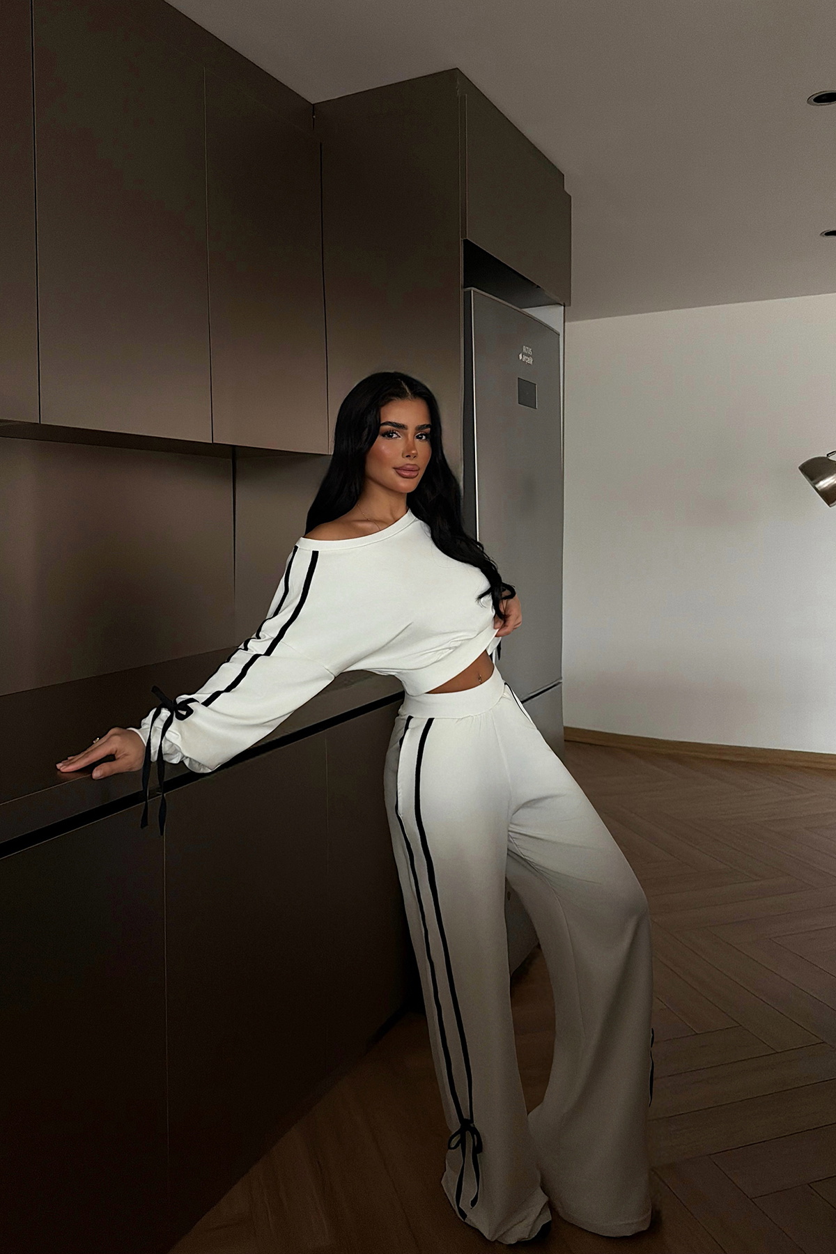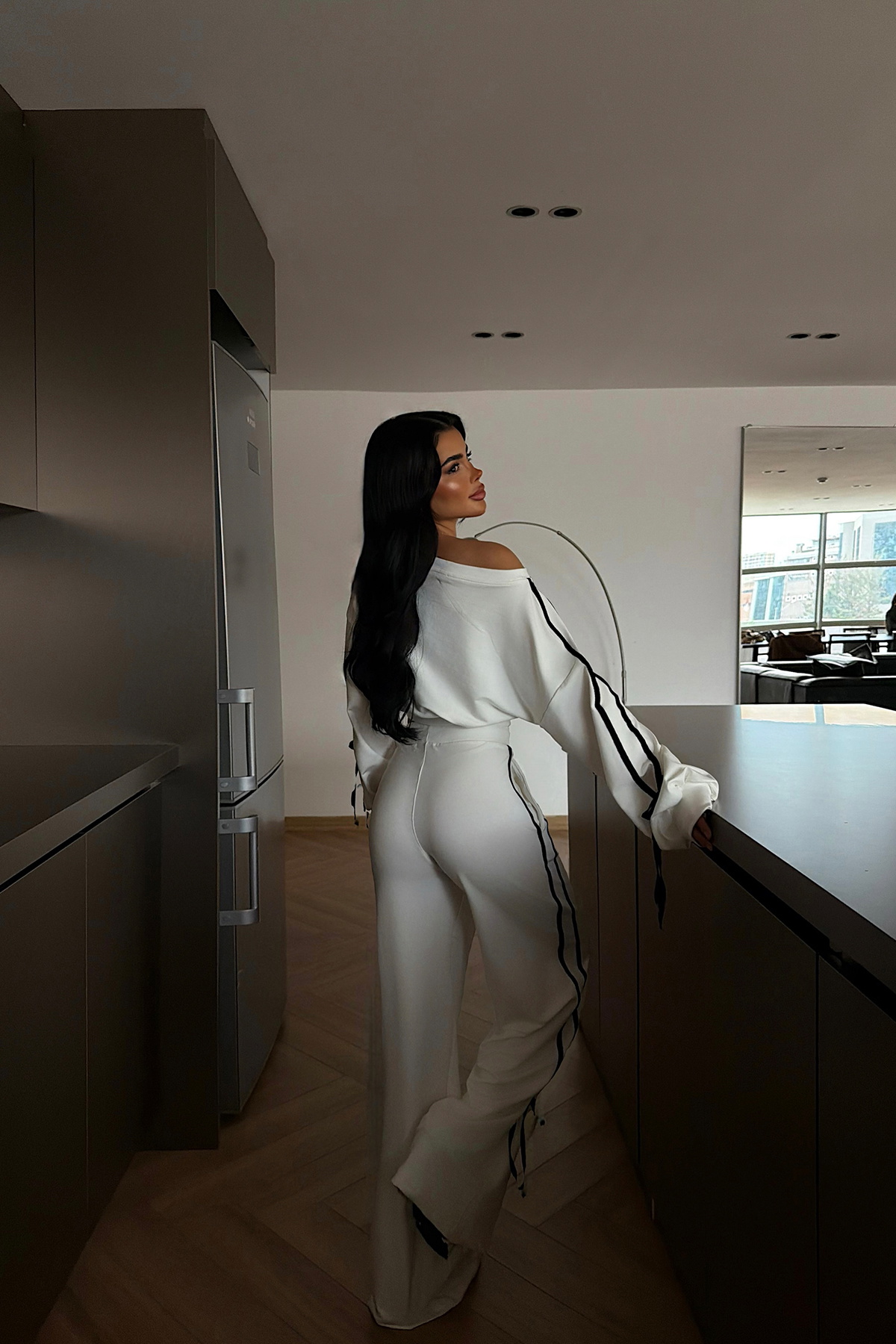 Yan şerit ve bağcık detaylarıyla öne çıkan eşofman takım, rahat kesimi sayesinde modern ve dengeli bir siluet sunar. Yumuşak dokulu örme kumaş yapısı gün boyu konfor sağlarken, pantolon paçasındaki bağcık detayı tasarıma hareket katar. Günlük kullanım ve rahat kombinler için ideal bir tercihtir.