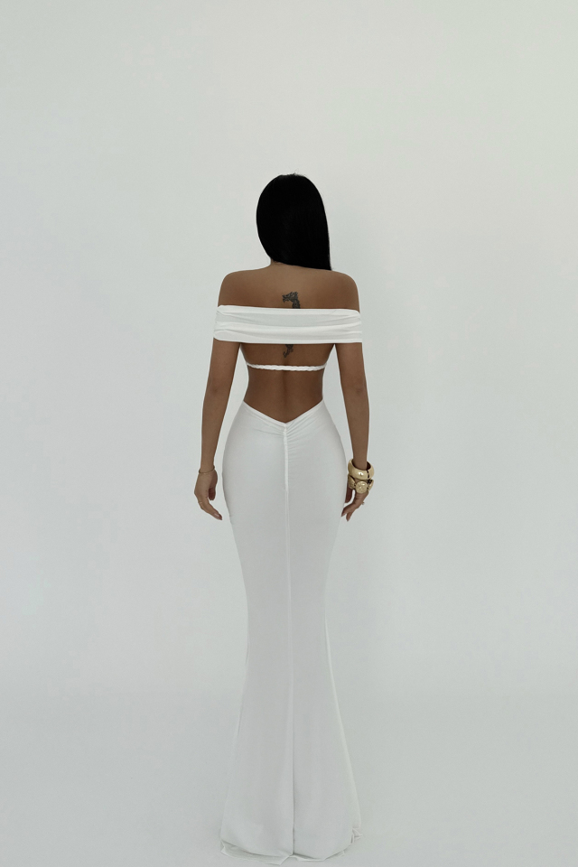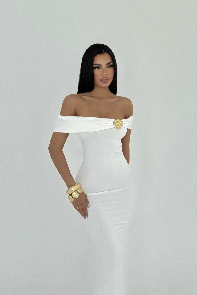 Beyaz Seridie Deniz Kabuğu Detaylı Uzun Elbise