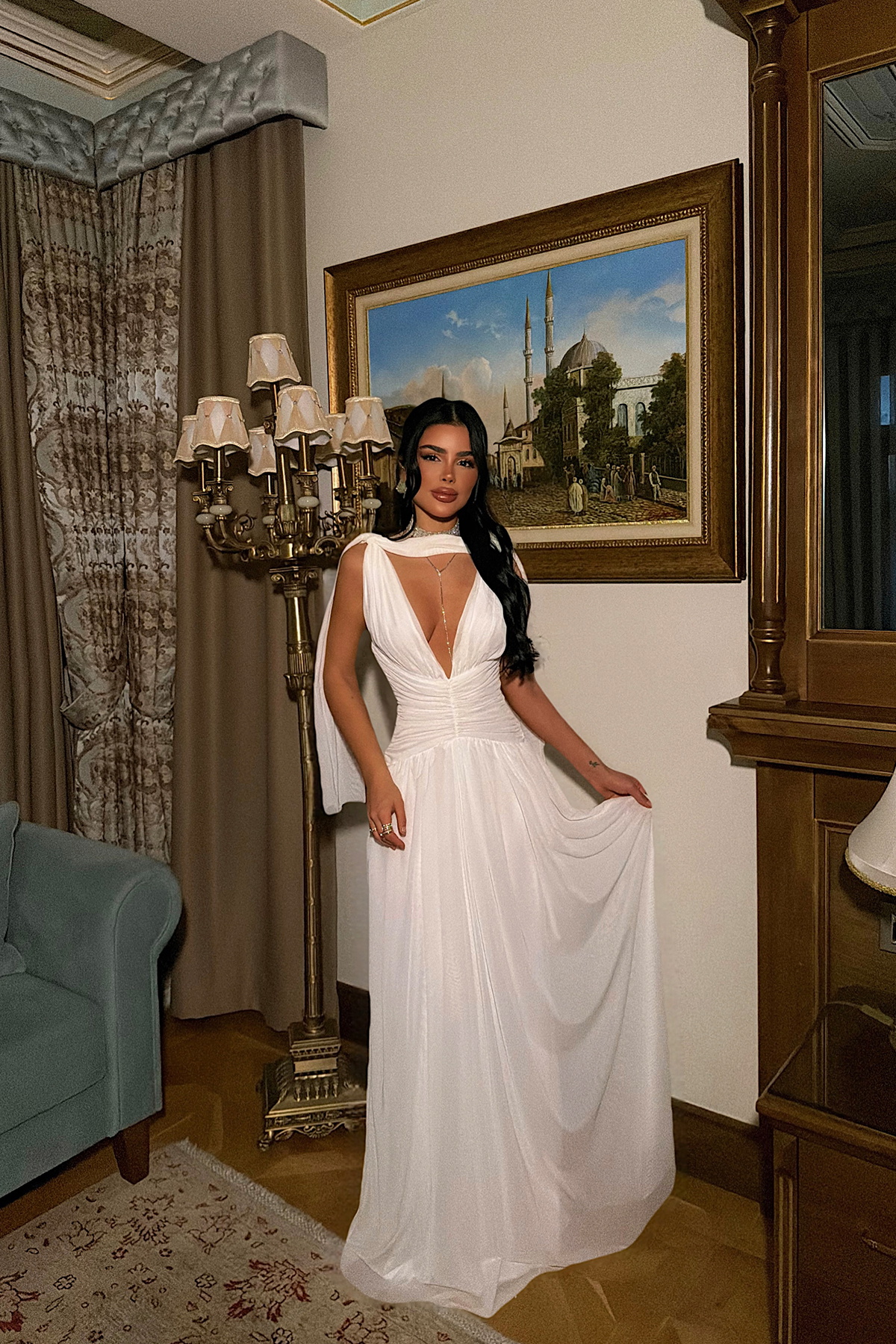 Beyaz tonuyla feminen ve zarif bir görünüm sunar. Elbise, büzgü detaylarıyla vücut hatlarını nazikçe vurgular. Kumaşı yumuşak, akışkan ve dökümlü bu sayede elbise, hem zarif duruşu hem de rahat hareket imkânı sağlar