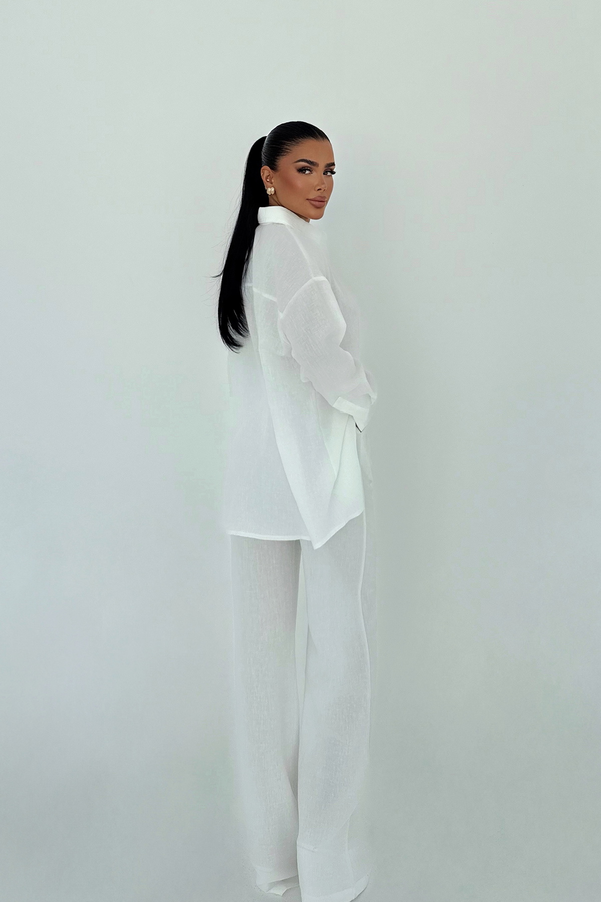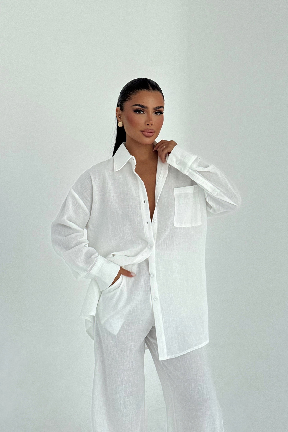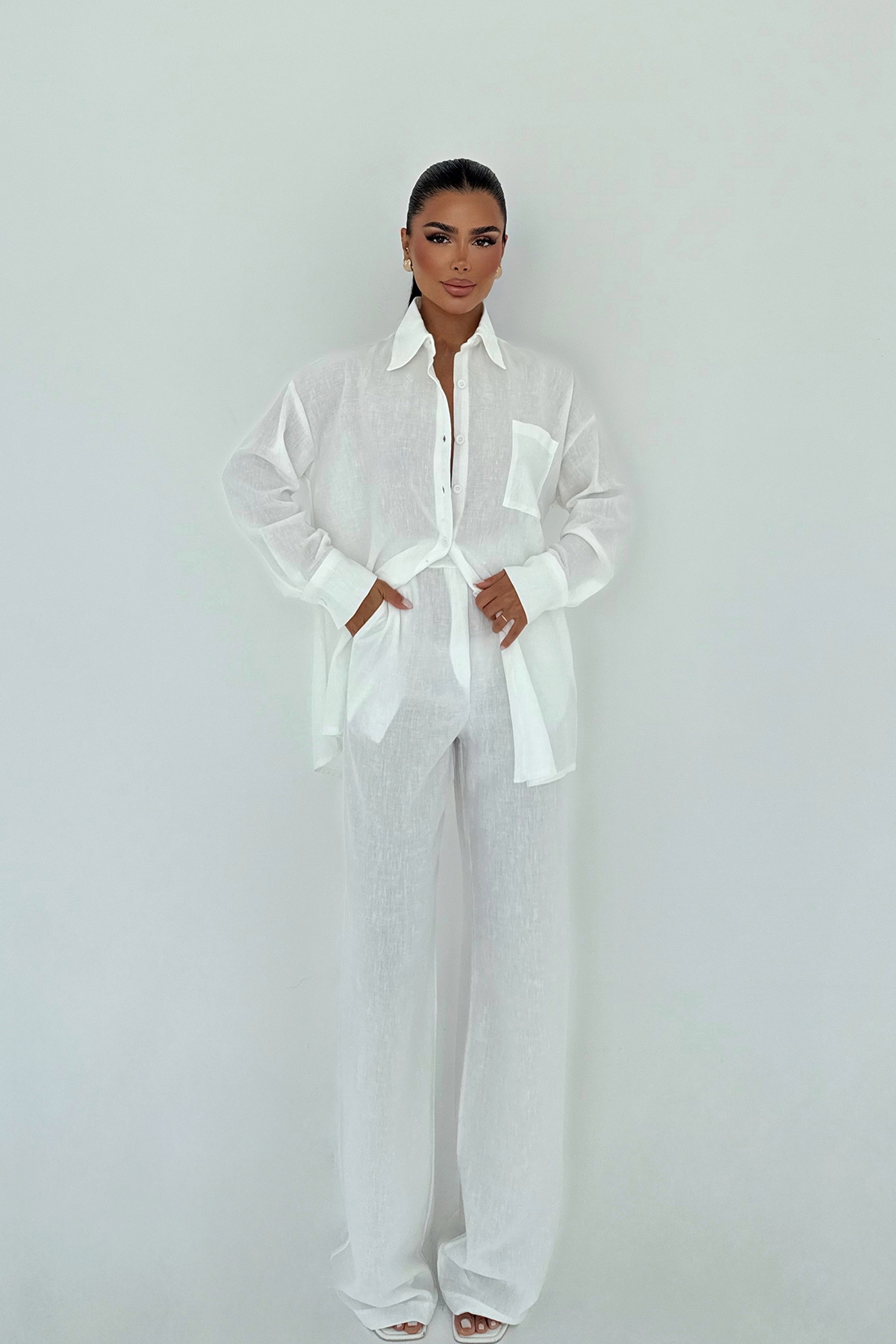 Beyaz Cep Detay Pantolonlu Takım