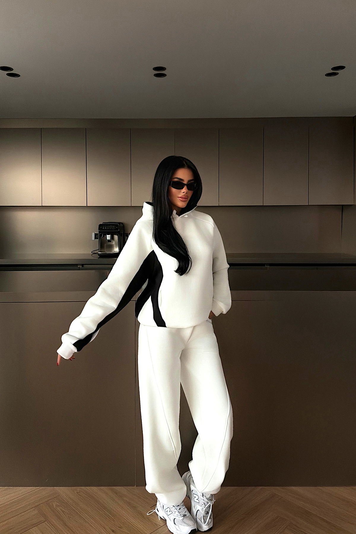 Beyaz zemin üzerine kontrast renk detaylarıyla modern ve dinamik bir görünüm sunar. Kapüşonlu üst kısmı, rahat kesimi ve yumuşak dokulu kumaşıyla öne çıkar. Alt bölümde sade formu, düz paça ve ideal bel kalıbı ile tamamlanır.