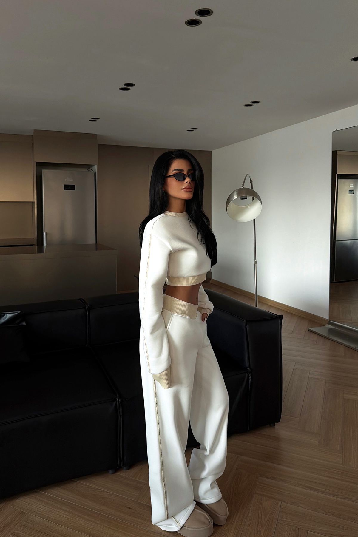 Temiz beyaz tonunun yanında yer alan çift renk detaylarıyla fark yaratan bu takım, minimalist ama dikkat çekici bir stil sunuyor. Üst kısmının sade kesimi ve alt pantolonundaki kontrast renk çizgileri sayesinde modern bir görünüm elde ediliyor.