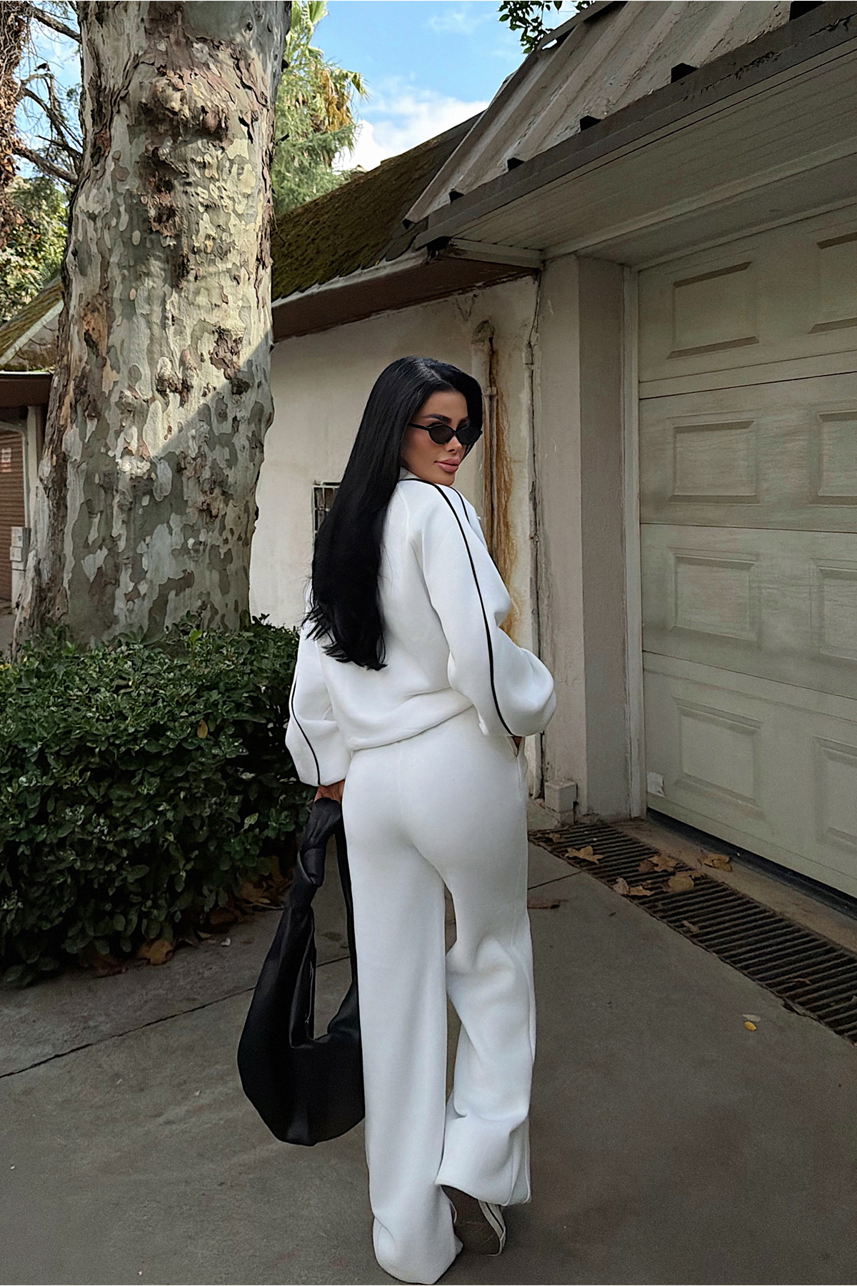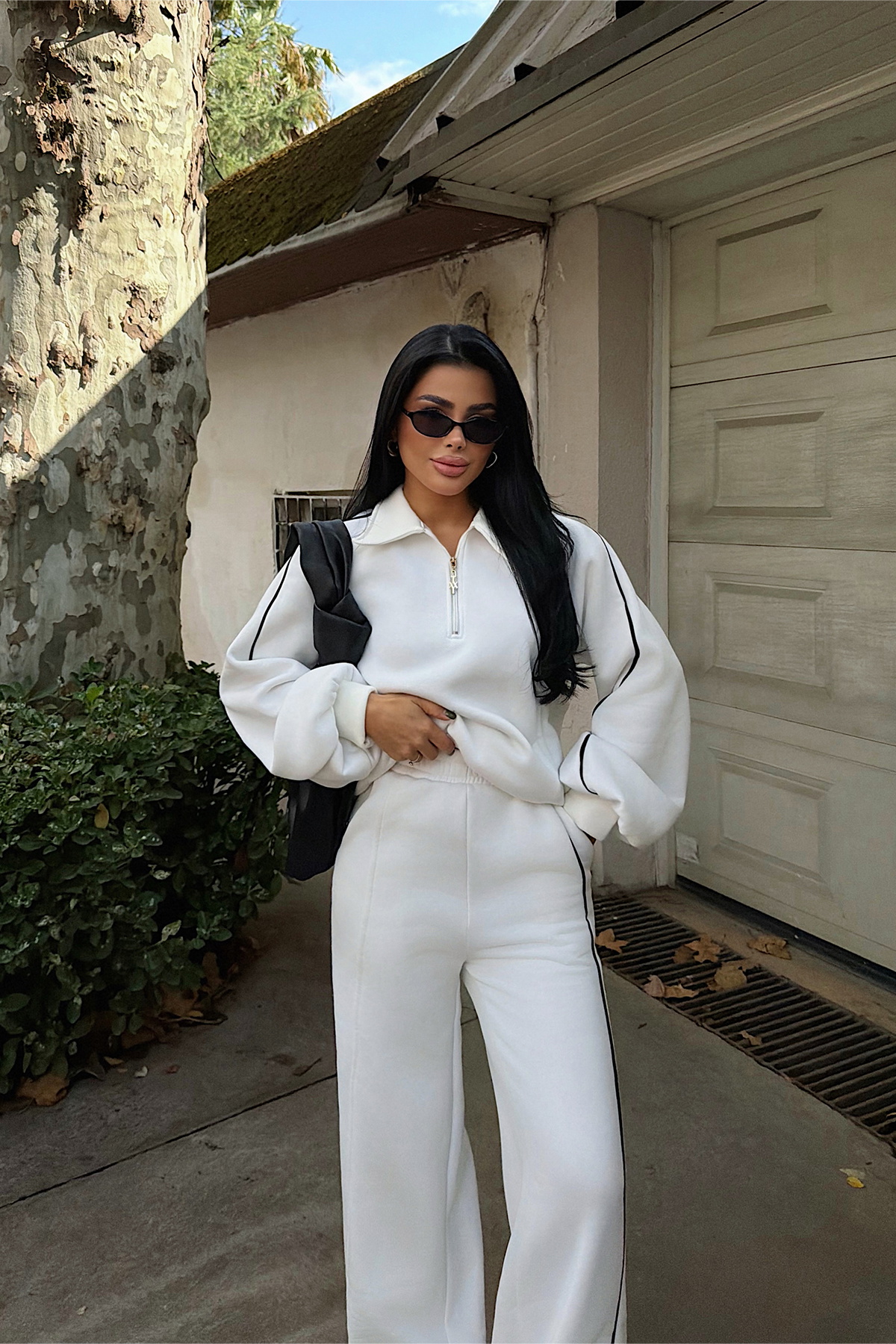 Beyaz tonunun zarafetini sportif detaylarla birleştiren Selita Eşofman Takımı, modern şehir stilin için ideal bir seçim. İnce çizgi vurguları ile sade görünümüne hareket katarken, konforlu kesimi ve kaliteli kumaşıyla gün boyu rahatlık sunar.