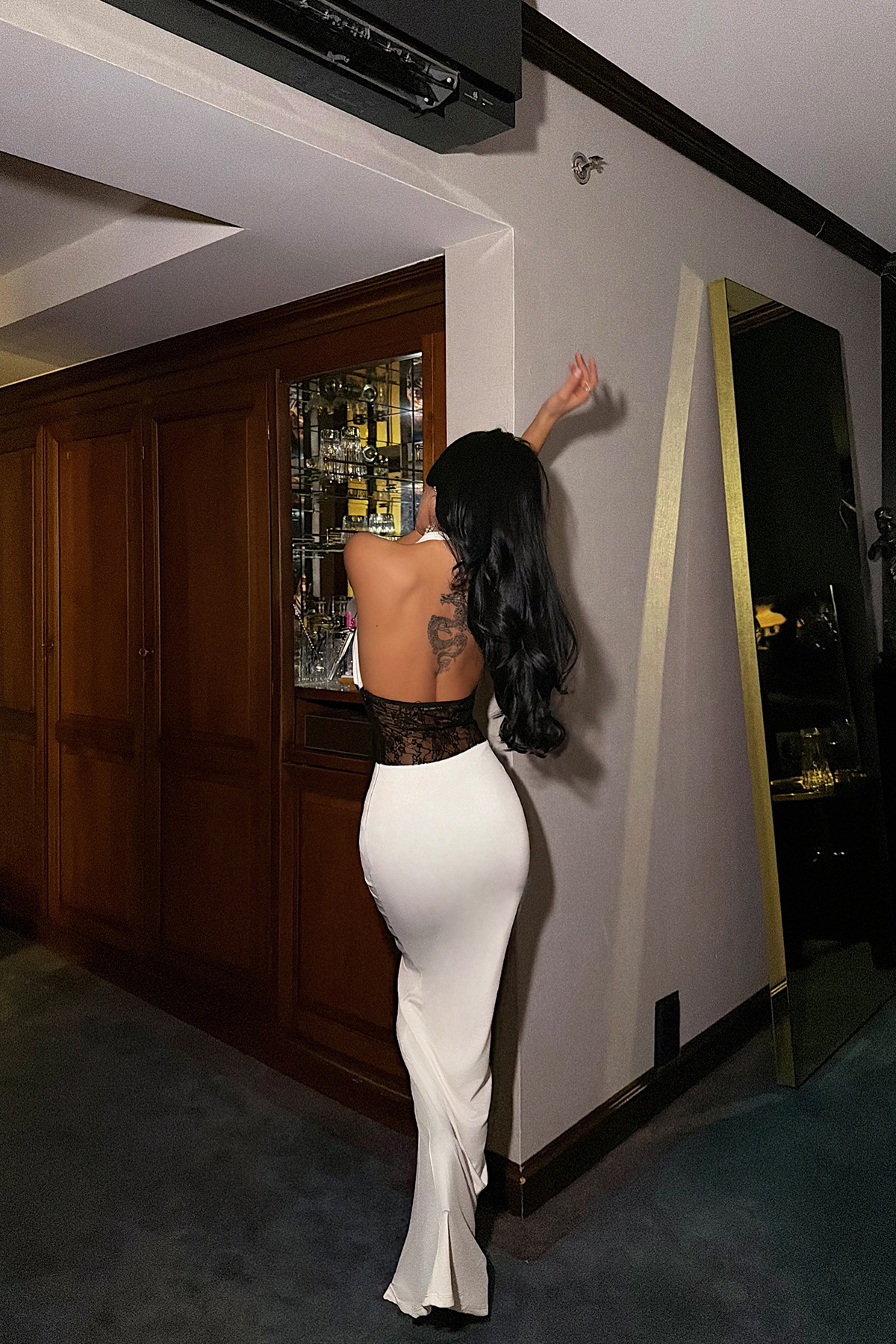 Boyundan bağlamalı yaka ve derin V kesimiyle öne çıkan uzun elbise, bel kısmındaki dantel detayla feminen ve iddialı bir siluet sunar. Akıcı etek formu vücuda zarif şekilde otururken, kontrast dokular tasarıma modern ve şık bir görünüm kazandırır. Özel davetler ve gece organizasyonları için etkileyici bir tercihtir.