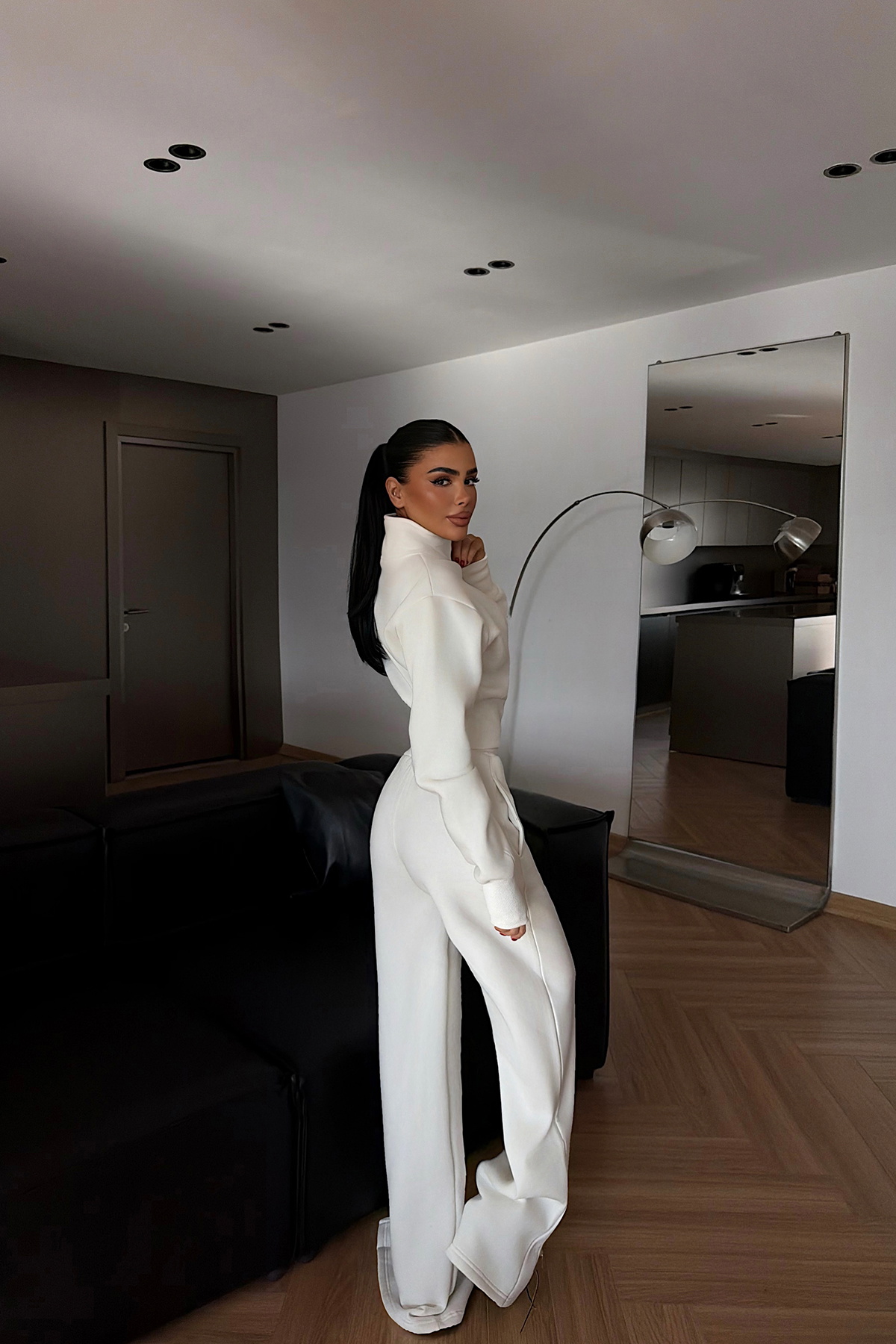 Yüksek yakalı üst parça, önden yer alan çift fermuar sayesinde tasarıma dinamik ve özgün bir görünüm kazandırır. Uzun kollu formu ve manşet detayları üst parçanın yapısını destekler. Pantolon ise yüksek bel formu ve düz paça kesimiyle takımla uyumlu, dengeli bir siluet sunar