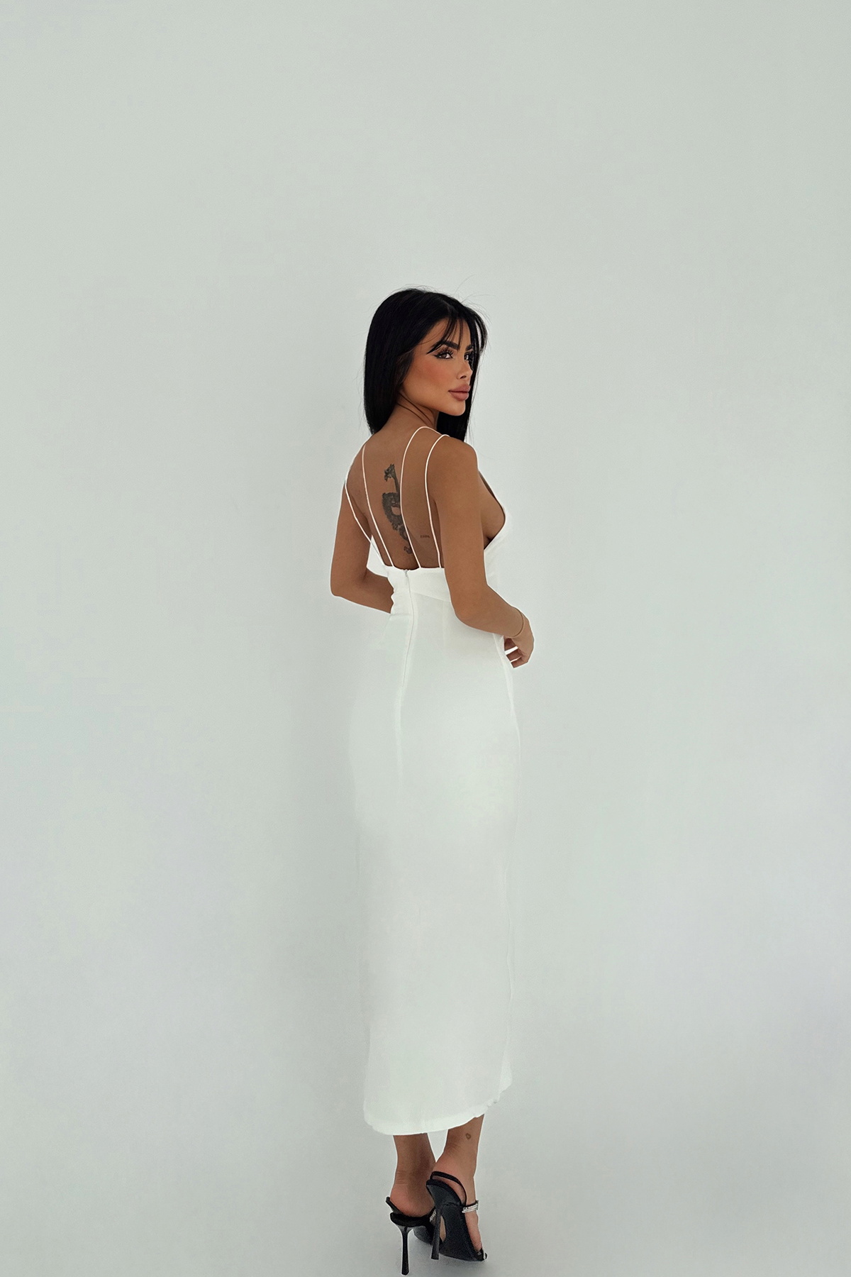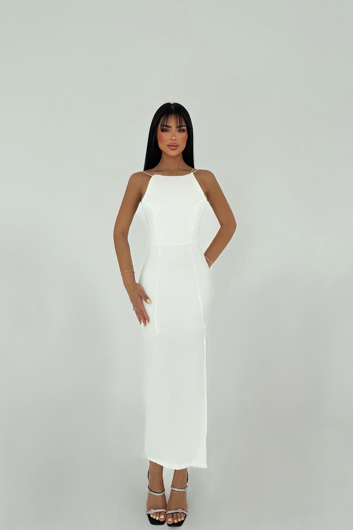 Beyaz Rowena Yırtmaç Detaylı Kalem Elbise