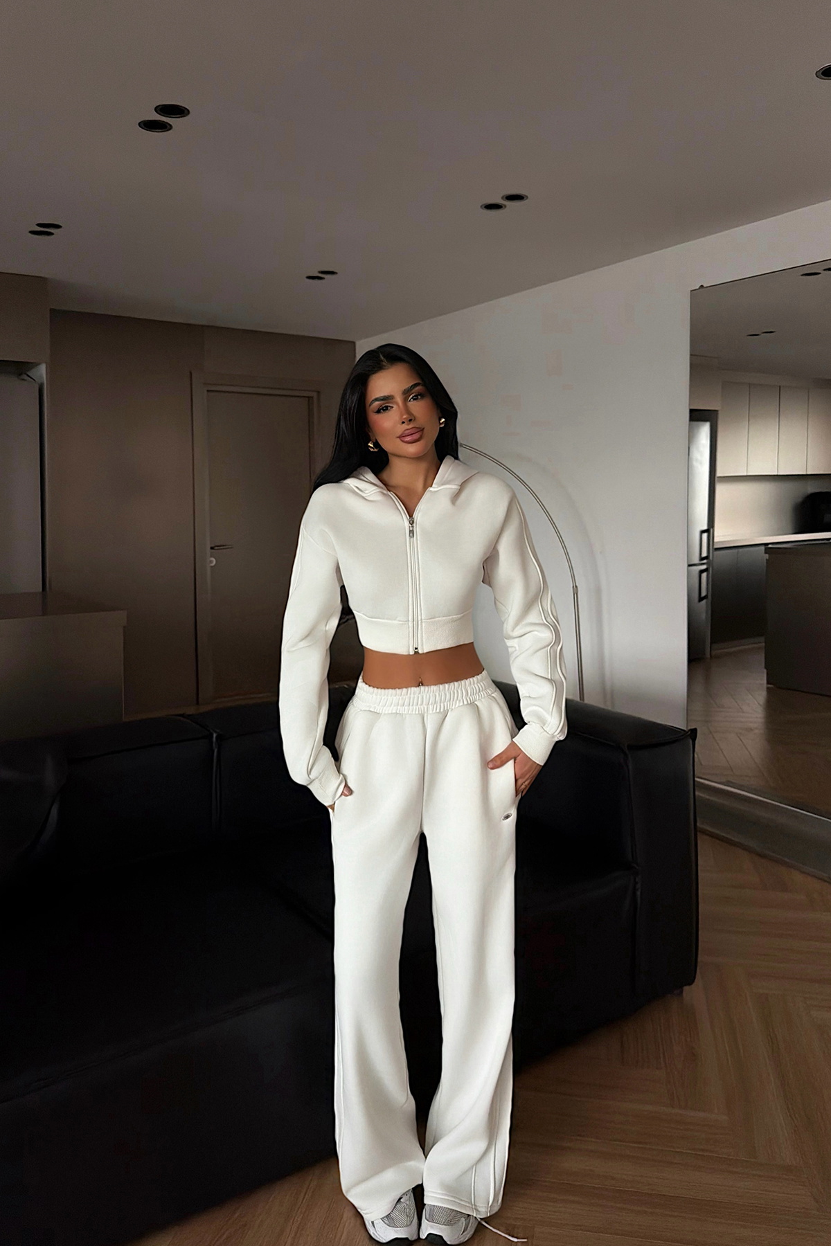 Sade beyaz tonuyla dikkat çeken bu eşofman takımı; ön kısmında yer alan fermuar detayı sayesinde modern bir sportif şıklık sunar. Üstü rahat kesimle gün boyu kullanım için idealken, alt kısmı bel ve paça detaylarıyla hem konfor hem stil sağlar.