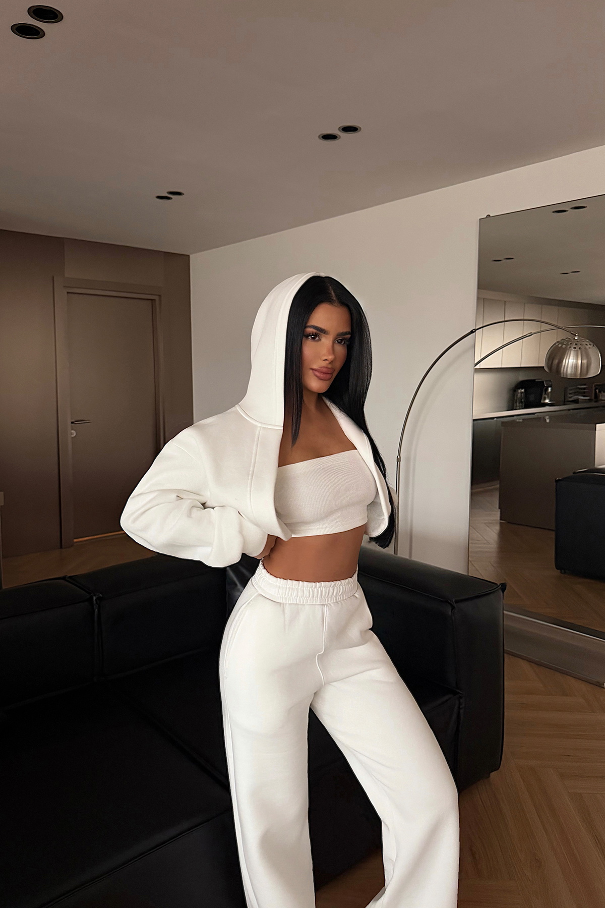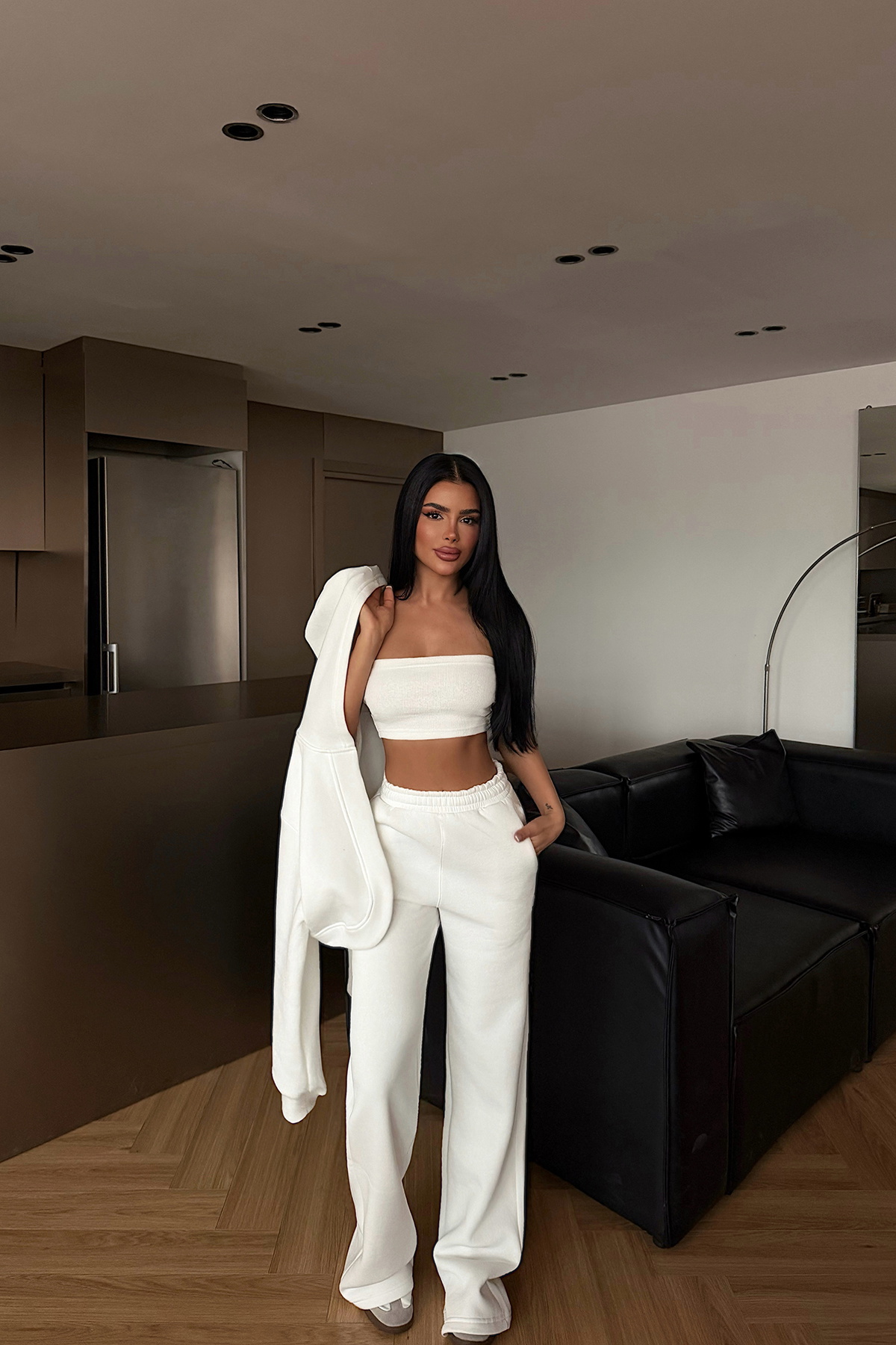 3 iplik kumaştan üretilen bu üçlü takım; crop hırka, büstiyer ve geniş paça pantolondan oluşan modern bir kombin sunar. Tok ve kaliteli duruşa sahip 3 iplik kumaş yapısı sayesinde hem konforlu hem de şık bir görünüm sağlar.