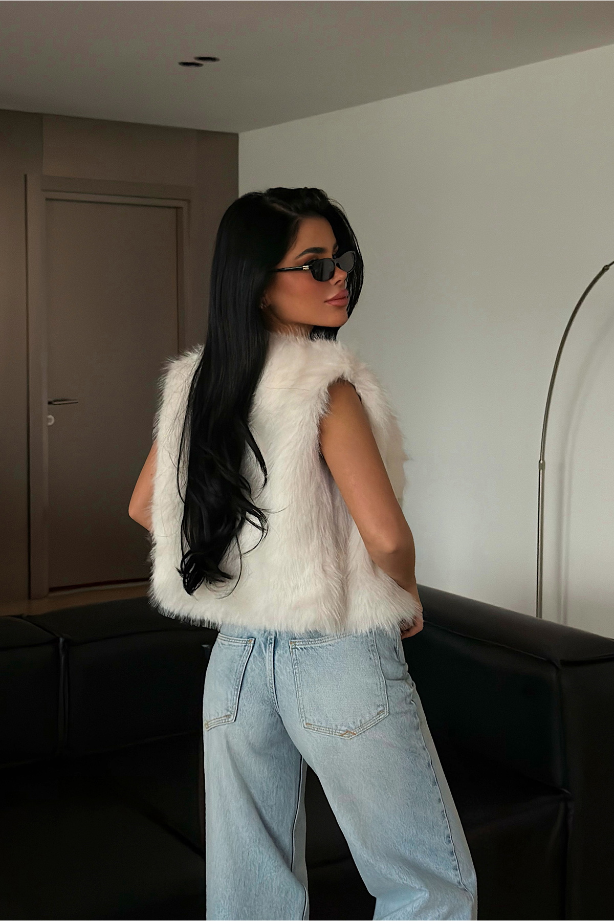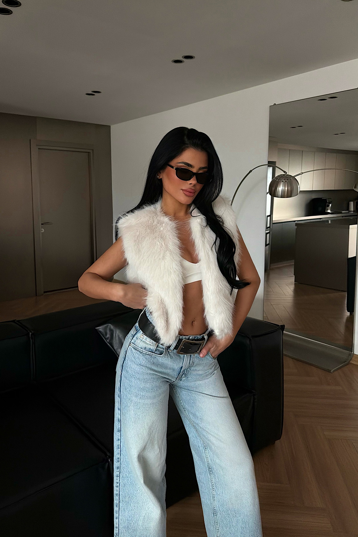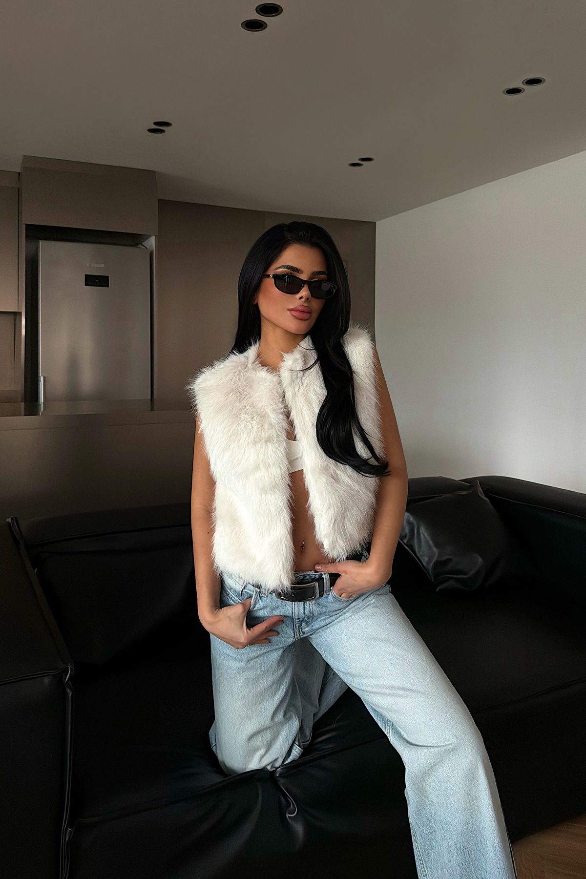 Hacimli kürk dokusuyla stilinize güçlü bir karakter kazandıran bu yelek, kolsuz tasarımıyla rahat hareket alanı sunar. Kısa formu sayesinde bel hattını öne çıkarır, kombinlere dinamik ve dikkat çekici bir siluet ekler