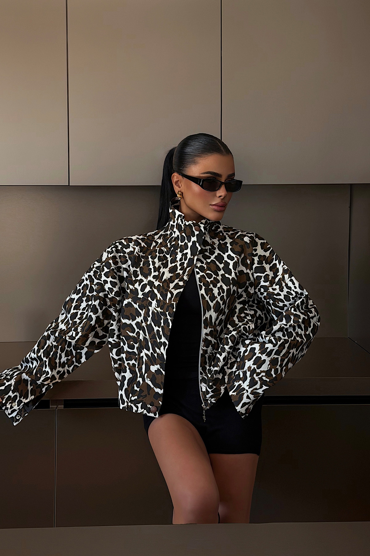 Leopar desenli yapısıyla dikkat çeken bu ceket, kısa formu ve rahat kalıbıyla modern bir görünüm sunar. Fermuarlı tasarımı ve dik yaka detayı sportif-şık bir duruş kazandırırken, desenli kumaşı kombinlere güçlü bir karakter katar.