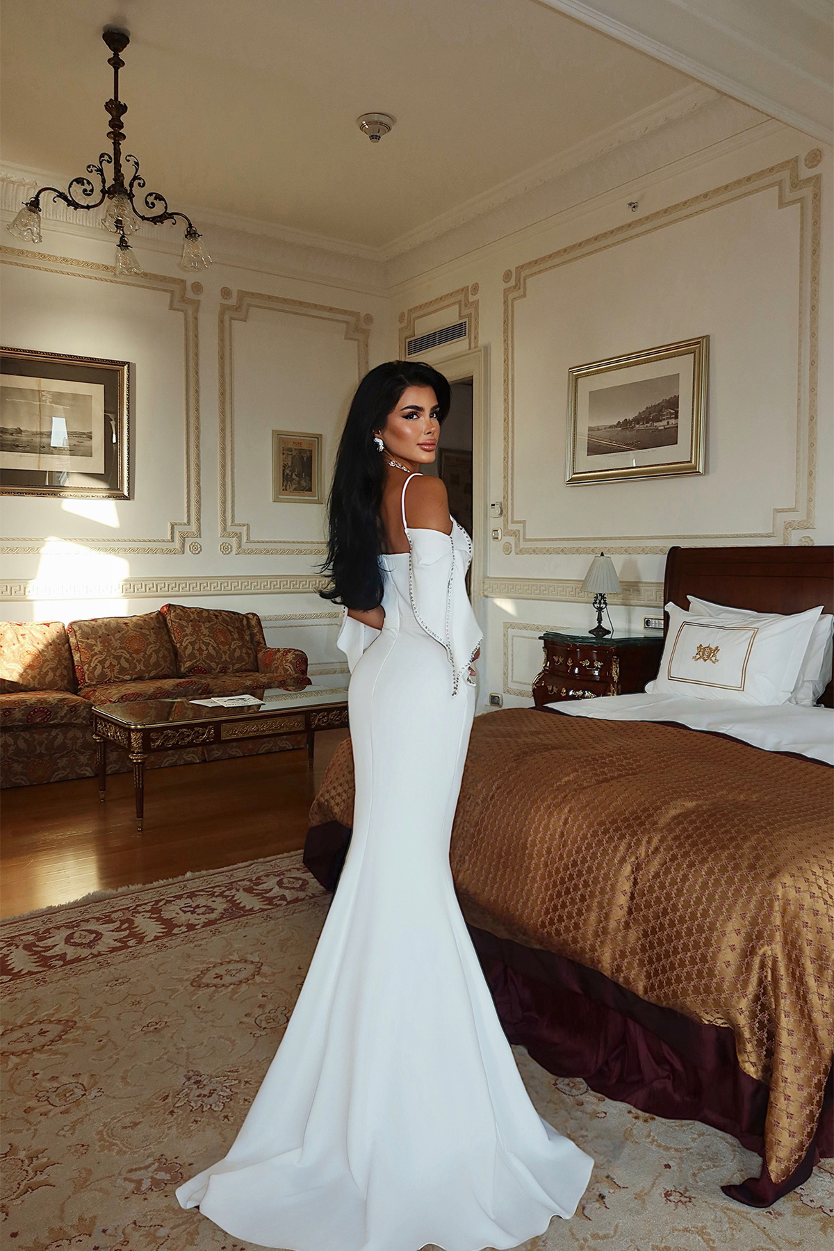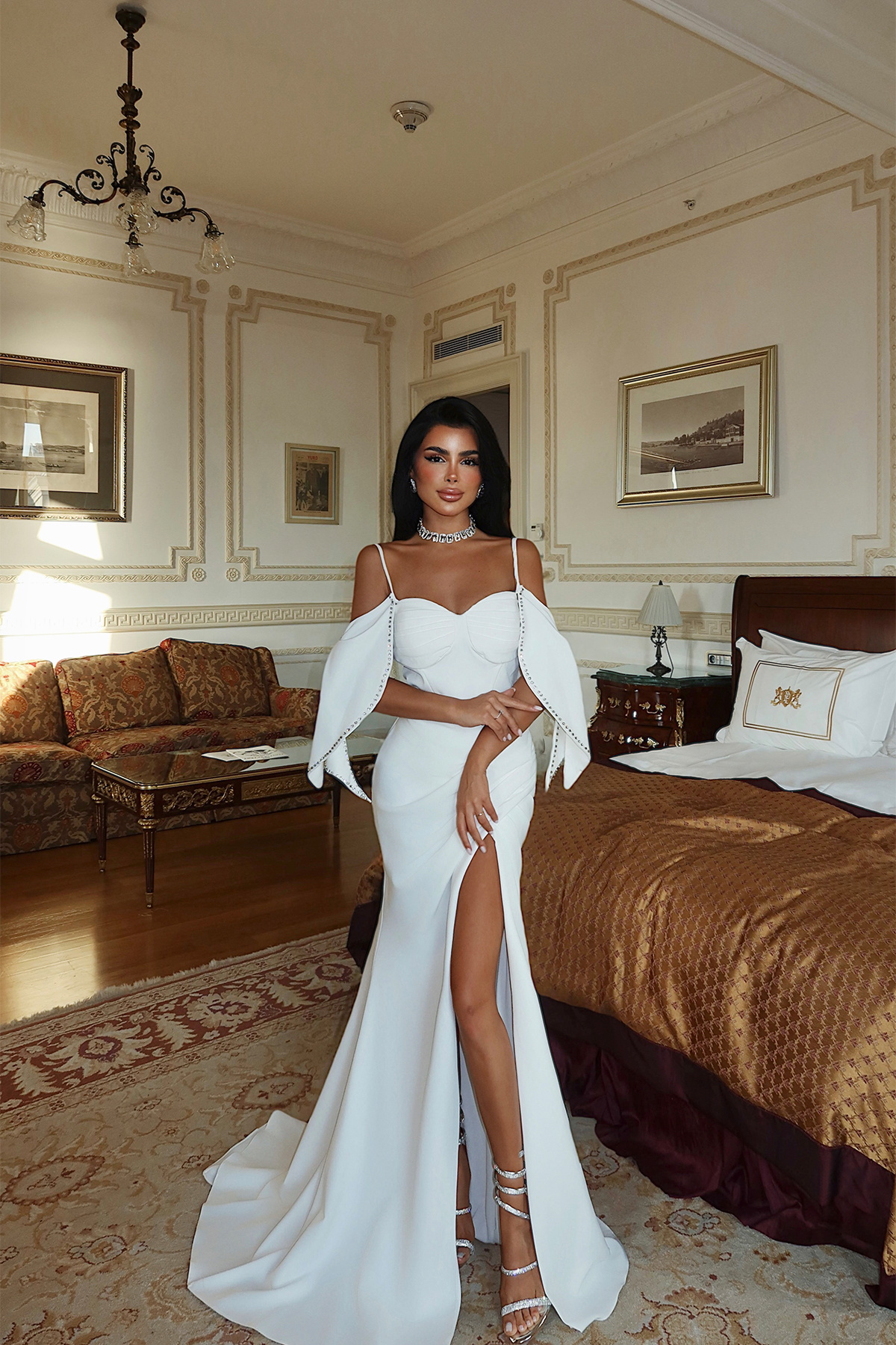 Beyaz Aella Uzun Yırtmaçlı Abiye – Saf ve Işıltılı Şıklık