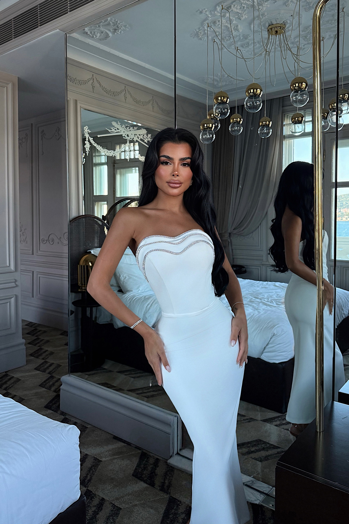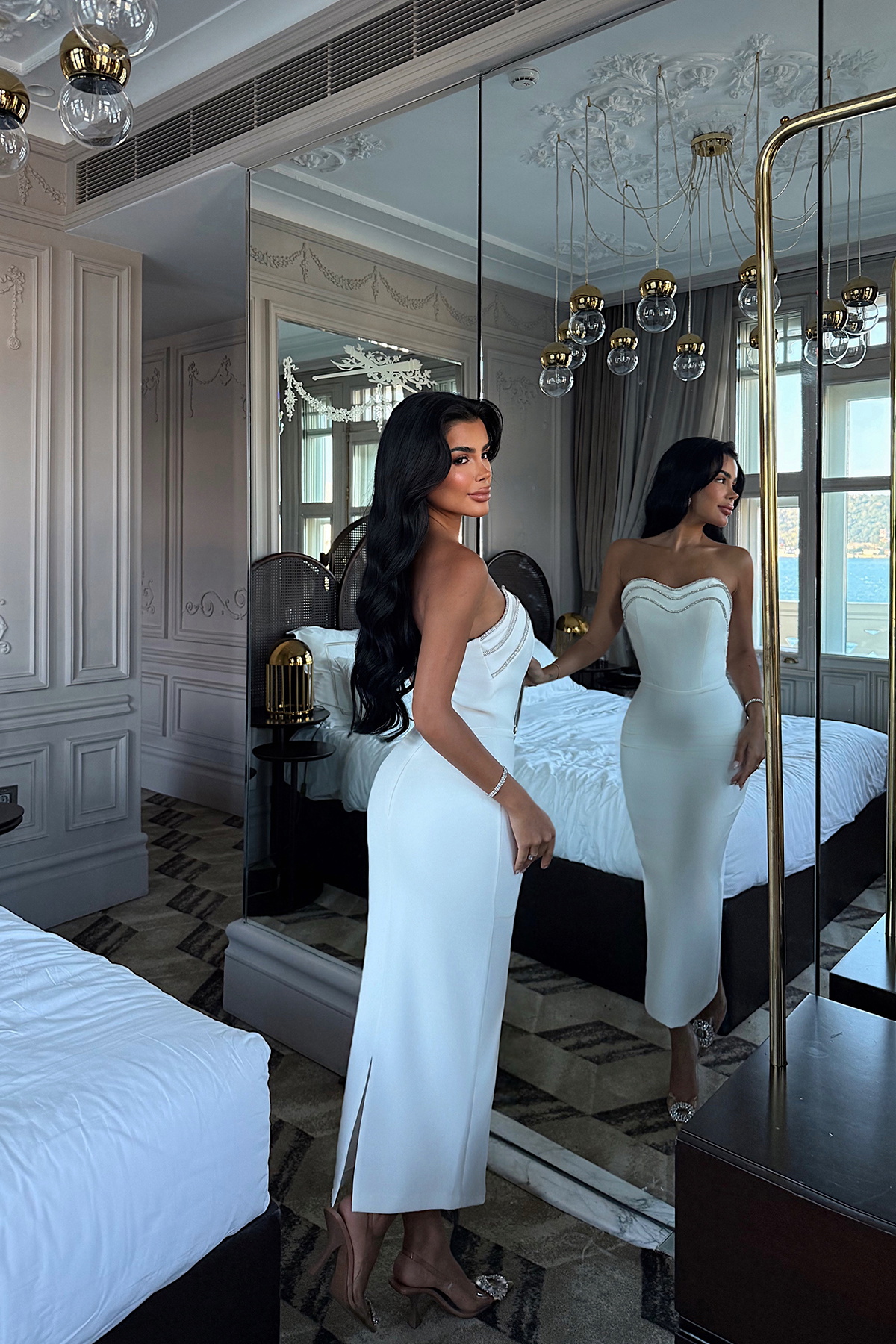 Saf beyaz rengin zarafeti ile taş detayların ışıltısını birleştiren Martha Midi Boy Abiye, özel gecelerde göz alıcı bir görünüm sunar. Straplez yaka formu omuz hatlarını ön plana çıkarır, taş tokalar ve süsleme detayları elbiseye parlaklık ve özgünlük katar. Vücuda oturan üst kesim, elegant ve feminen bir siluet oluştururken alt kısmı dengeli bir görünüm sunar.