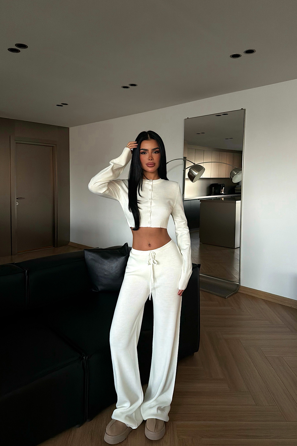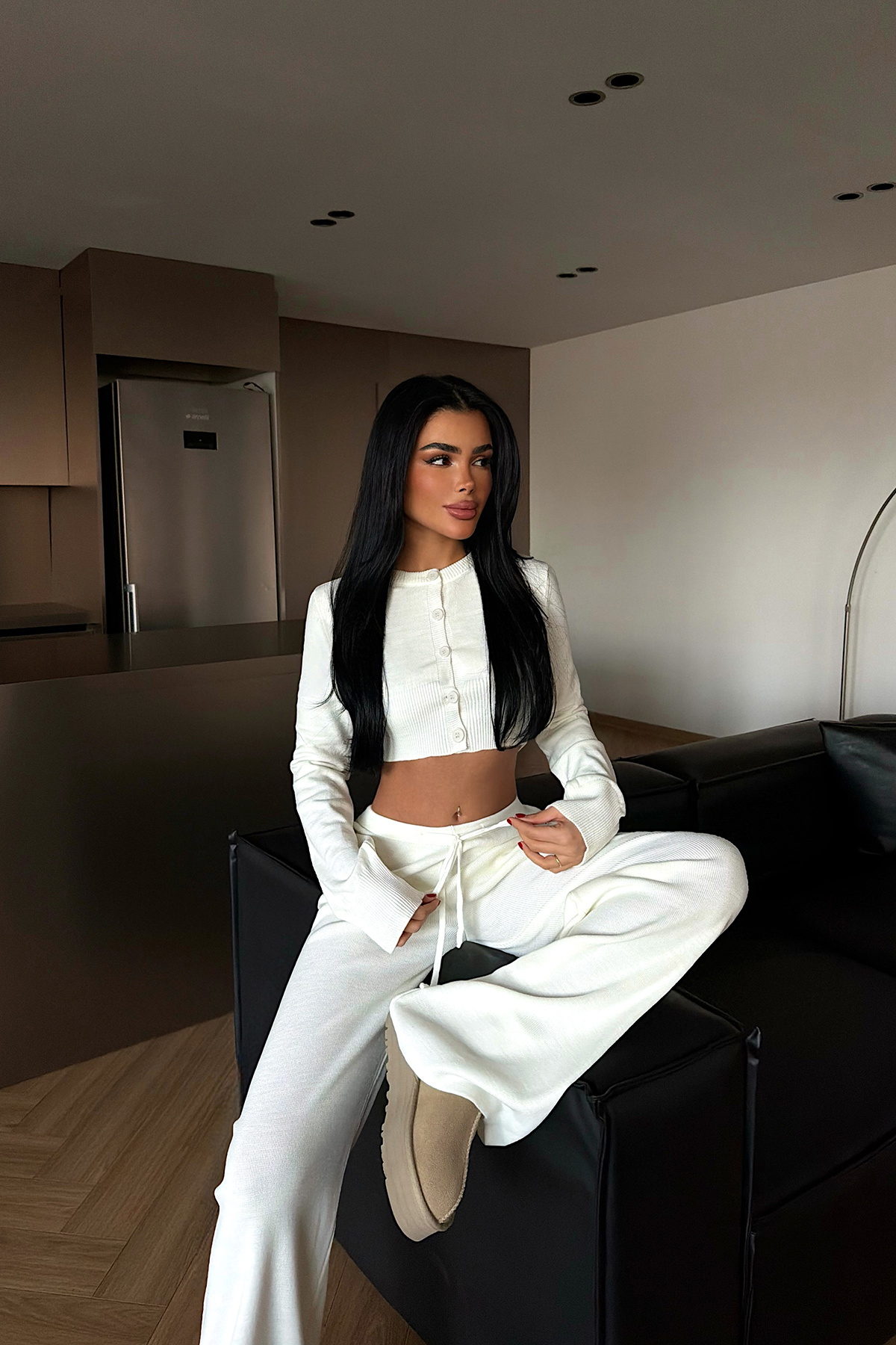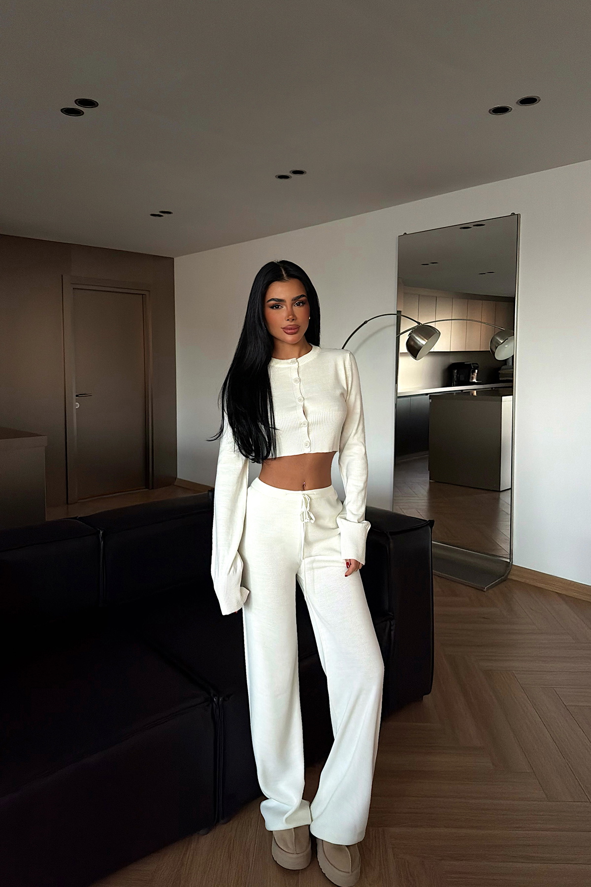 Üst ve etekten oluşan iki parçalı takım, dokulu triko yüzeyiyle sade ama iddialı bir görünüm sunar. Kısa boy üst parça, önden düğme kapamalı yapısı ve yuvarlak yaka detayıyla tasarımı öne çıkarırken, bele oturan formu silueti dengeler.