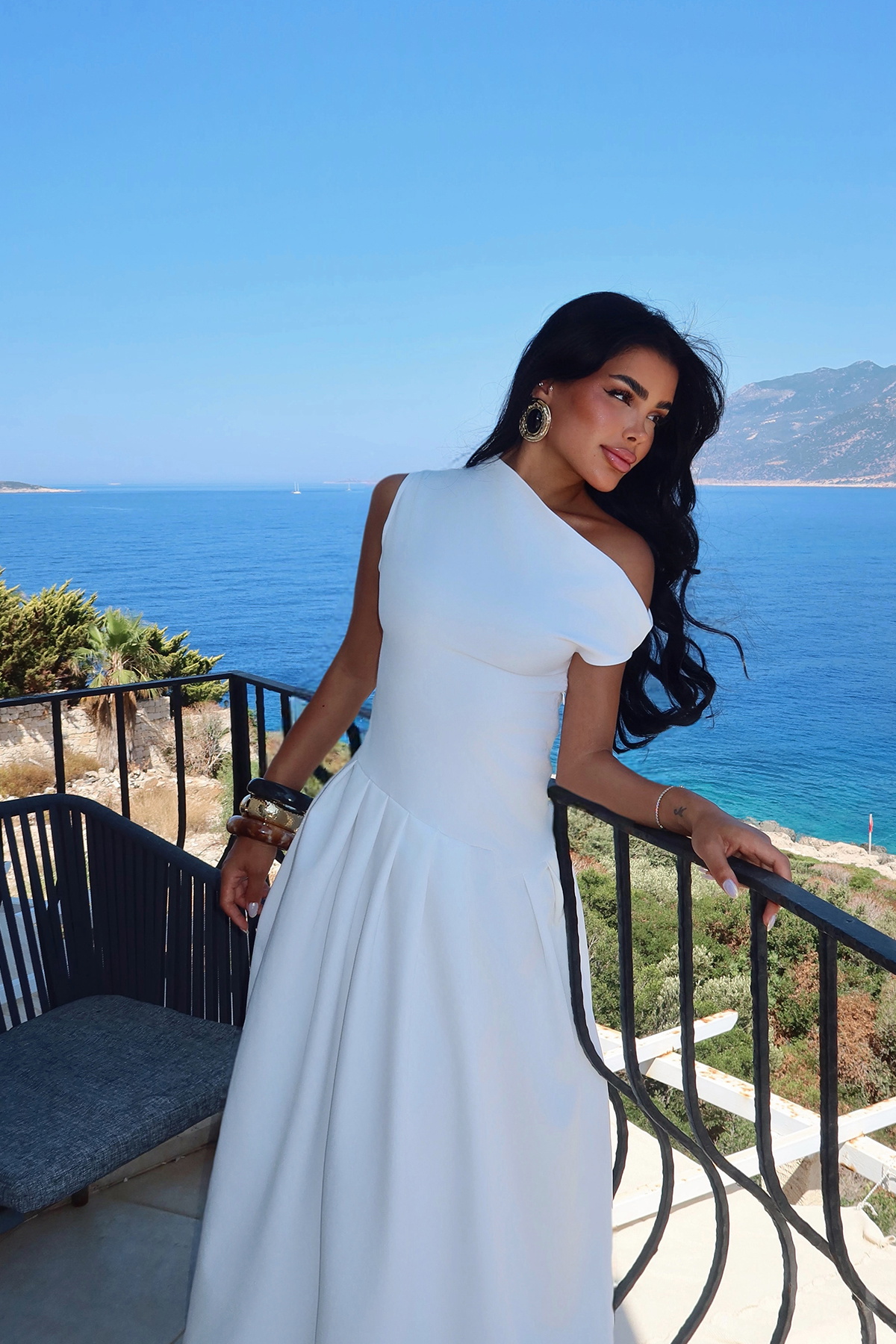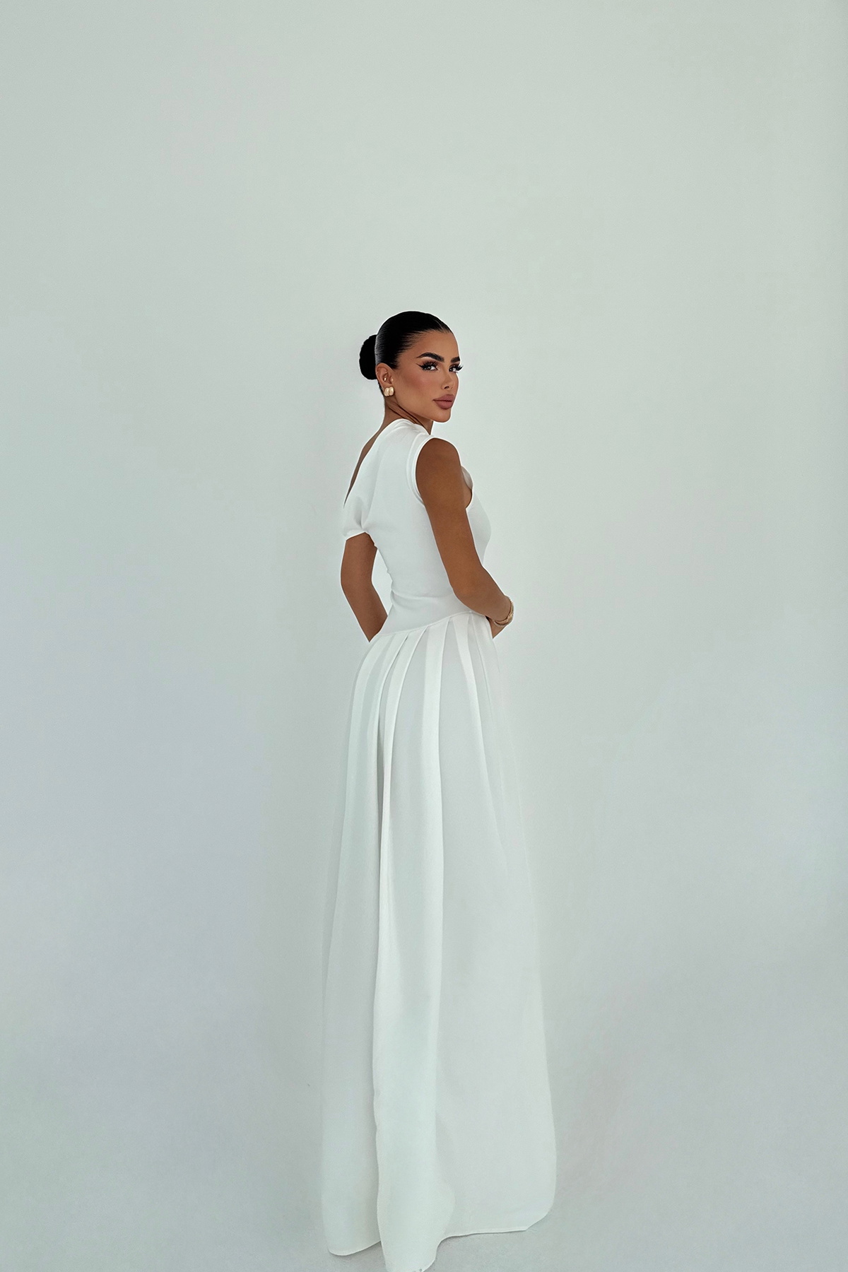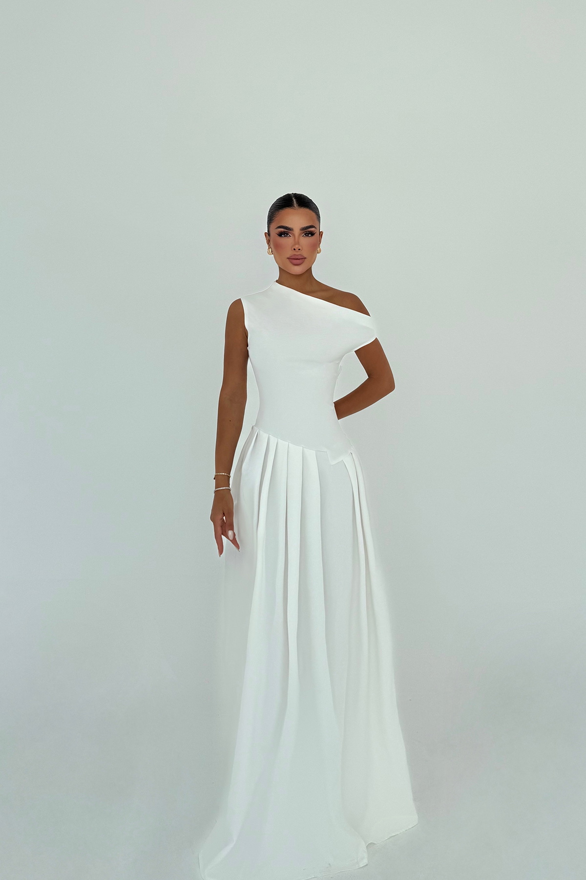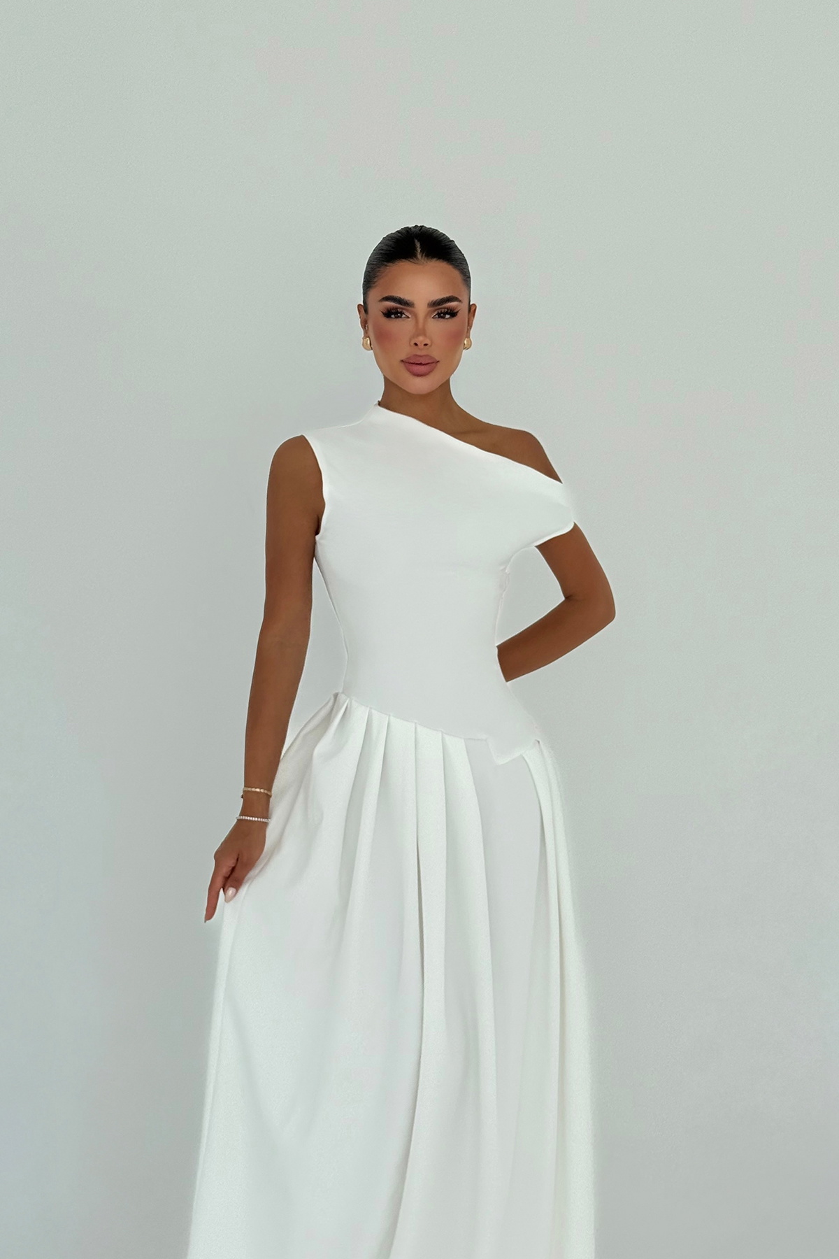 Beyaz Bimala Kayık Yaka Elbise