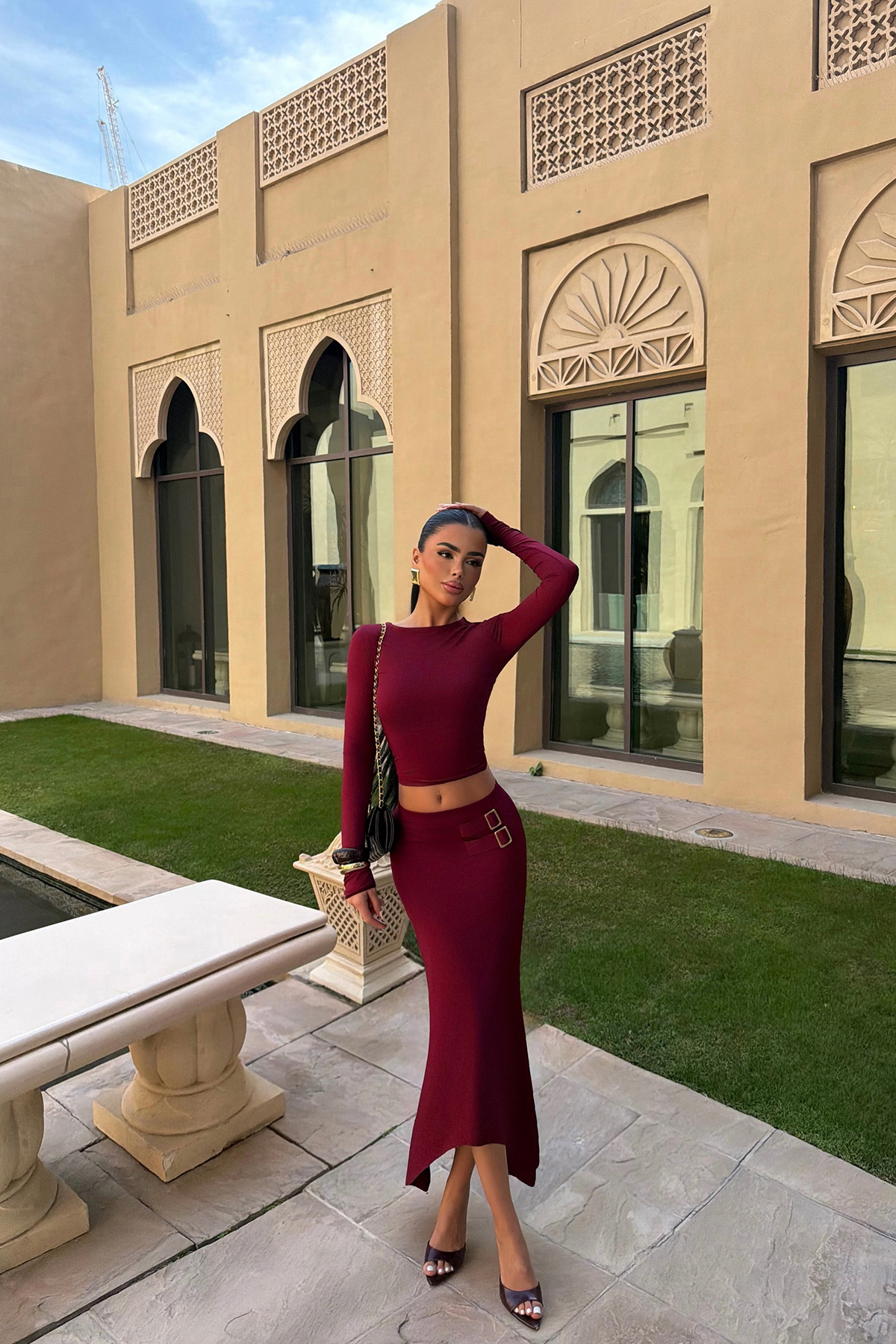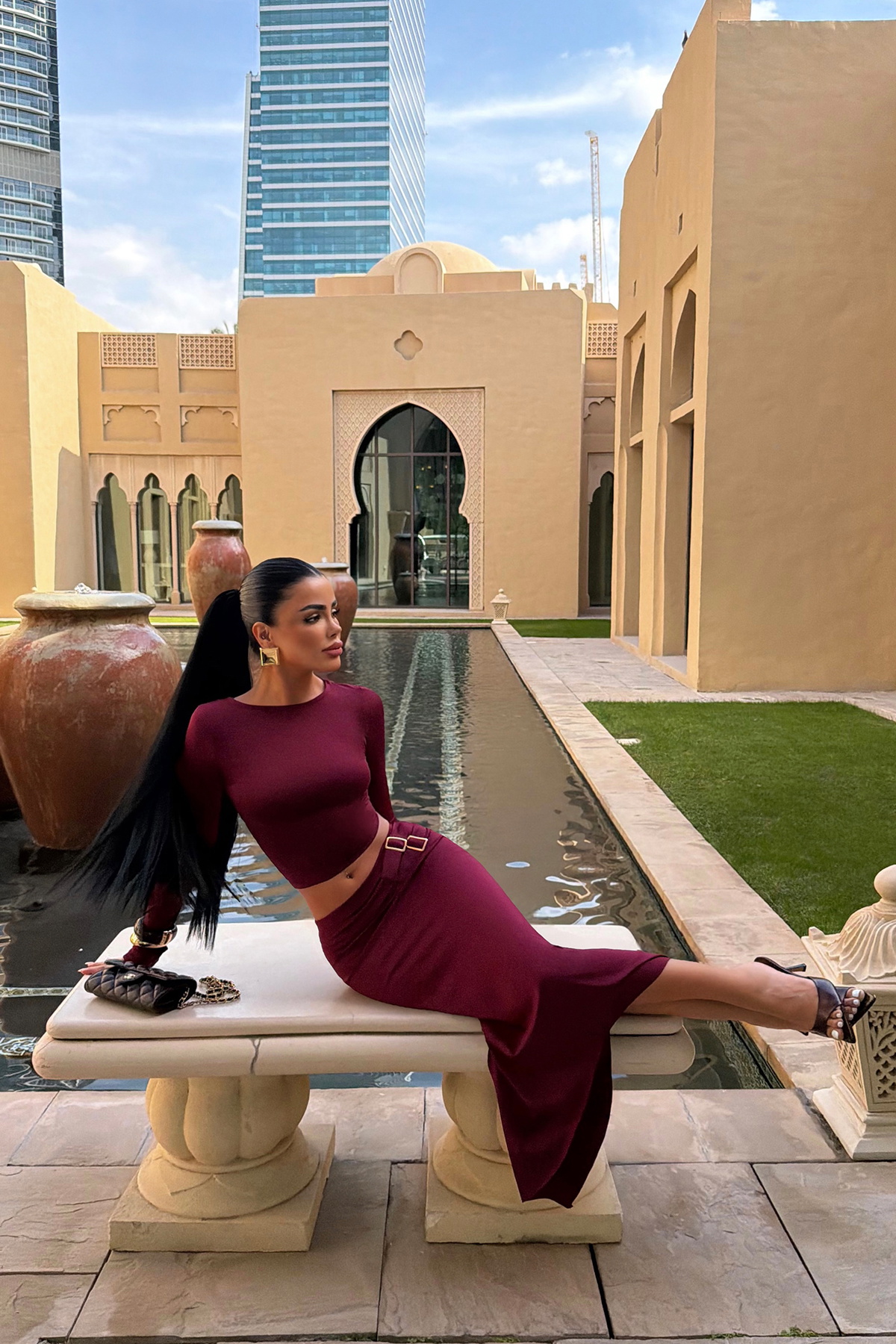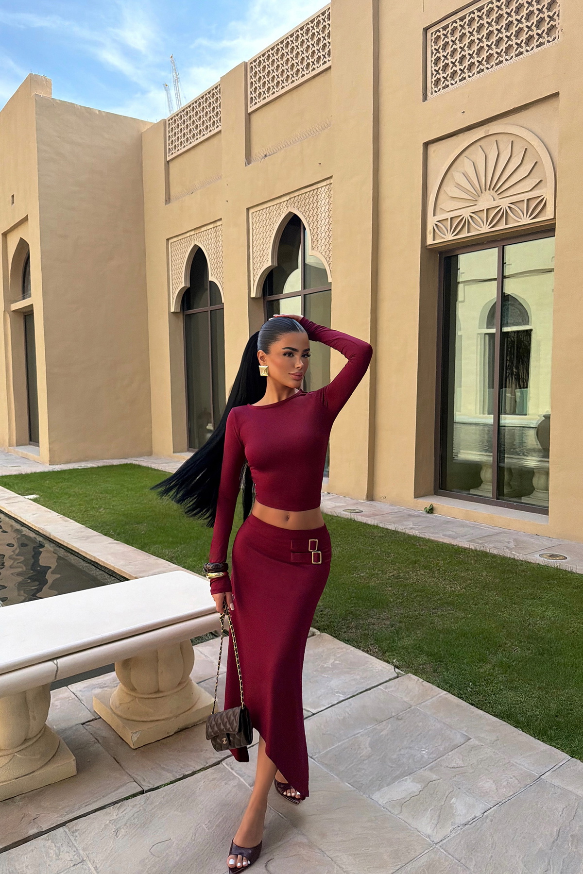 Modern çizgileri ve feminen duruşuyla öne çıkan bu bordo takım, şıklığı tek parçada sunar. Uzun kollu crop bluz ile tamamlanan yüksek bel uzun etek, vücut hatlarını zarif şekilde vurgulayan dengeli bir siluet oluşturur. Etek üzerindeki metal aksesuar detayı tasarıma modern bir dokunuş katar.