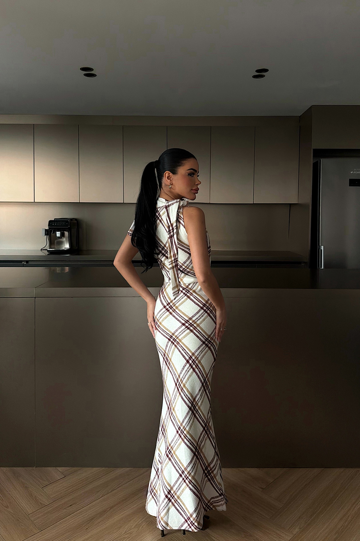 Ekose desenli yapısı ve vücuda oturan kesimiyle öne çıkan uzun elbise, kolsuz tasarımı ve ön yırtmaç detayıyla zarif ve feminen bir siluet sunar. Akıcı etek formu elbiseye hareket kazandırırken, sade ve şık duruşu sayesinde şehir stilinden özel davet kombinlerine kadar rahatlıkla tercih edilebilir.