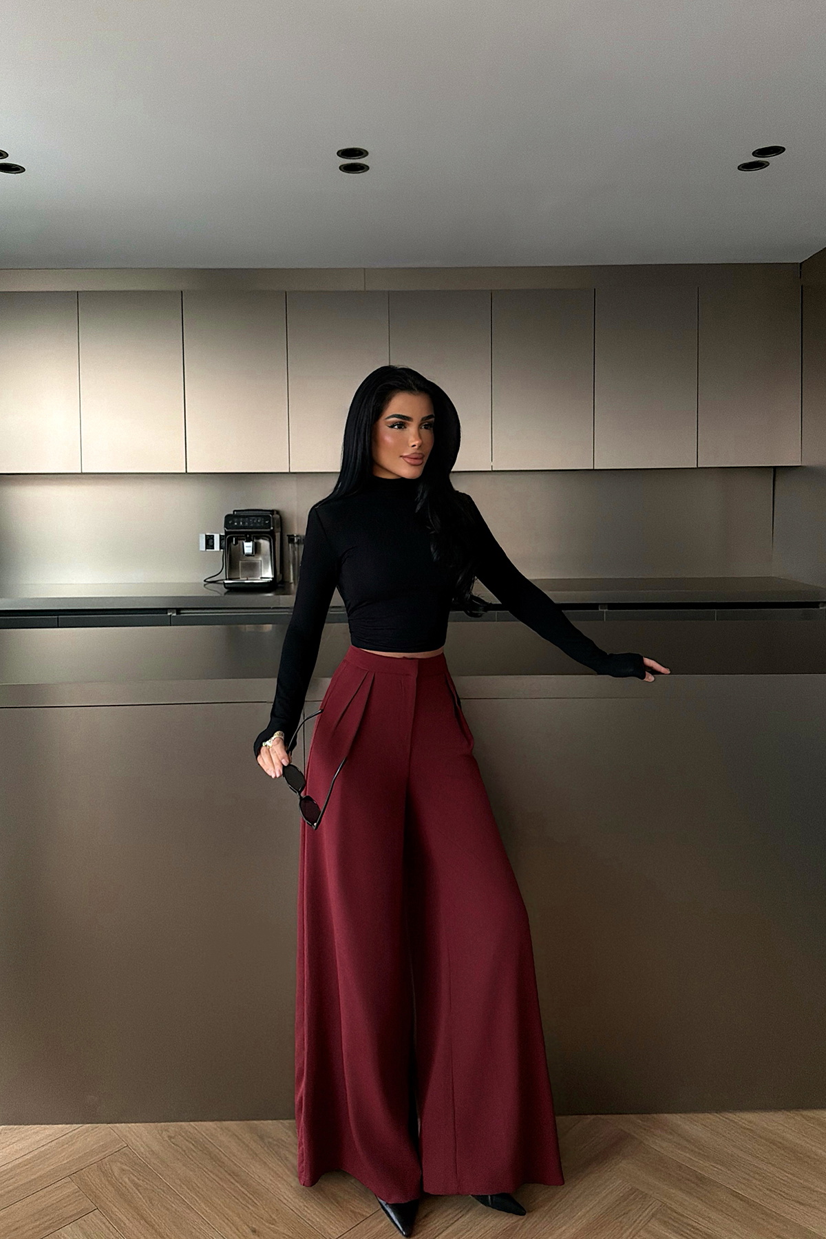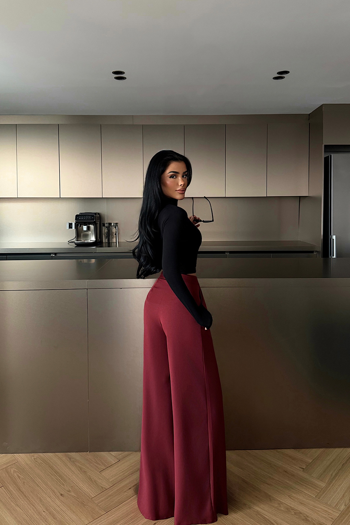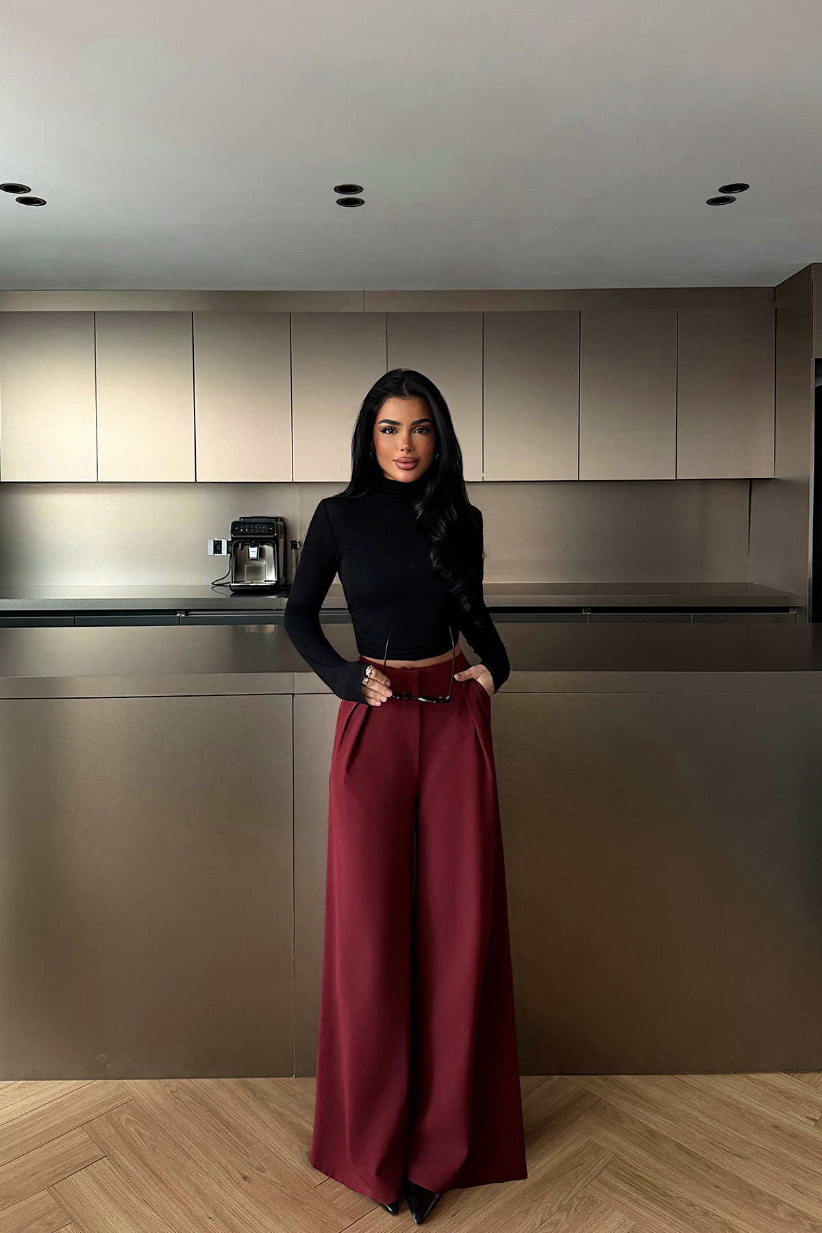 Yüksek bel formu ve bol paça kesimiyle öne çıkan palazzo pantolon, akıcı yapısı sayesinde uzun ve dengeli bir siluet sunar. Rahat kalıbı ve sade tasarımıyla günlük kombinlerden şık şehir stiline kadar çok yönlü kullanım sağlar.