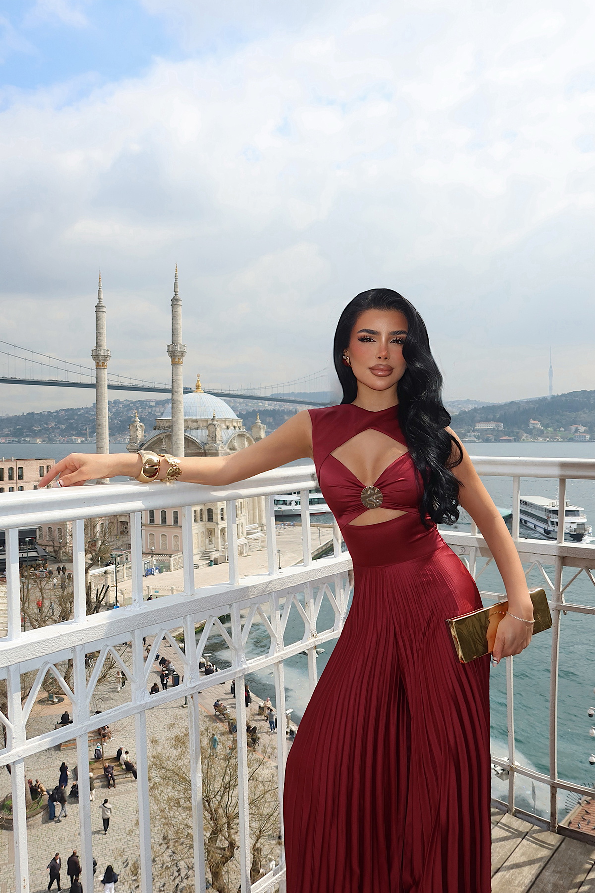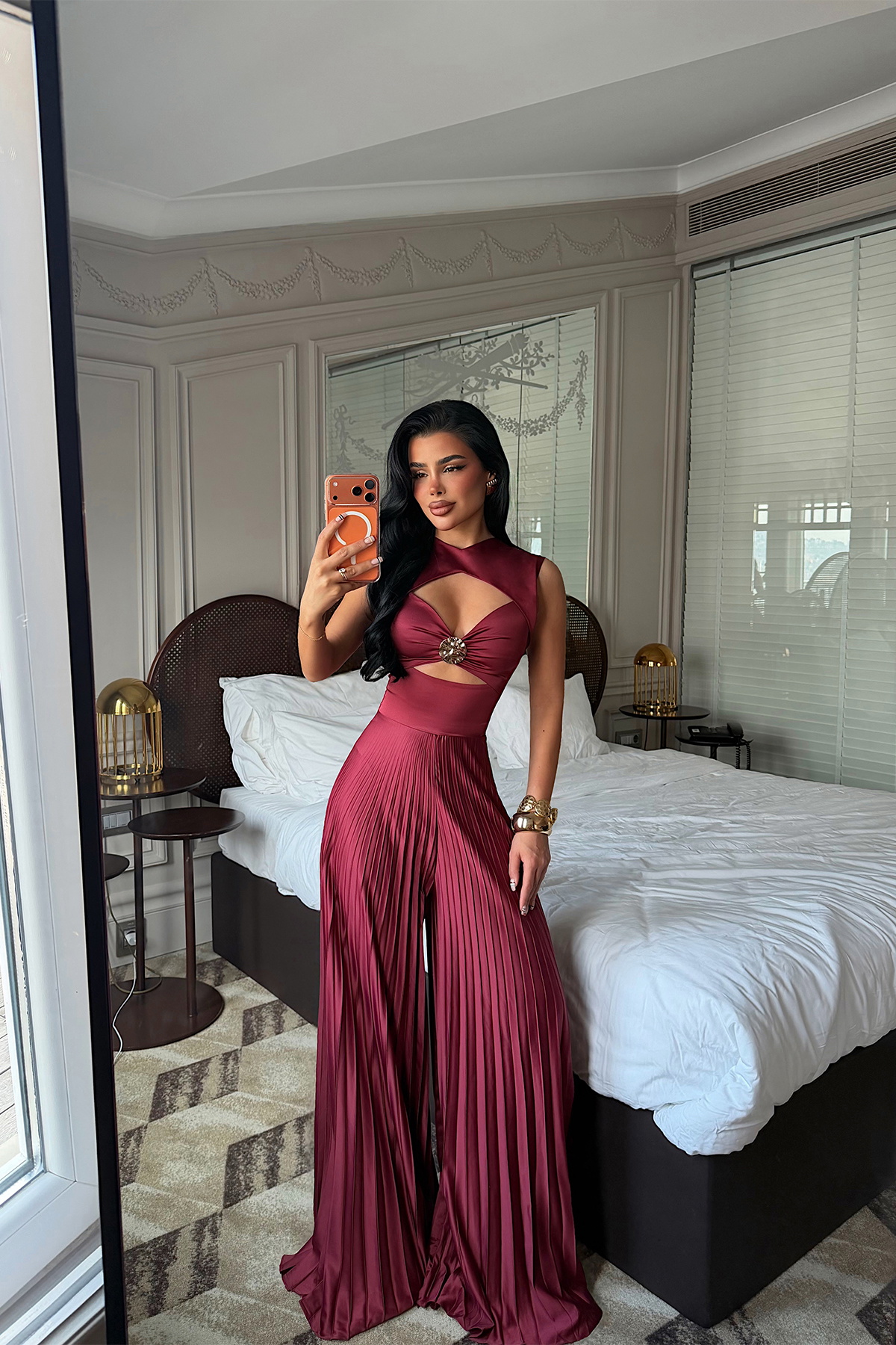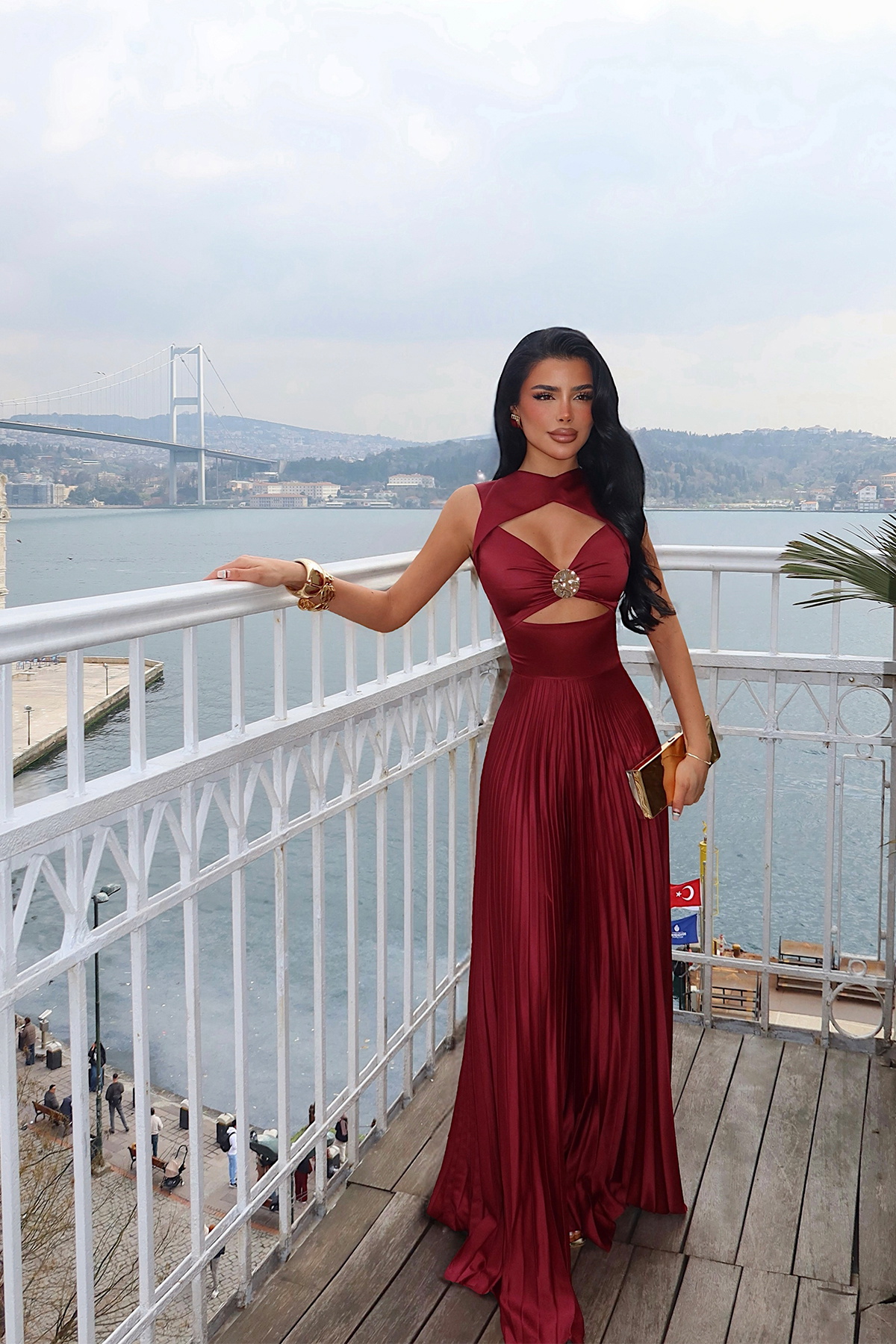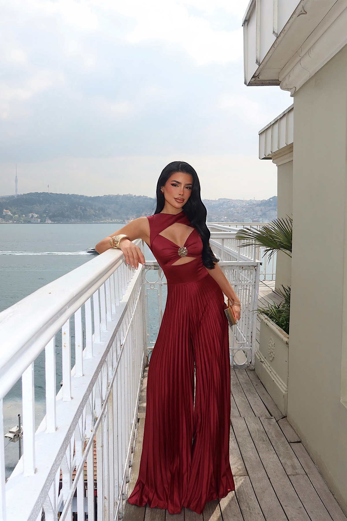 Alt kısmındaki piliseli geniş paça kesim, yürüdükçe hareket kazanan akıcı bir duruş sağlar. Hafif ve yumuşak dokulu kumaşı sayesinde hem şık hem rahat bir kullanım sunan bu tulum; davetler, gece organizasyonları ve özel anlar için ideal bir tercihtir.