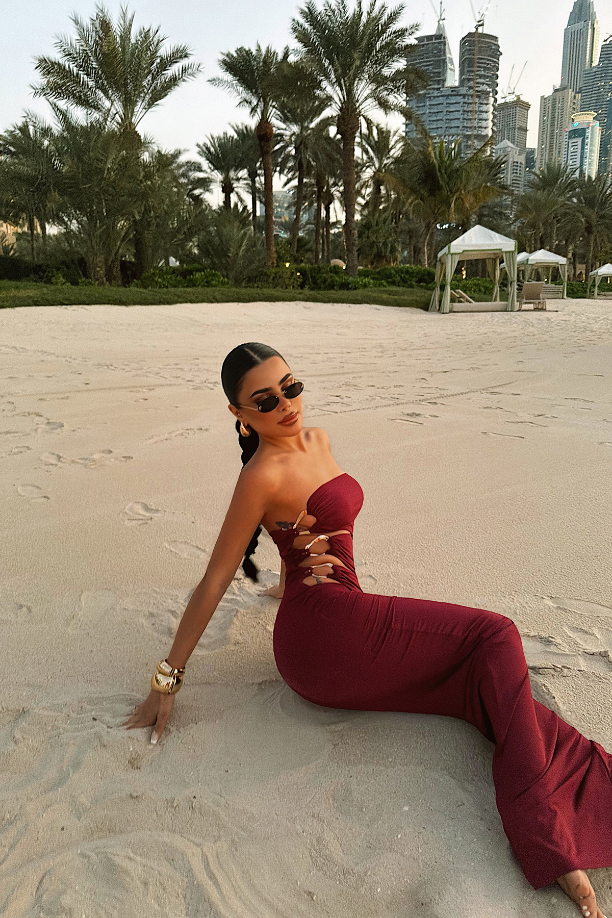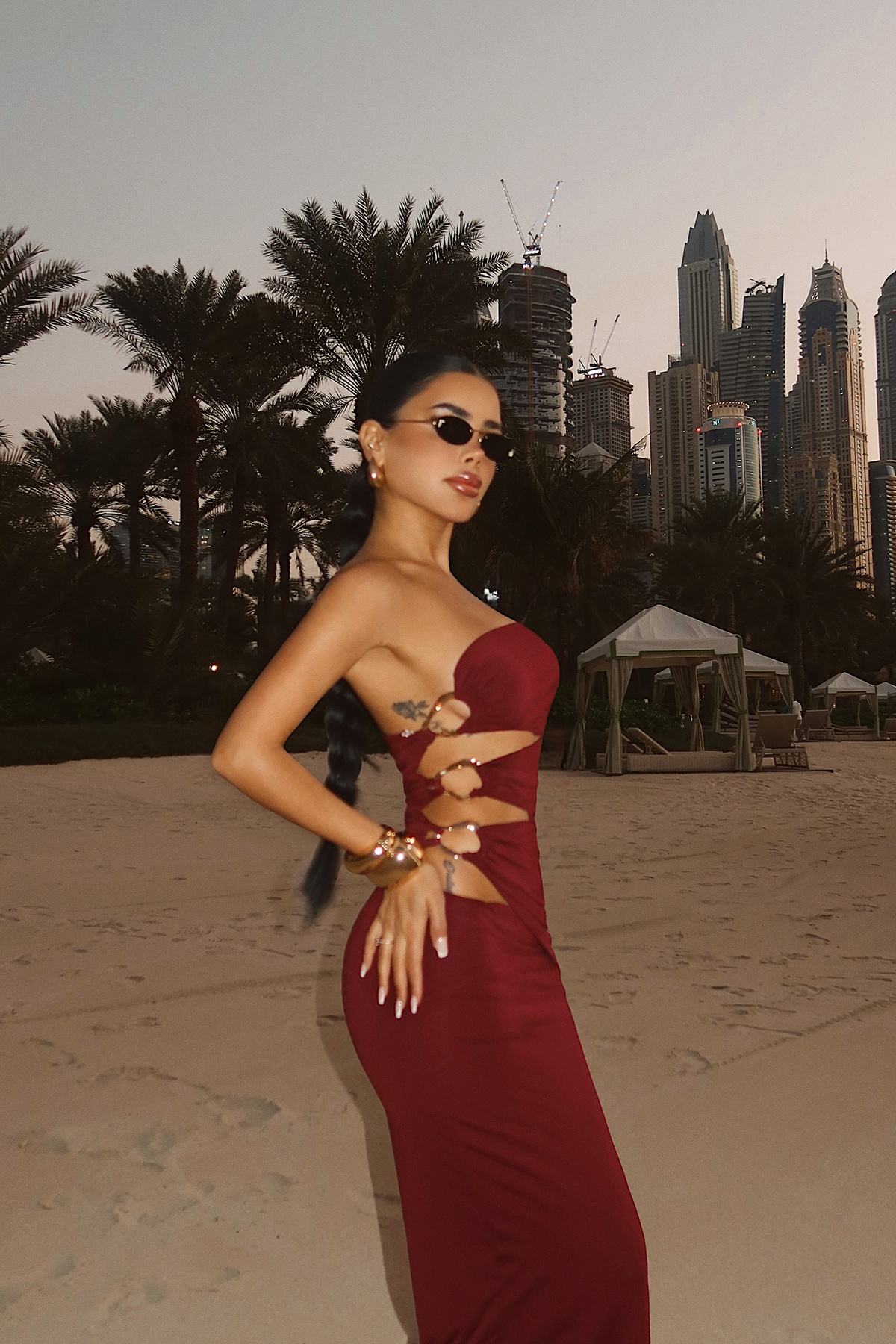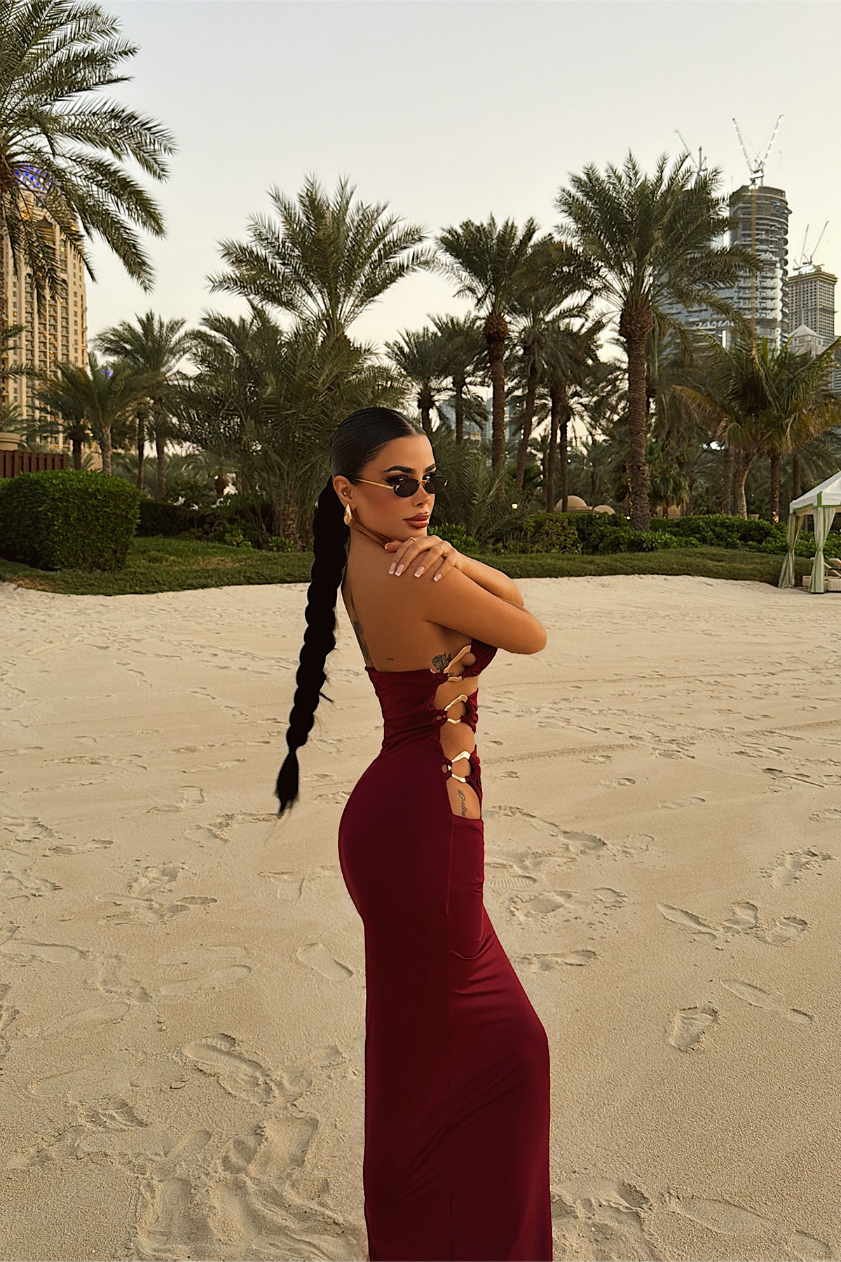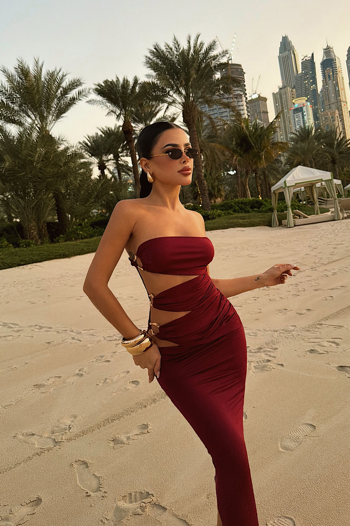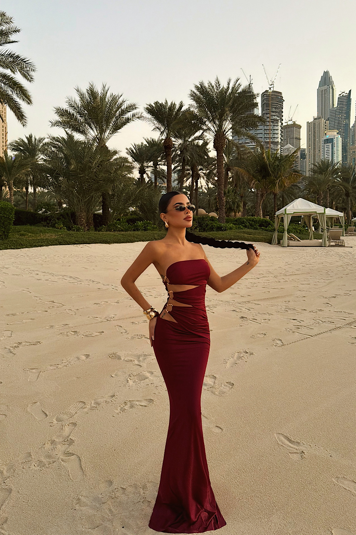 Göz alıcı yan dekolte tasarımıyla öne çıkan bu elbise, metal halka detaylarıyla modern ve iddialı bir görünüm sunar. Straplez üst formu omuz hattını zarif şekilde vurgularken, yan kesiklerde yer alan metal aksesuarlar tasarıma güçlü bir karakter katar. Etek kısmındaki yırtmaç detayı hareket özgürlüğü sağlarken silueti dengeli biçimde tamamlar.