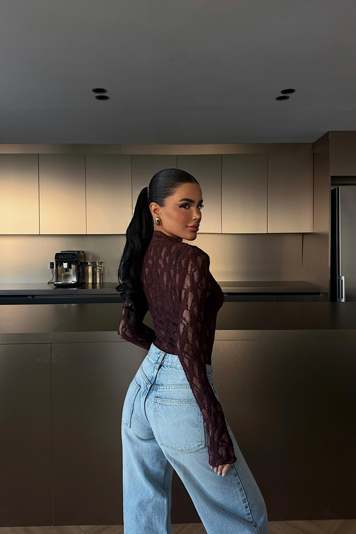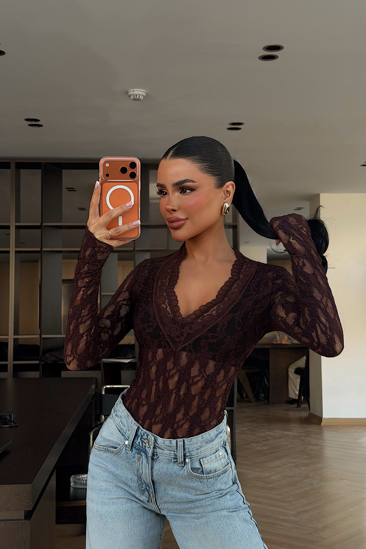 Zarif dantel dokusu ve transparan yapısıyla tasarlanan bu bluz, feminen ve modern bir stil sunar. V yaka formu dekolte hattını zarif şekilde vurgularken, uzun kollu tasarımı dengeli ve şık bir görünüm oluşturur. Esnek dantel kumaşı sayesinde vücuda uyum sağlayarak konforlu bir kullanım sunar.