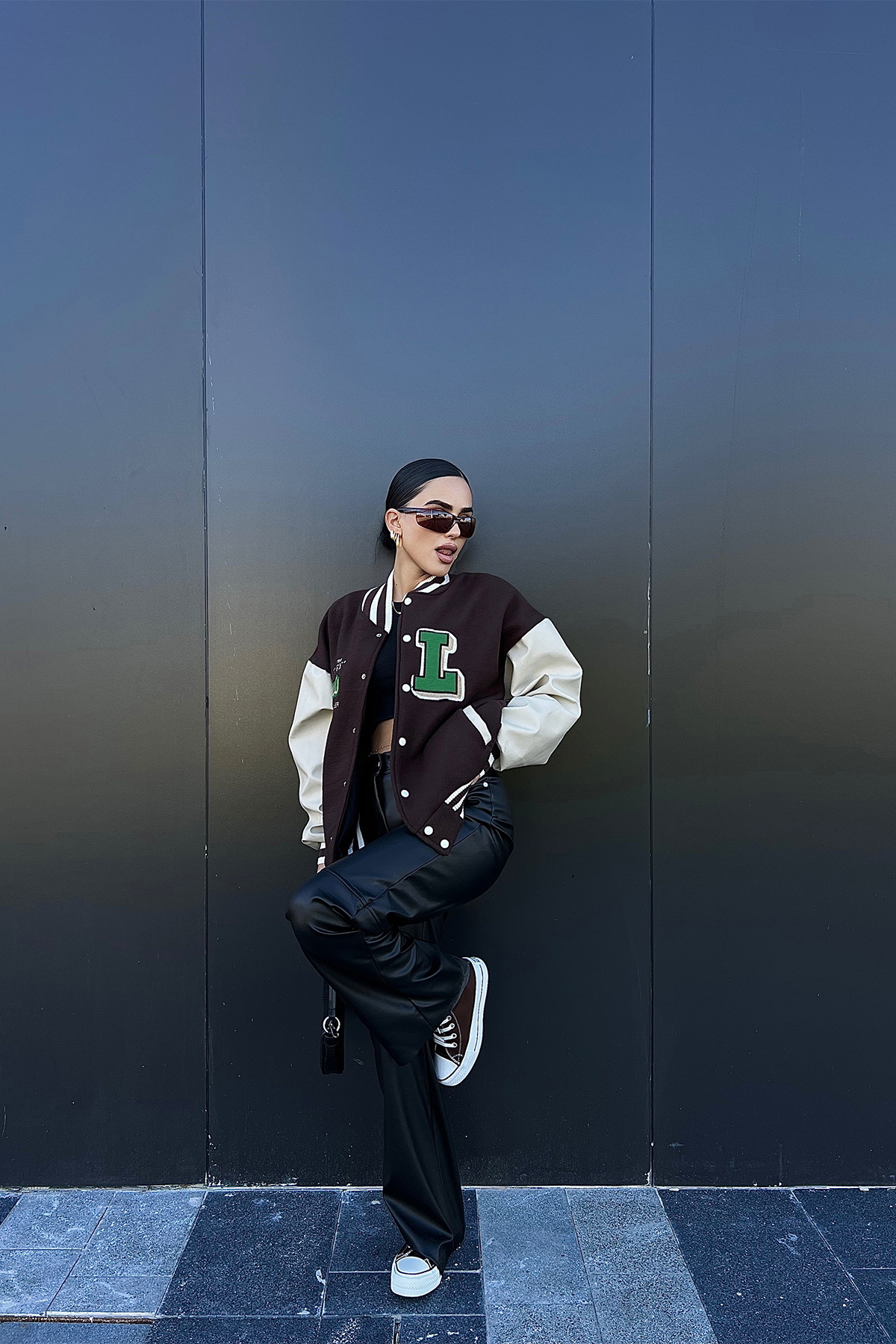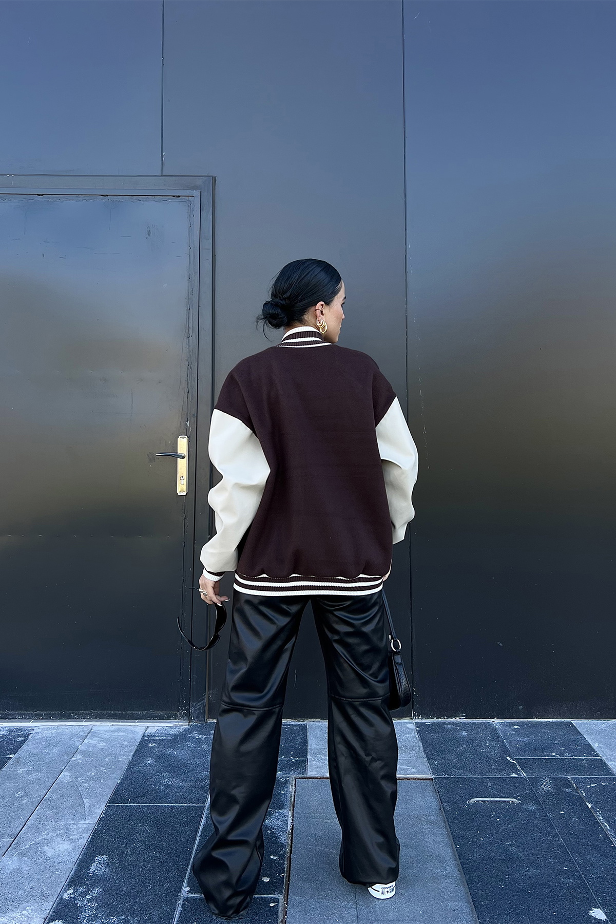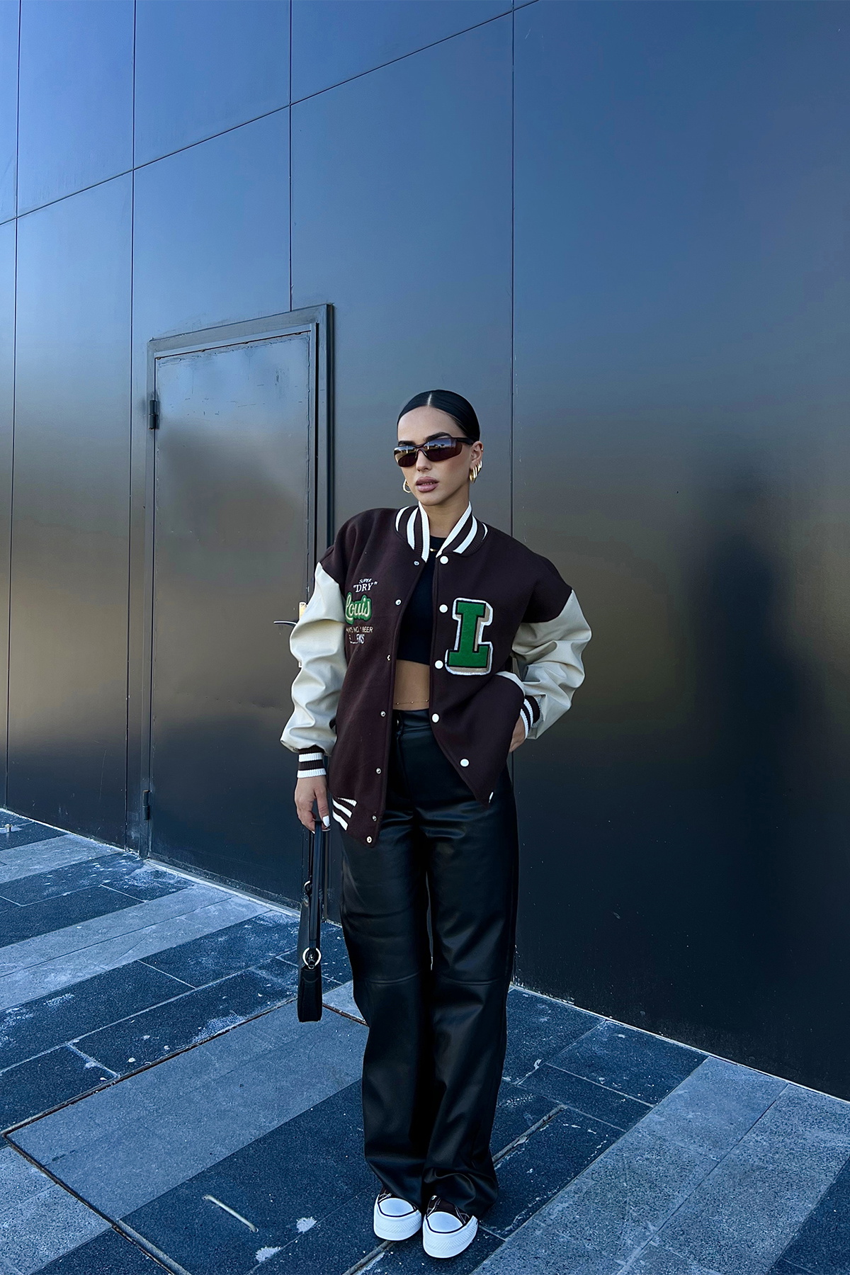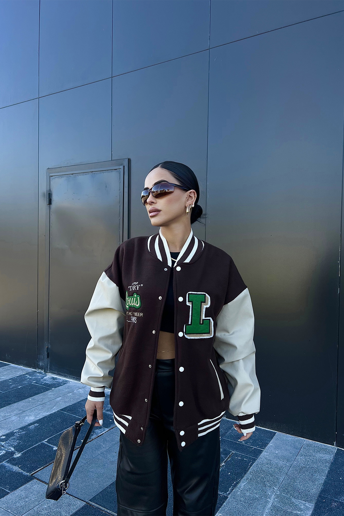 Brown Leather-Sleeve College Jacket in this photo is STANDART size.