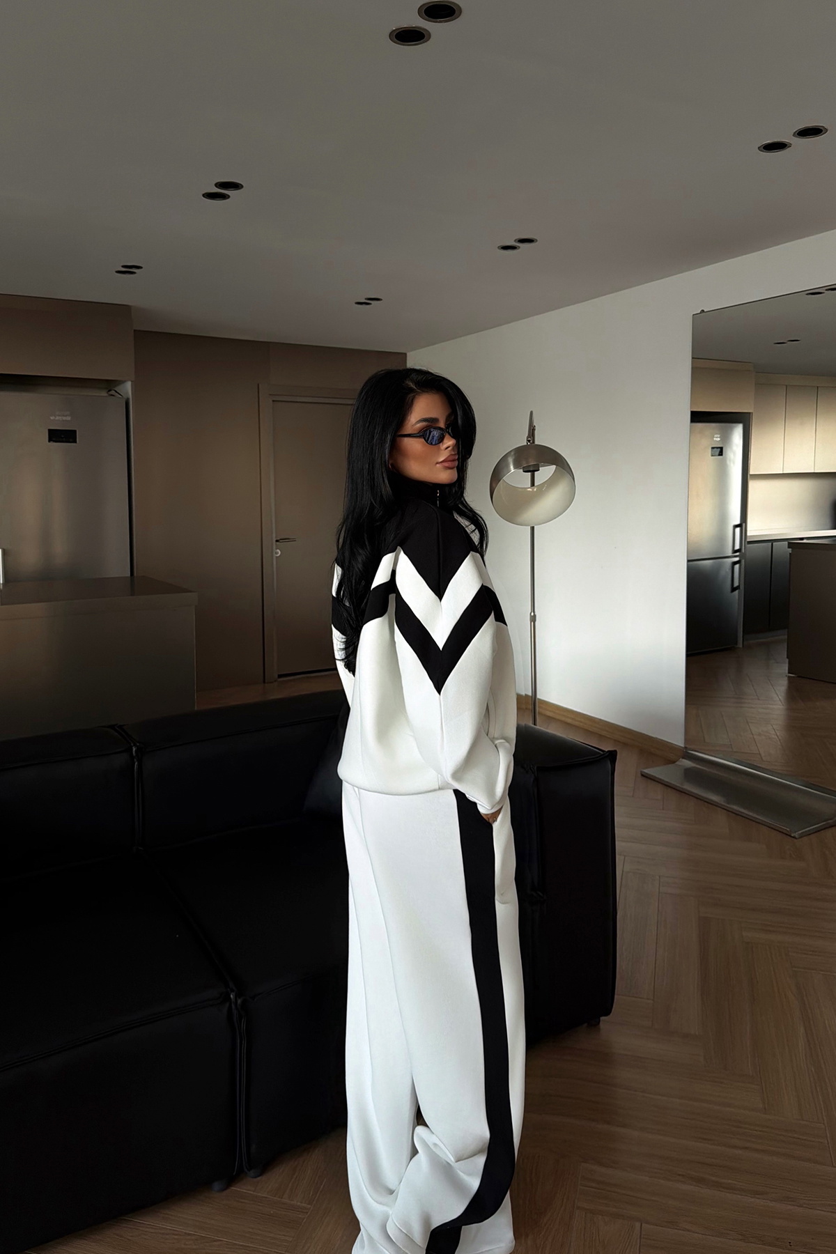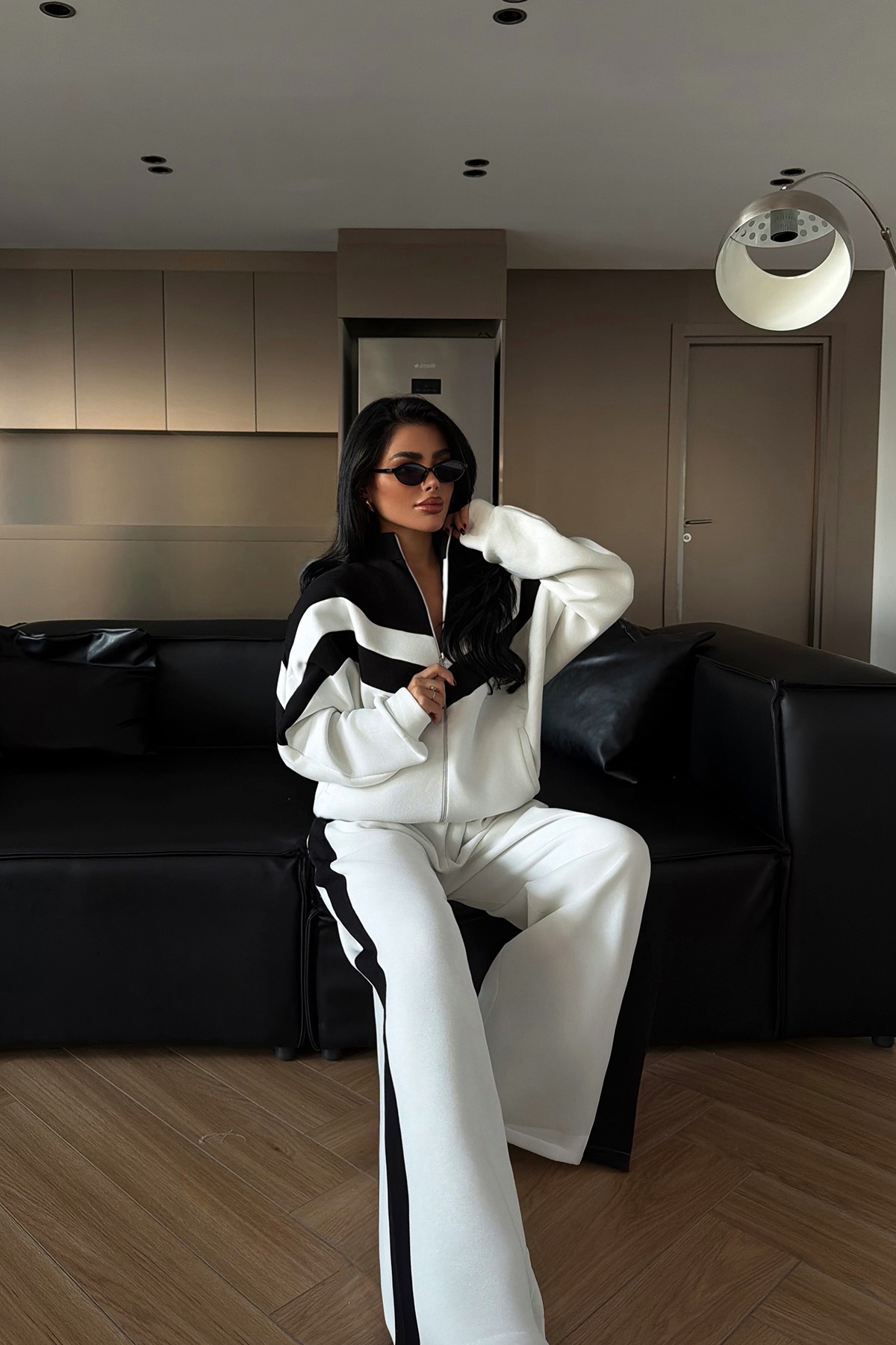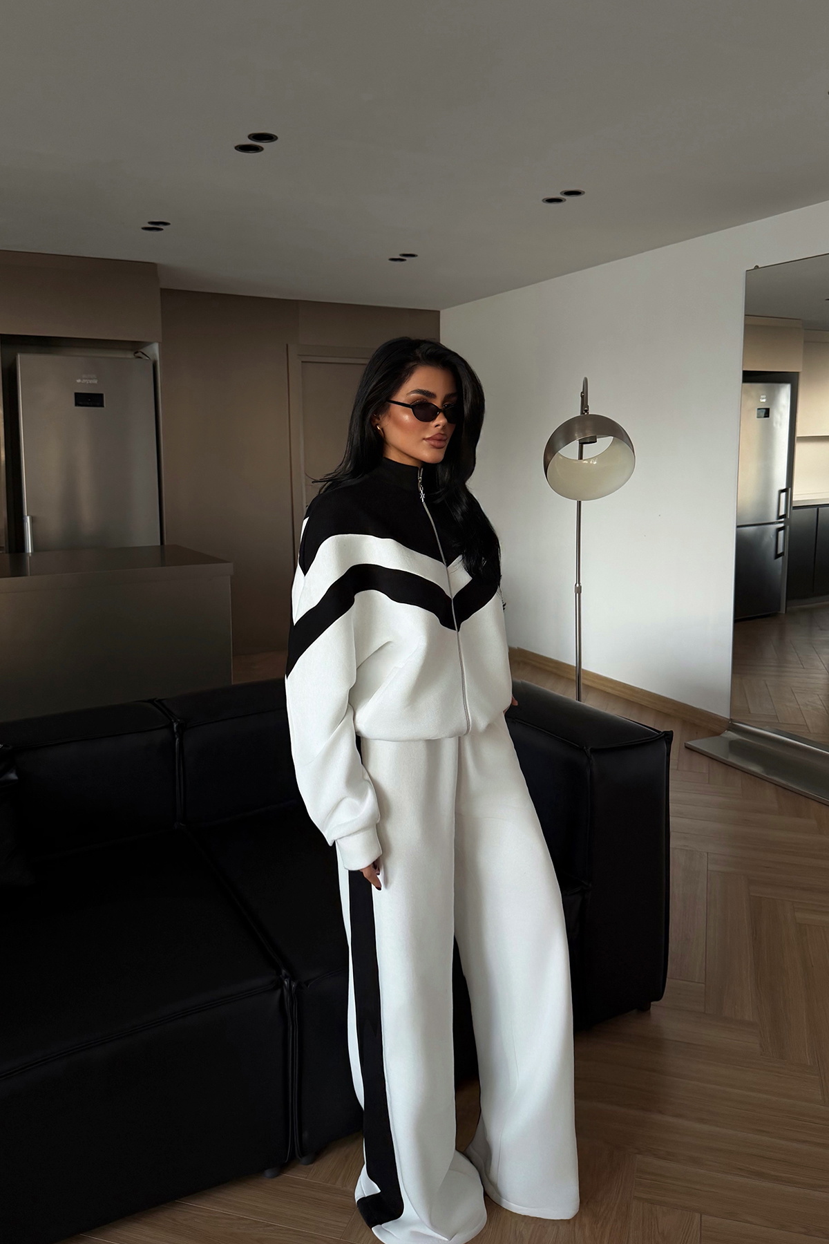 Aralarında zarif kontrast renk şeritleriyle bezenmiş beyaz üst ve alt parçadan oluşan bu takım, sade ama dikkat çekici bir şıklık sunuyor. Üstünde temiz bir kesim, alt kısmında ise esnek bel ve paça detayları rahatlık sağlarken, beyaz tonunun ferahlığı ve çift renk vurgu kombine modern bir hava katıyor.