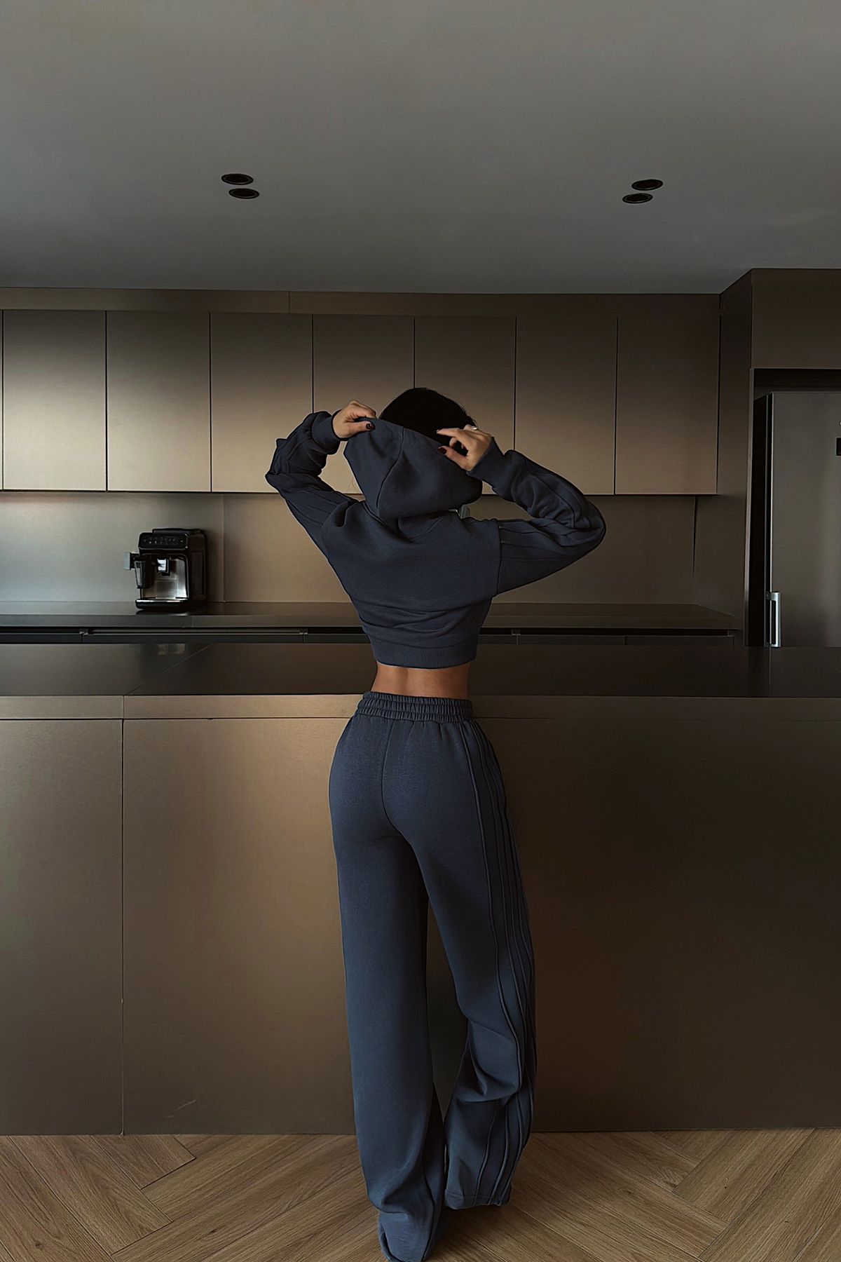 Şık füme tonuyla dikkat çeken bu eşofman takımı; ön kısmında yer alan fermuar detayı sayesinde modern bir sportif şıklık sunar. Üstü rahat kesimle gün boyu kullanım için idealken, alt kısmı bel ve paça detaylarıyla hem konfor hem stil sağlar.