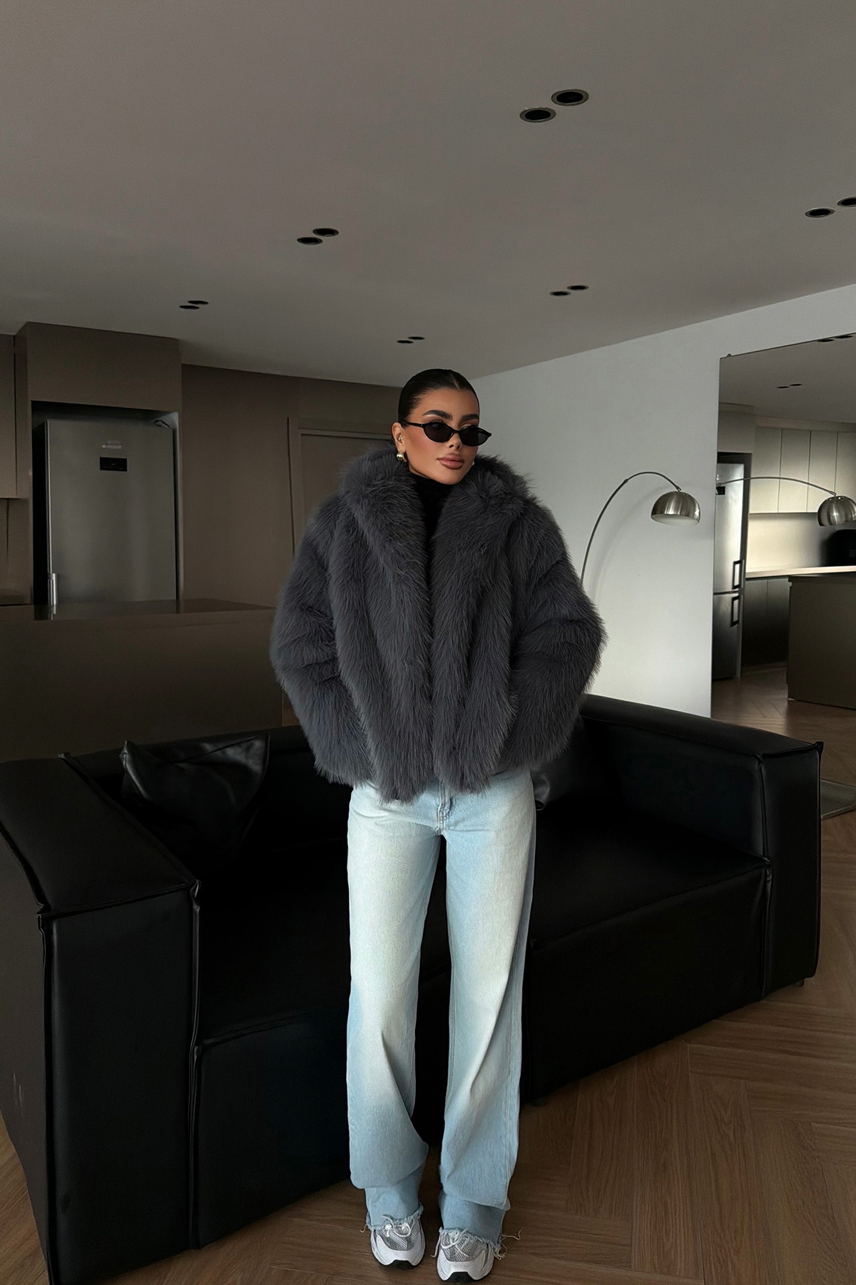 Şık ve dikkat çekici bir dış giyim parçası: Soğuk grinin lüks tonlarından olan füme renk üzerine yerleştirilmiş kürk yaka ve manşetlerde zenginleştirilmiş bu ceket, klasik kesimiyle rahat bir şekilde şehir stiline adapte oluyor. İç astarlı ve üst düzey duruşuyla soğuk havalarda şıklığınızı korumanız için ideal.
