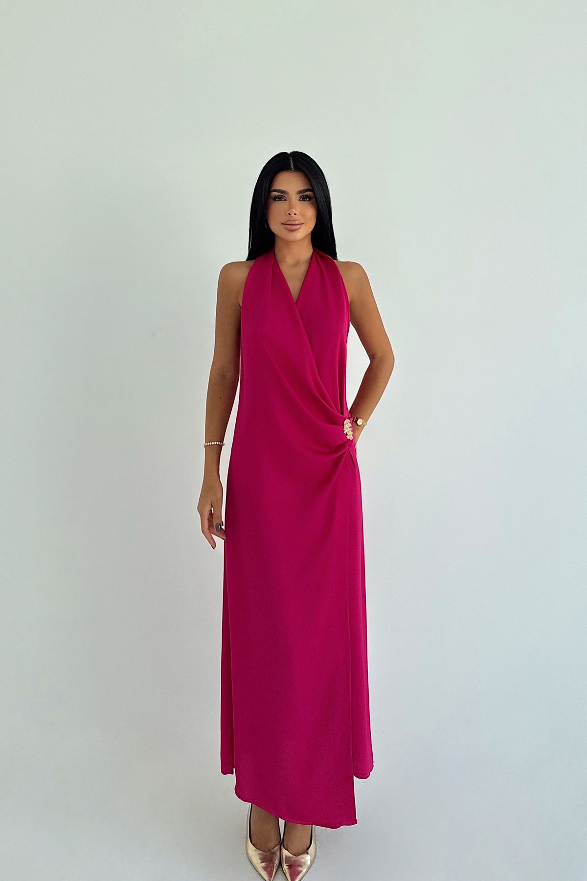 Kruvaze kesimi, iddialı yırtmacı ve boyundan bağlamalı V yakasıyla zarafeti yeniden tanımlayan bu fuşya elbise, belindeki modern aksesuar detayıyla ışıltılı bir dokunuş kazanır. Akıcı ve şık kumaş yapısı sayesinde her adımınızda sofistike bir duruş sergilerken, dayanıklı kumaşıyla uzun süreli bir kullanım vadeder. Özel davetler, gala geceleri veya kokteyl partileri için mükemmel bir seçenek olan bu tasarım, tüm dikkatleri üzerinize çekerek unutulmaz bir stil deneyimi sunar.