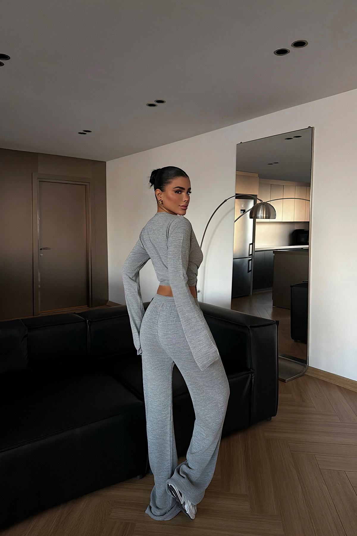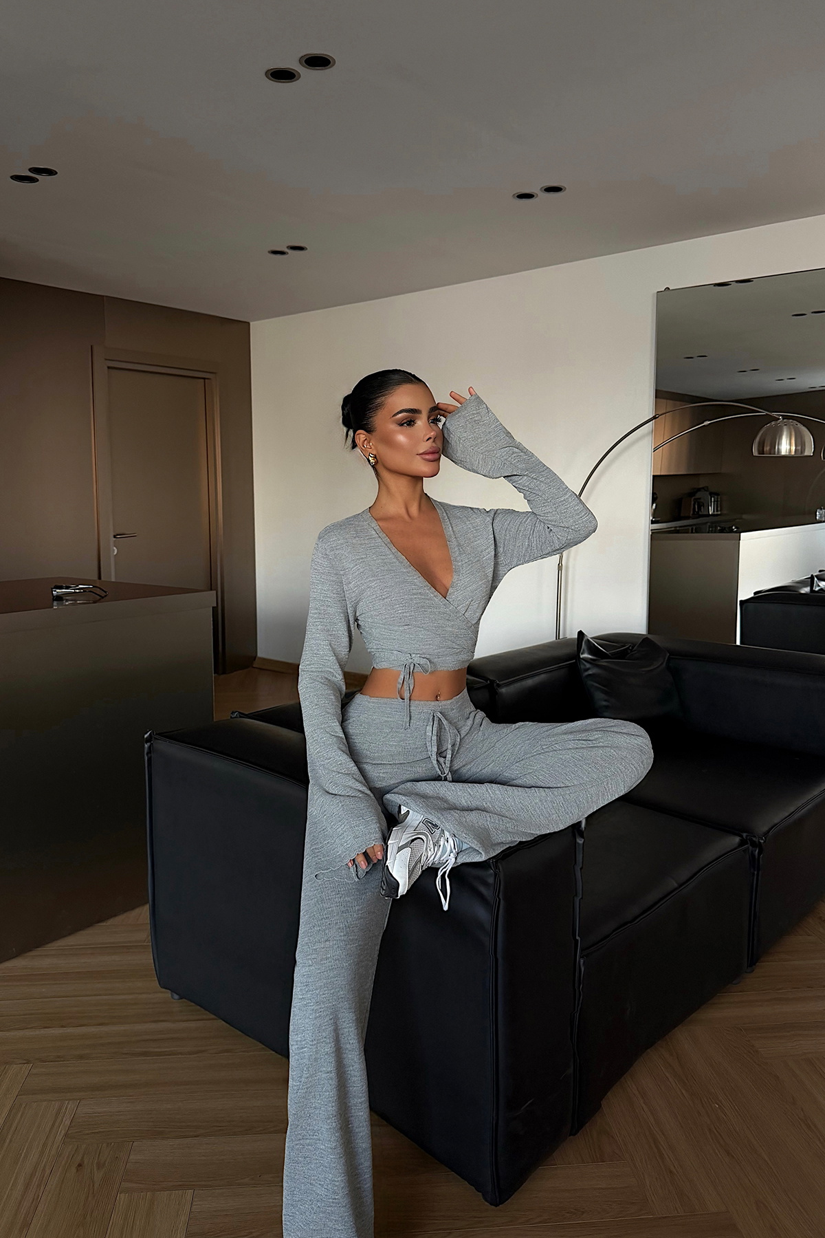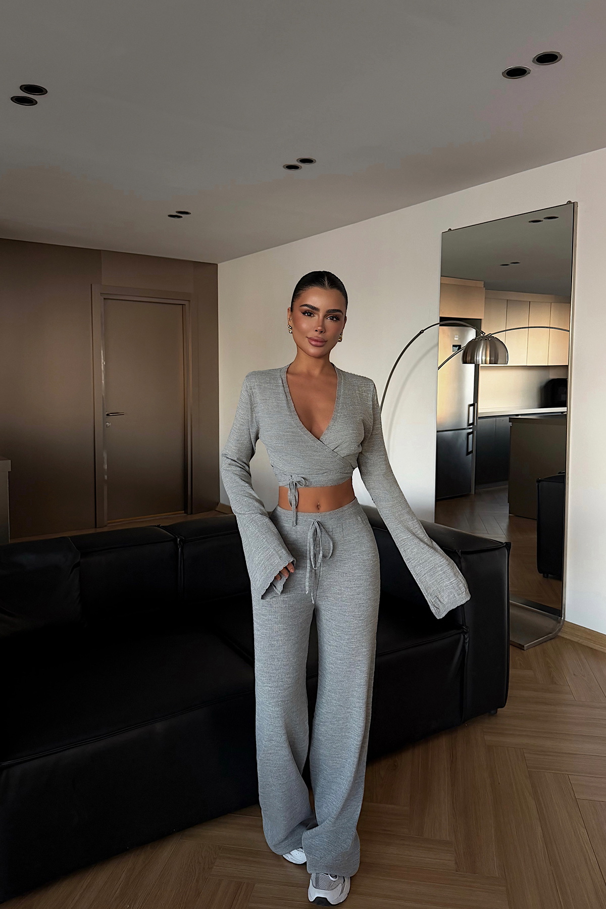 Üst ve alt parçadan oluşan bu triko takım, yumuşak dokusu ve vücuda uyum sağlayan kalıbıyla gün boyu konfor sunar. Üst parçada önden bağlamalı tasarım modern ve feminen bir görünüm kazandırırken, alt parça rahat kesimiyle hareket özgürlüğü sağlar