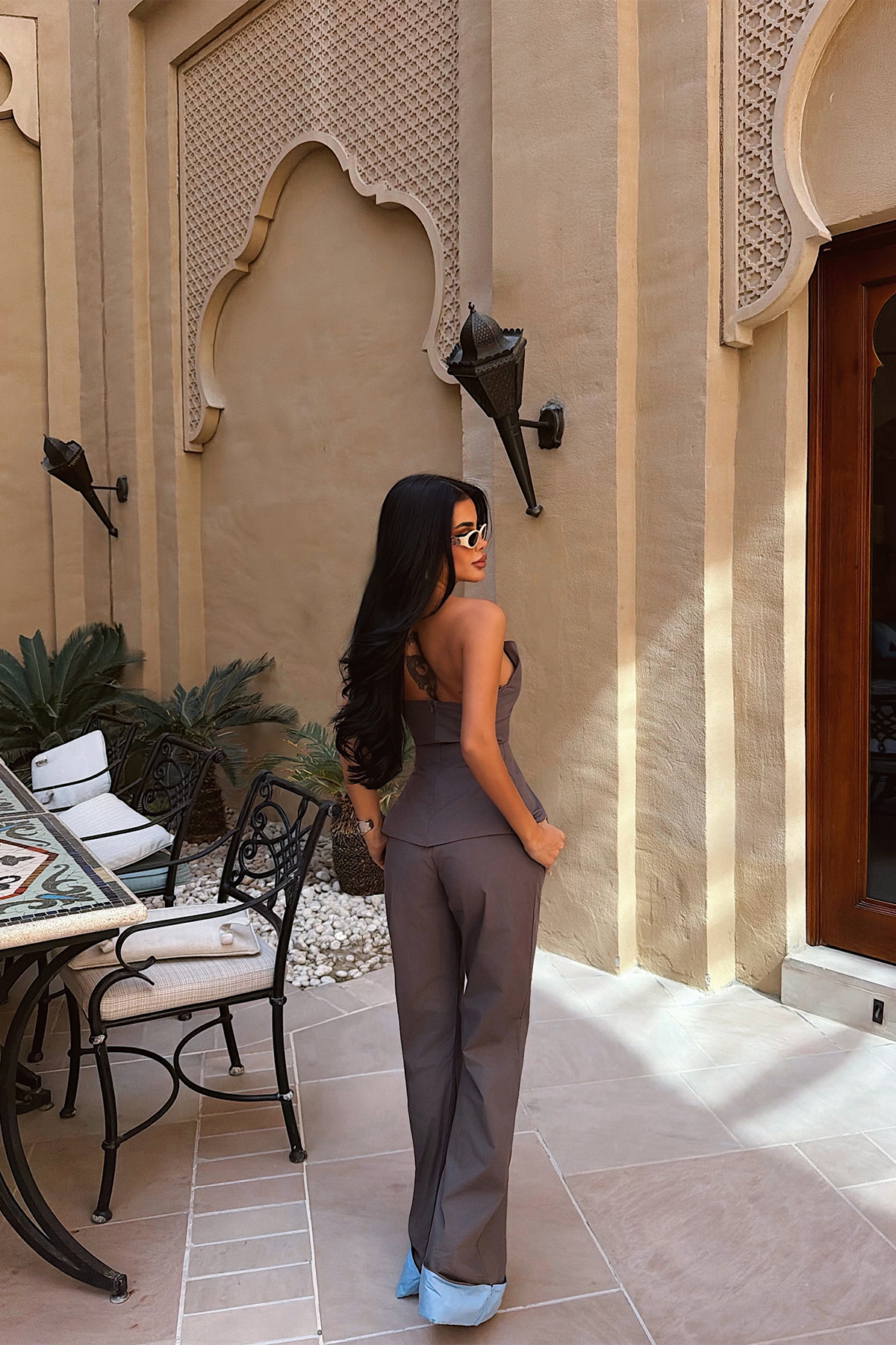 Kontrast renk detaylarıyla tasarlanan bu iki parçalı takım, modern ve iddialı bir stil sunar. Straplez büstiyer formu omuz hattını zarif şekilde vurgularken, ön kısmındaki kesim detayı tasarıma hareket kazandırır. Yüksek bel geniş paça pantolon ise rahat kalıbıyla dengeli ve uzun bir siluet oluşturur.