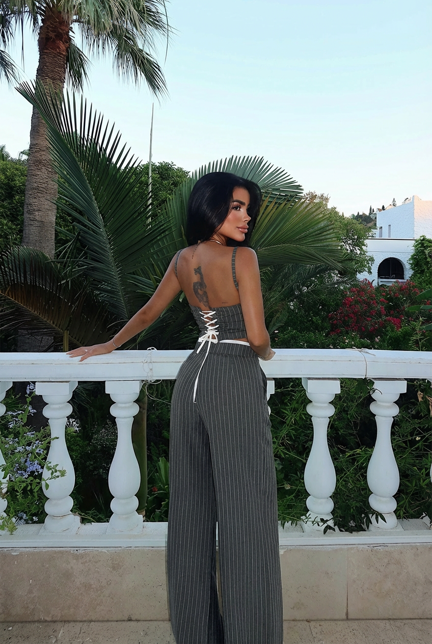 Askılı üst ve uyumlu pantolondan oluşan çizgili takım, vücuda oturan formu ve zarif çizgileriyle modern bir siluet sunar. Sade detayları ve akıcı kesimi sayesinde günlük şehir stilinden şık kombinlere kadar çok yönlü kullanım sağlar.