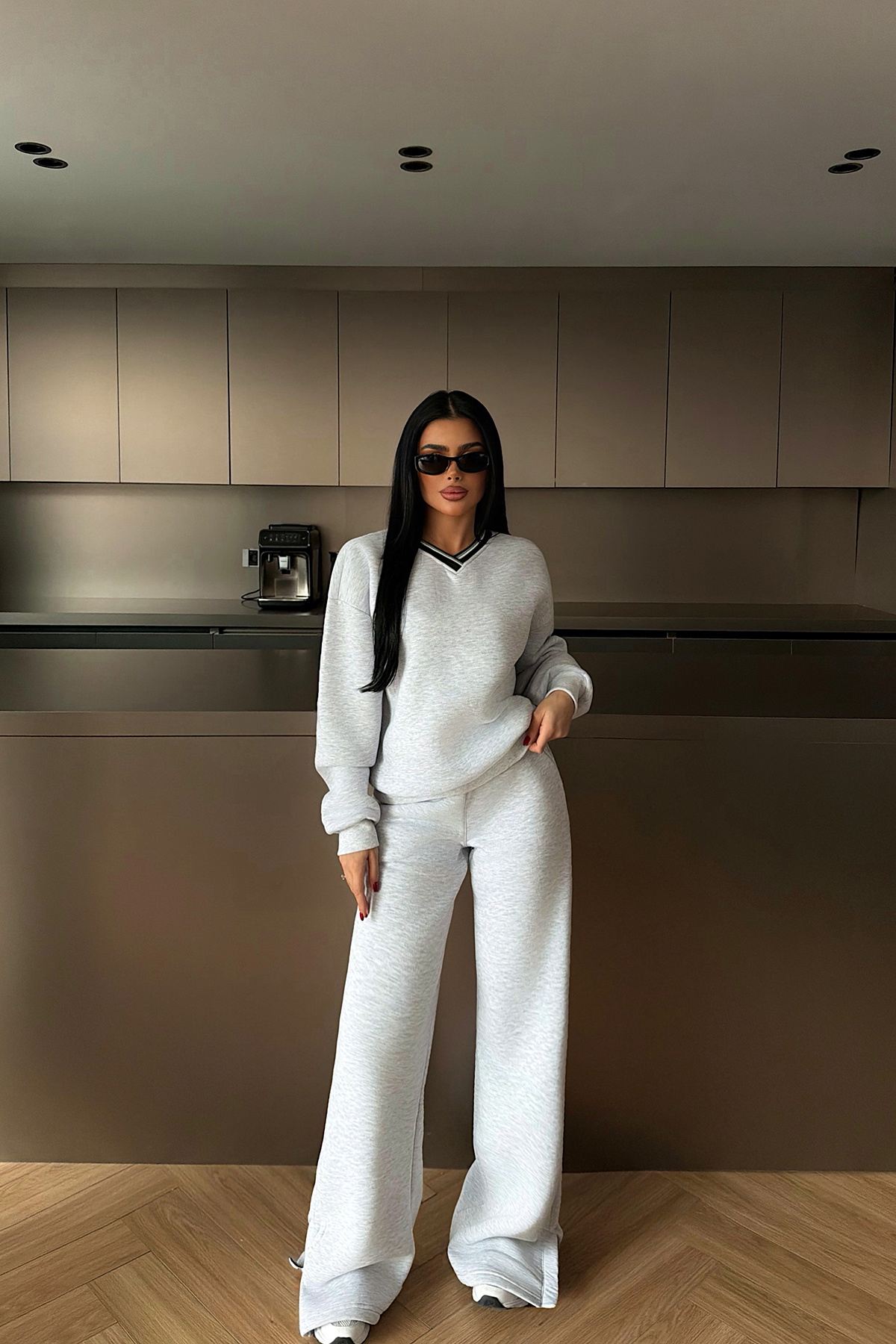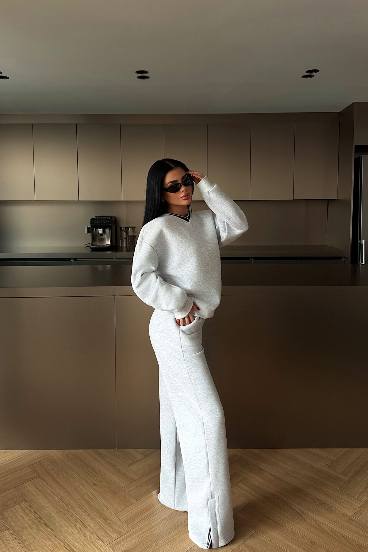 Yumuşak dokulu kumaşı ve sade tasarımıyla konforu ön plana çıkarır. Üst parça, minimal V yaka formu ve rahat kesimiyle doğal bir duruş sergiler. Alt parça ise geniş paça yapısı ve akıcı görünümüyle takımın bütünlüğünü tamamlar. Esnek bel detayı, temiz dikişleri ve homojen gri tonu sayesinde takım hem düzenli hem modern bir siluet sunar.