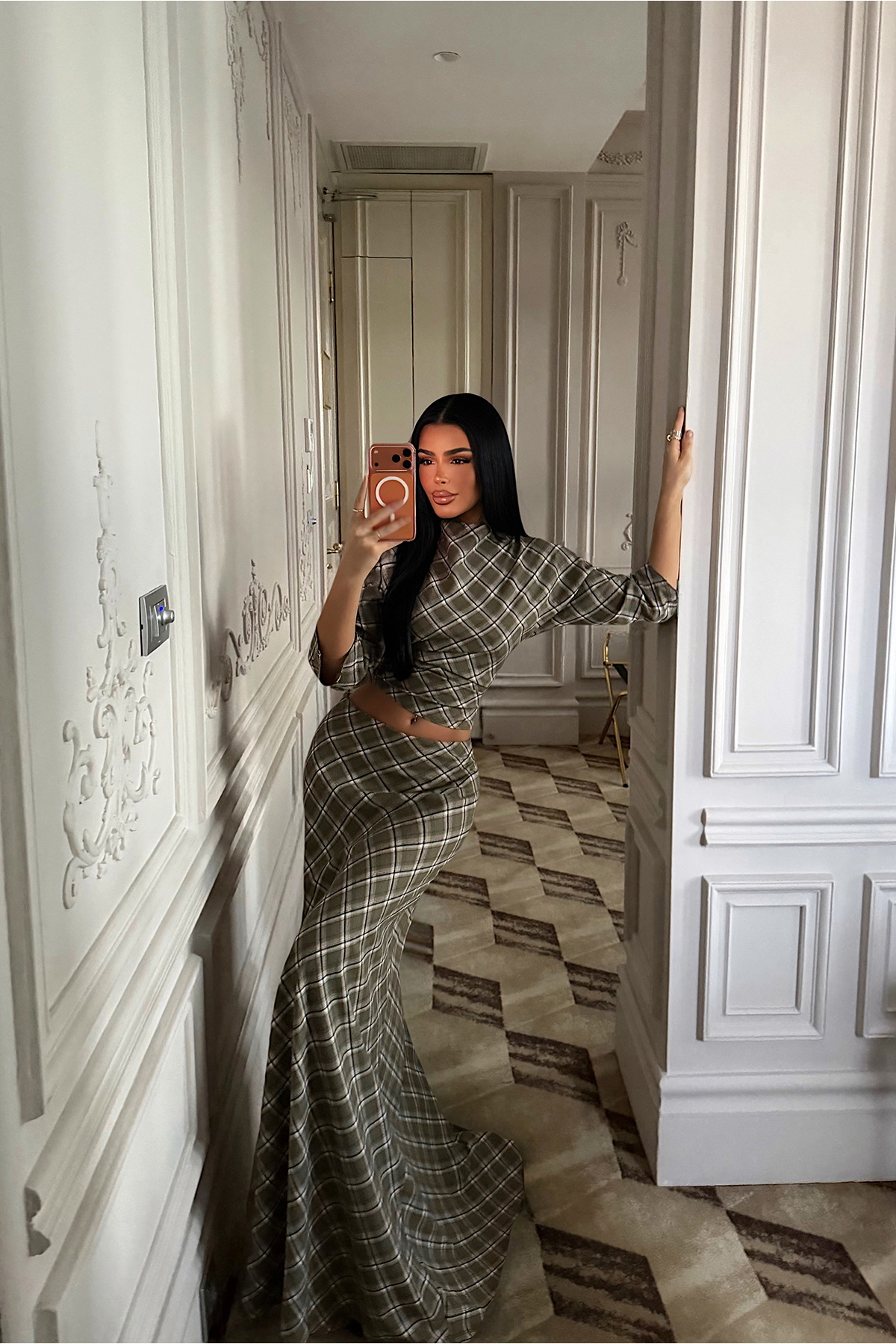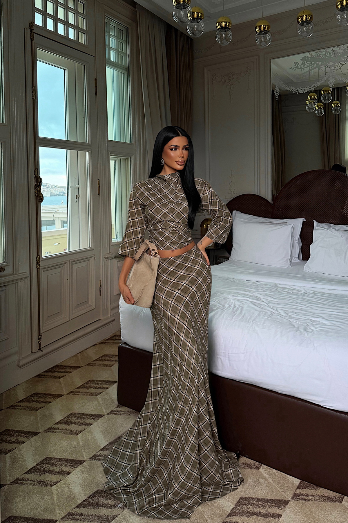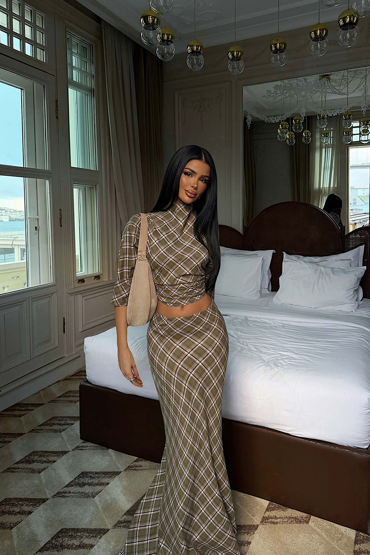 Şık desenli tasarımıyla dikkat çeken takım, crop üst ve uzun etekten oluşan modern bir görünüm sunar. Vücuda uyum sağlayan kalıbı feminen bir duruş kazandırırken, desenli kumaşı kombinlere zarif bir hava katar. Günlük şıklık ve özel davet kombinleri için ideal bir takımdır.
